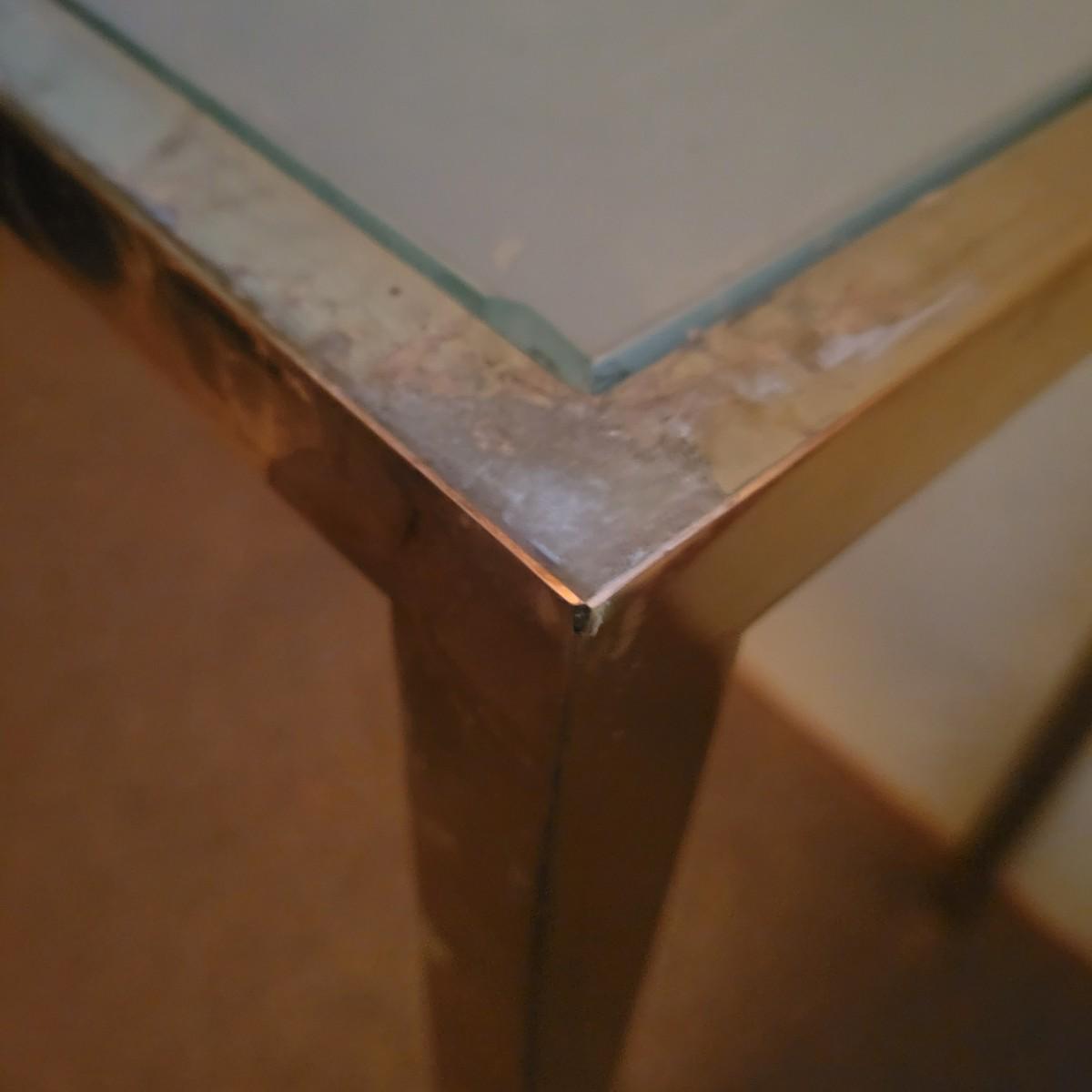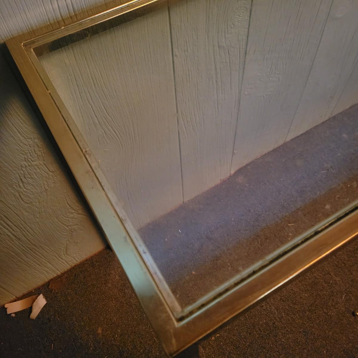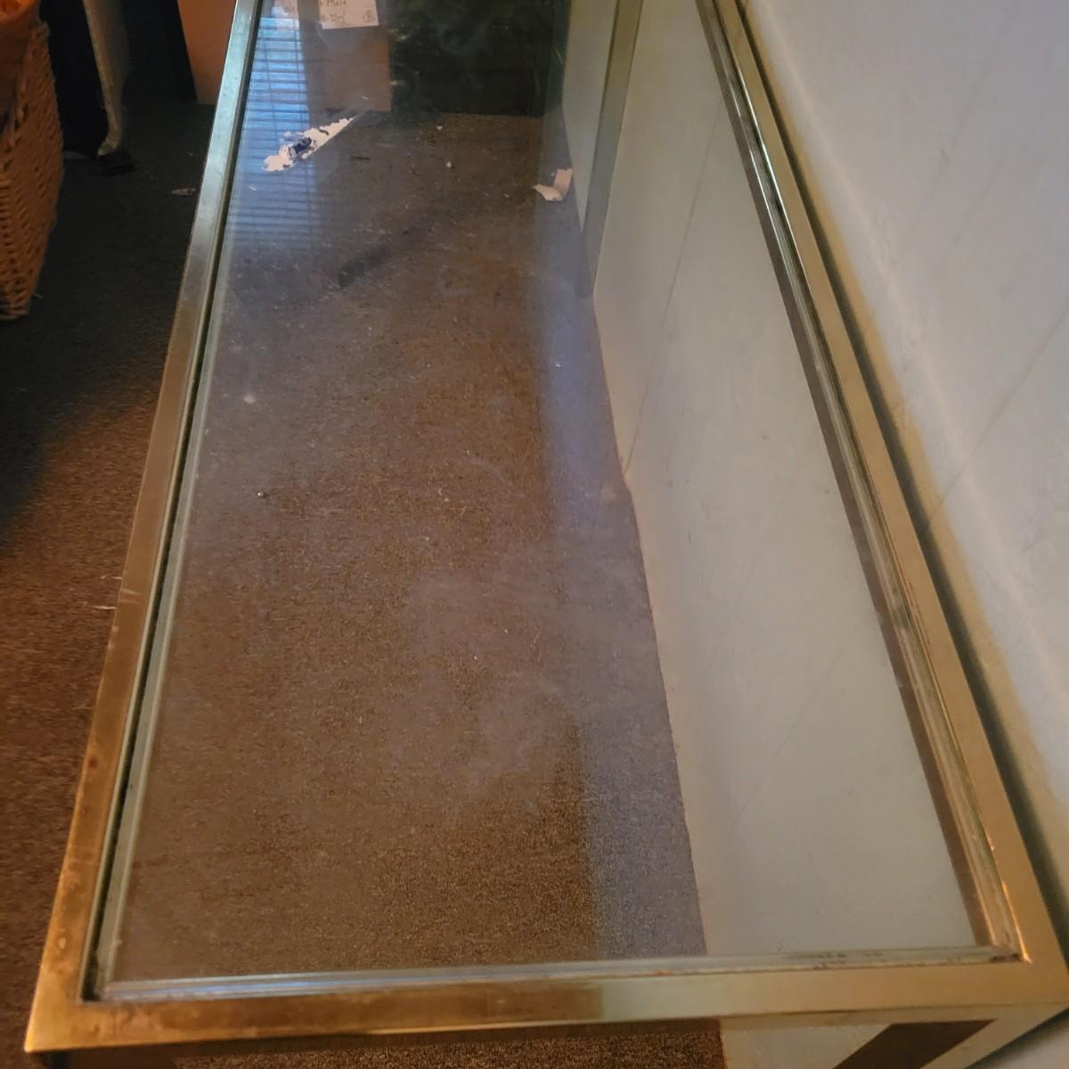 A long table with a metal frame and tempered glass top in fair condition. The top has a white sticker mark which should remove easily. Metal frame hase some peeling and scratches as does the glass. Table measures approximately 48" x 16" x 28" Local pickup only