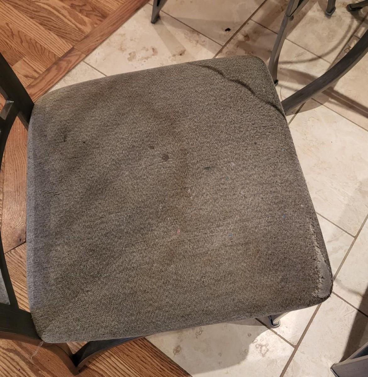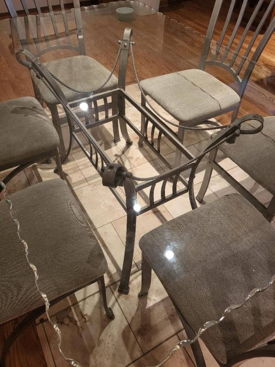 Nice table with scalloped edge. Matching baker's rack also in this auction. Chair cushions needs to be cleaned. Cat-friendly home.