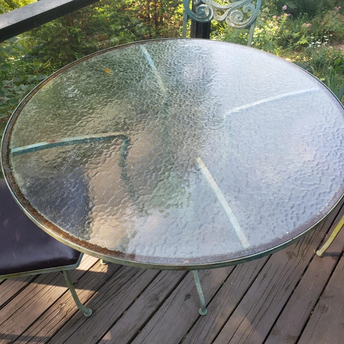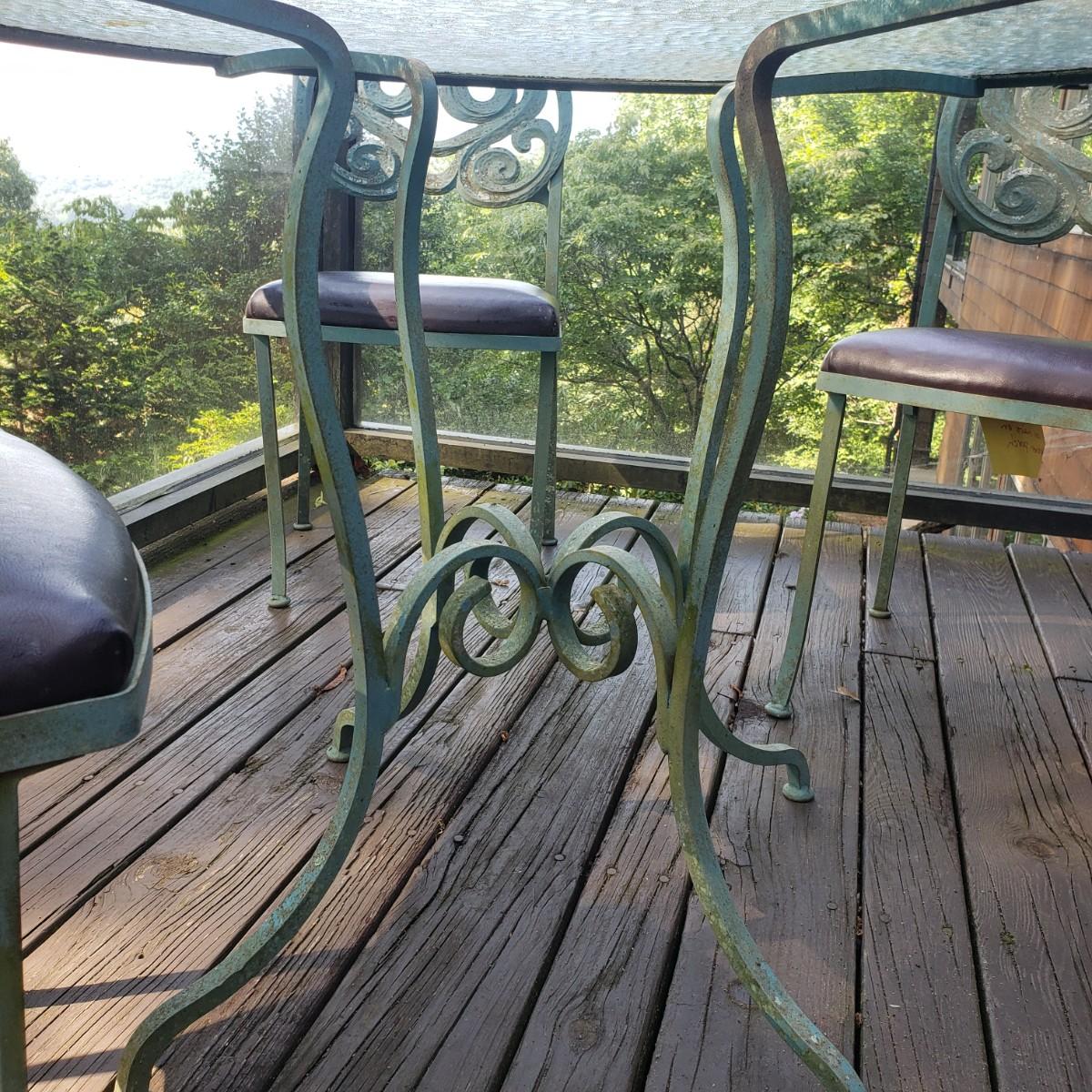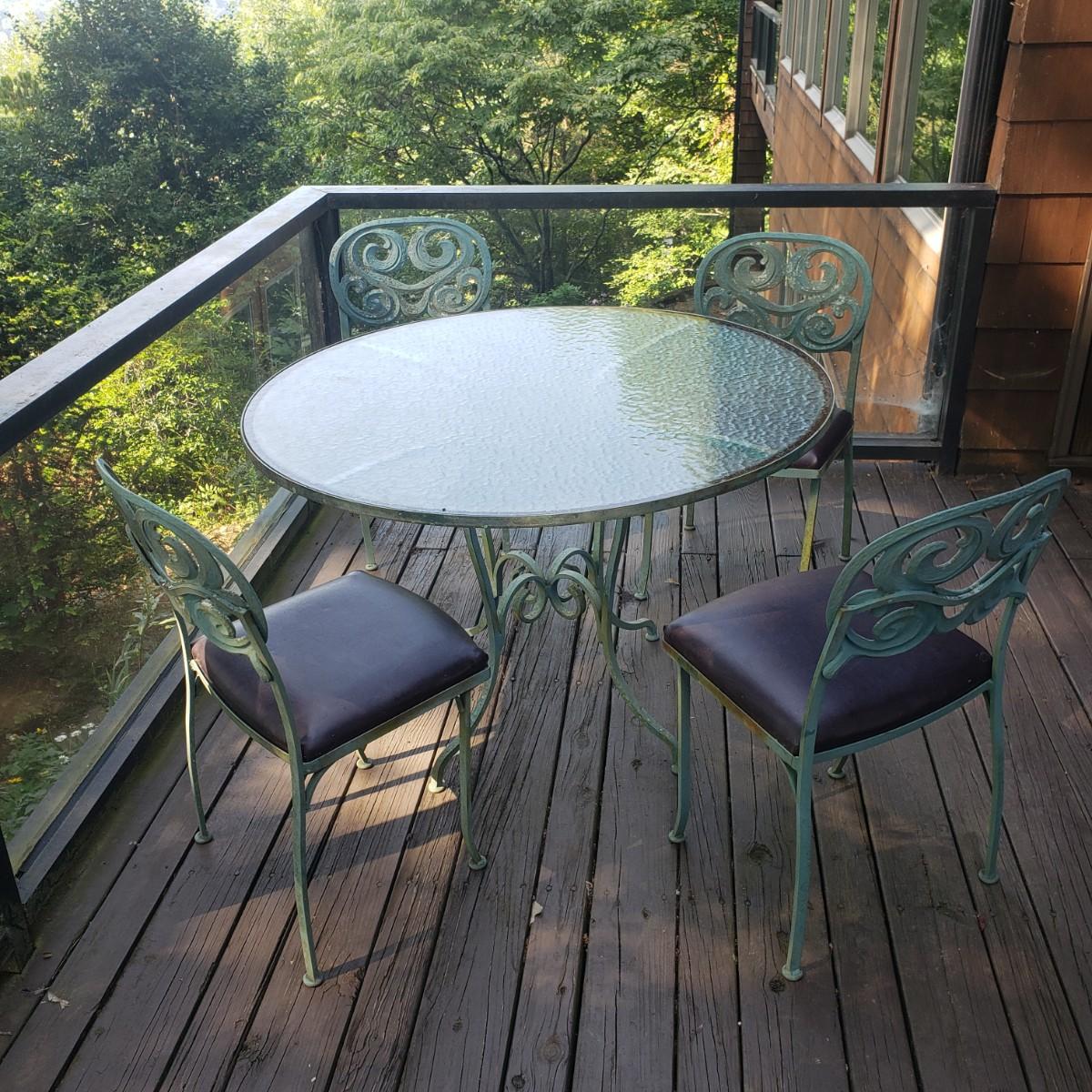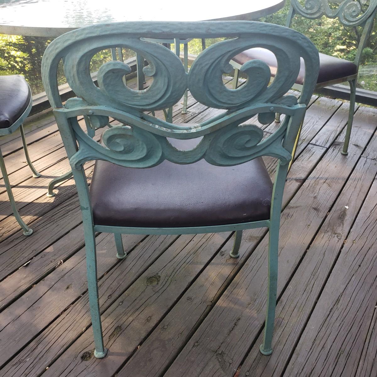 This outdoor metal base table with a glass top measures 41" x 28"H. The matching four chairs measure 16" x 15" x 42"H. The seat height is 18". The metal on the table and chairs is a light greenish color. The chairs have removable seat cushions that are a brown vinyl material. The table top is glass that has some wear on the top. This piece could use a fresh power washing.