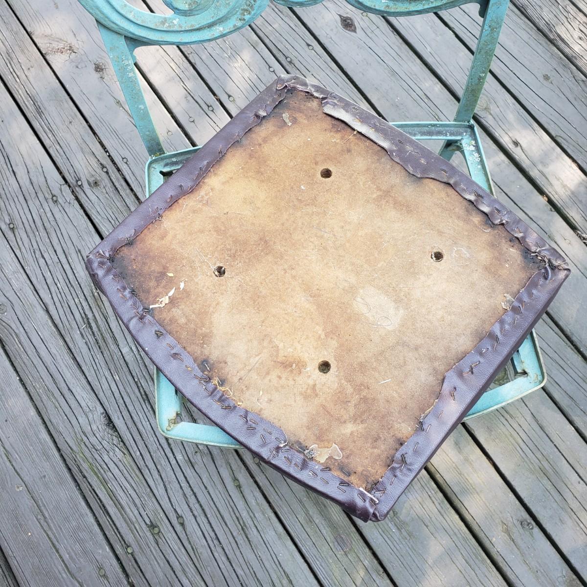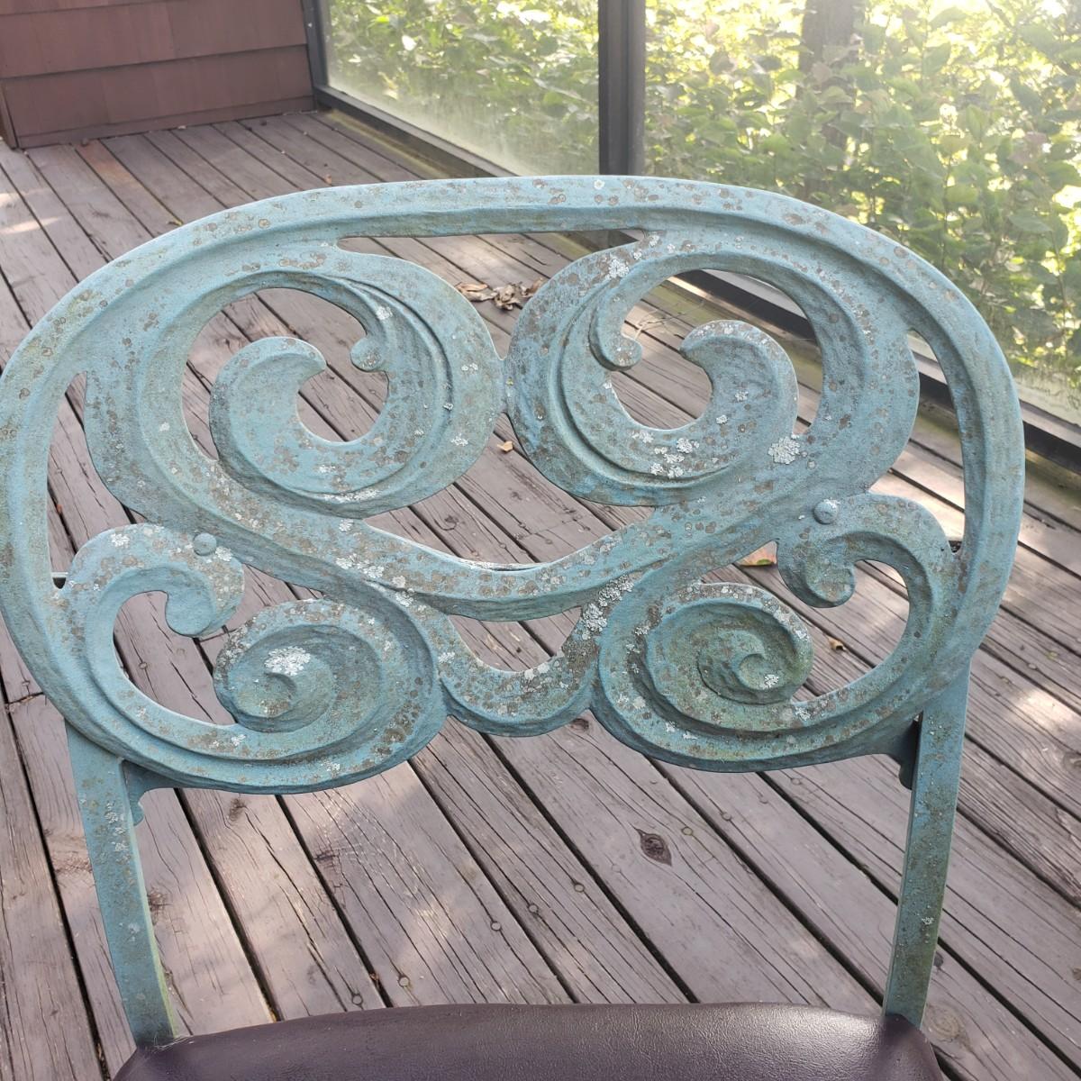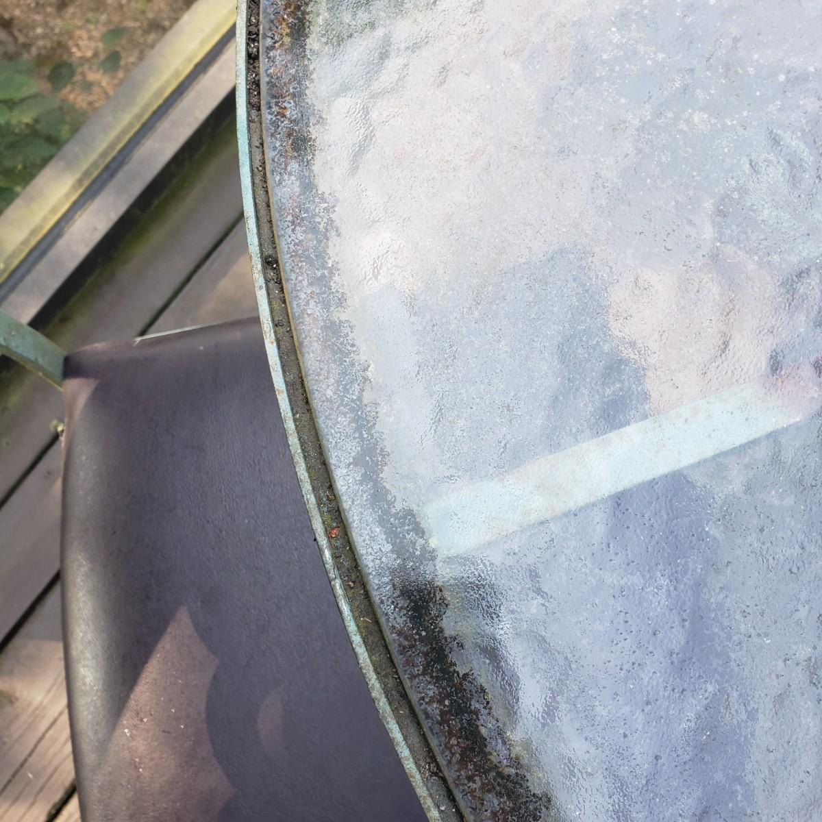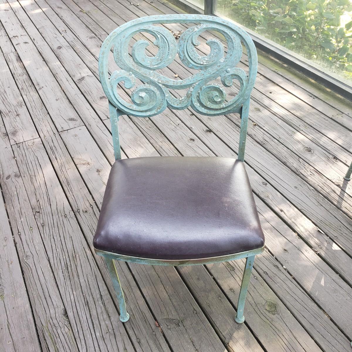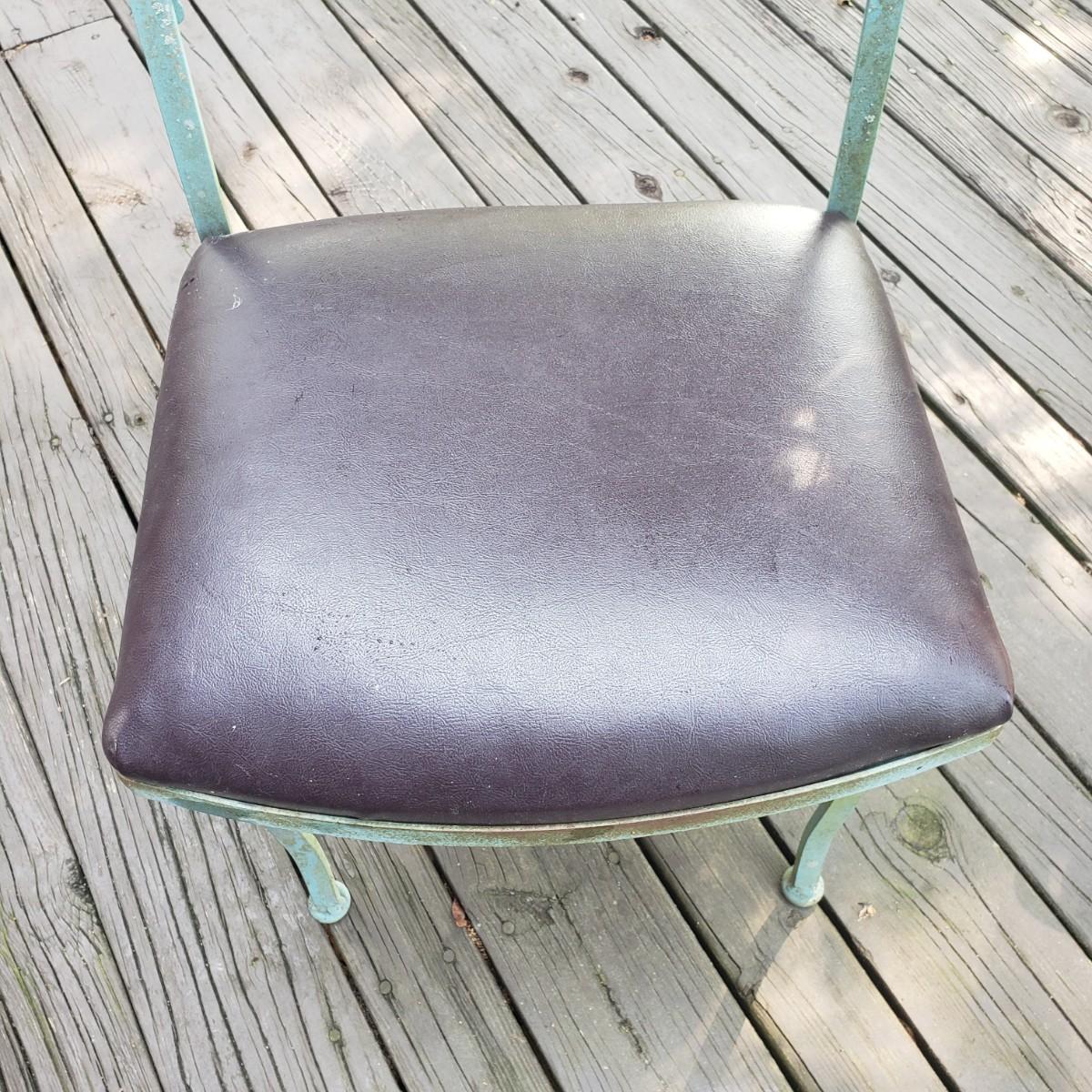 This outdoor metal base table with a glass top measures 41" x 28"H. The matching four chairs measure 16" x 15" x 42"H. The seat height is 18". The metal on the table and chairs is a light greenish color. The chairs have removable seat cushions that are a brown vinyl material. The table top is glass that has some wear on the top. This piece could use a fresh power washing.