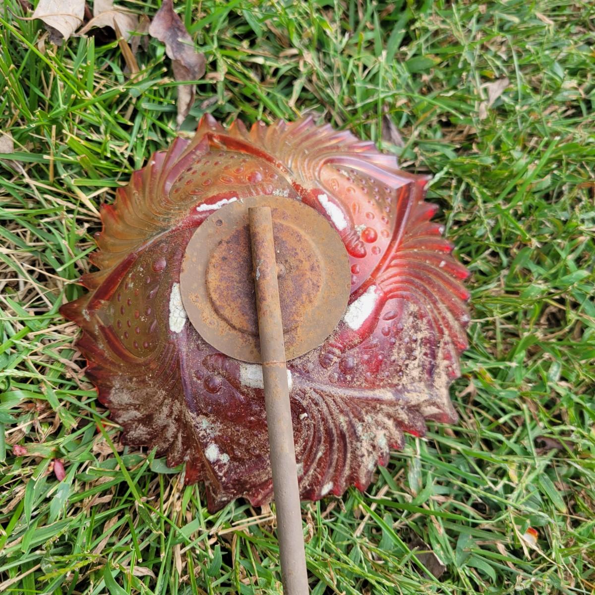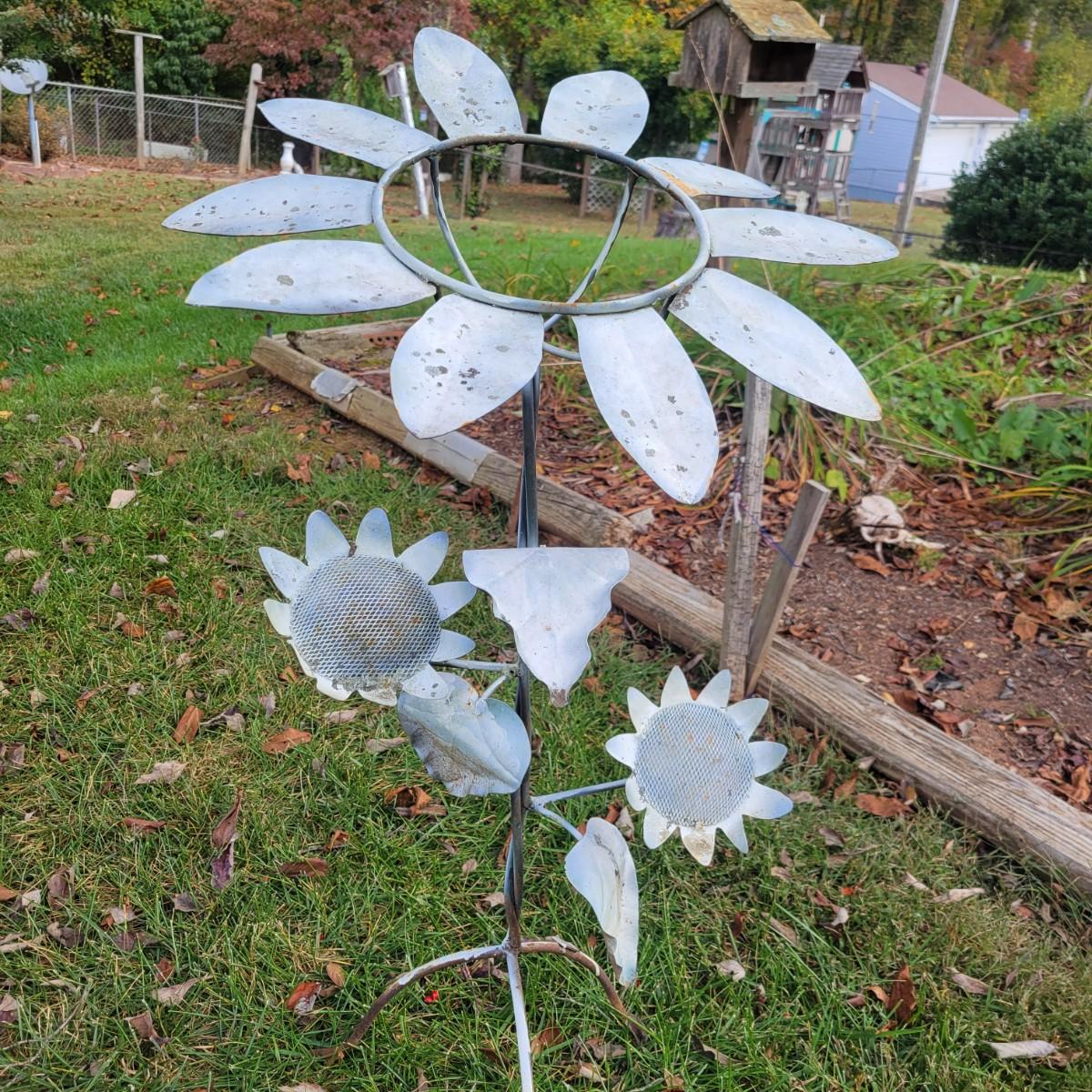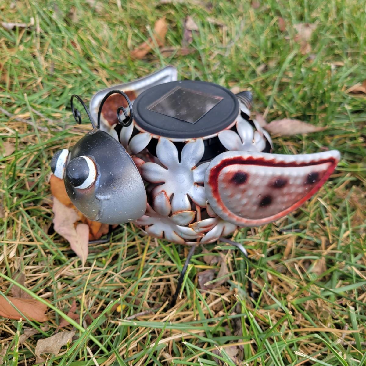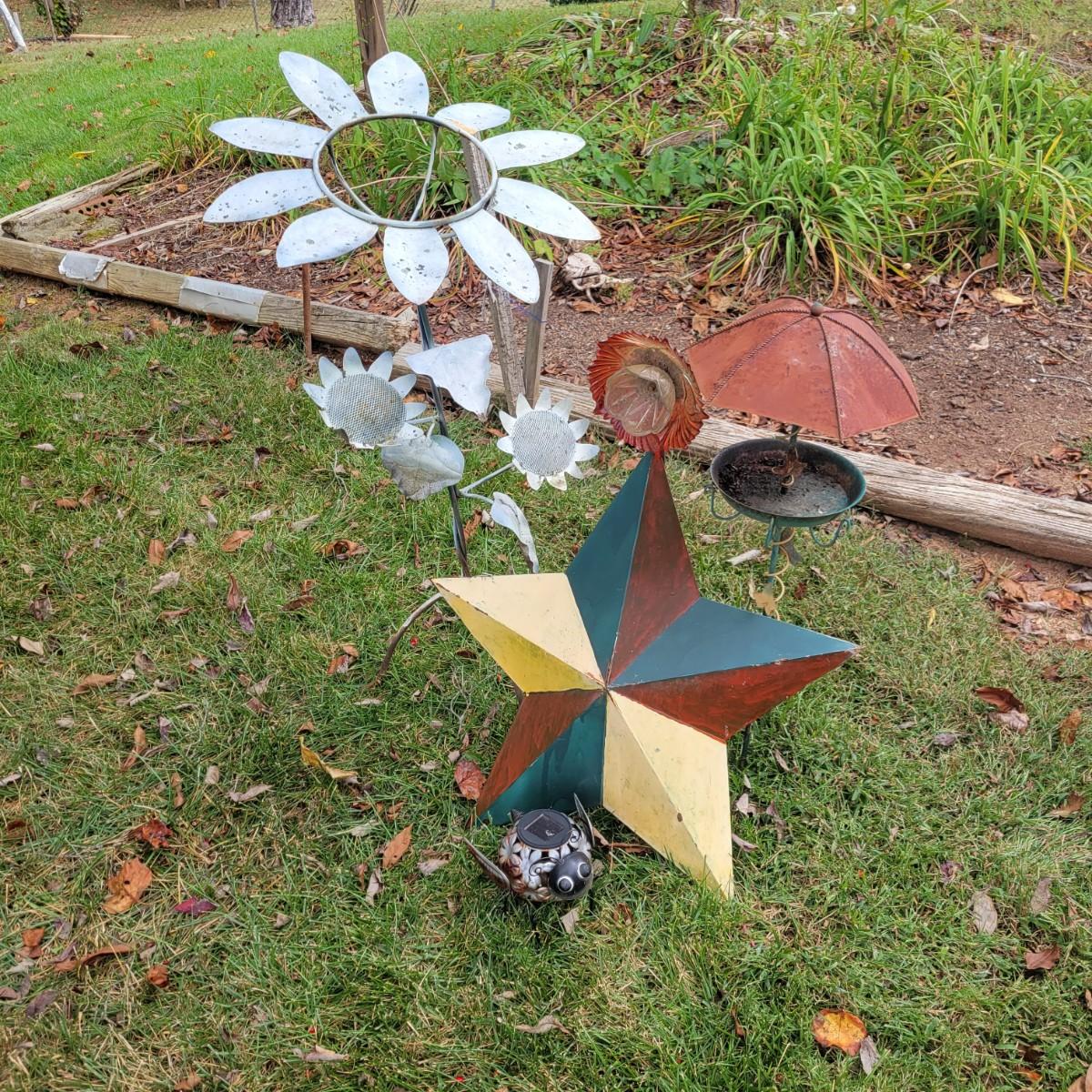 An assortment of five pieces of yard art. Included is a small metal lady bug solar light that did not light up when the photo cell was covered, a metal multicolored star, a metal bird feeder with ivy and an umbrella, a glass flower on a metal pole and a large cluster of metal flower. The largest metal flower cluster measures approximately 19"D x 37"H. Local pickup only