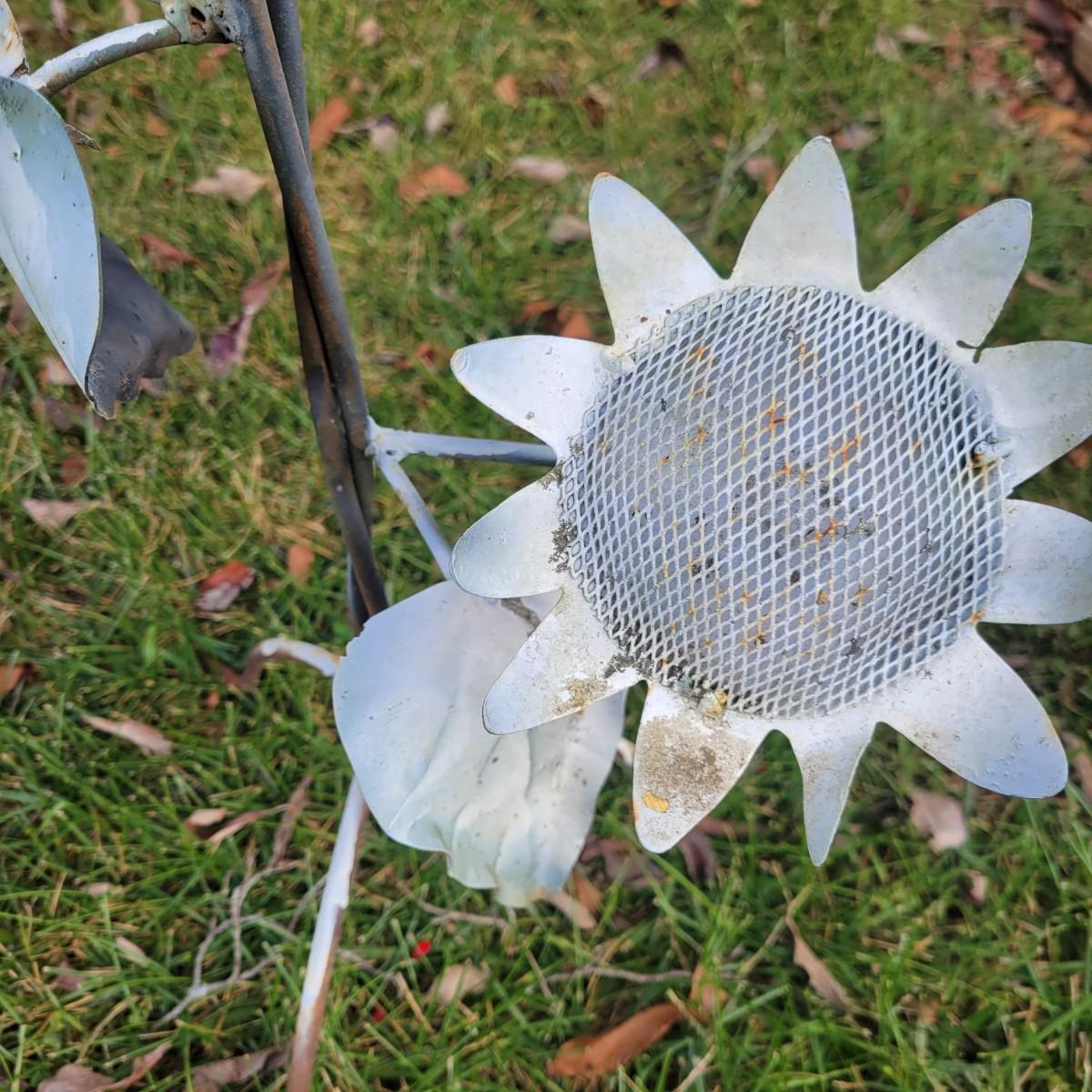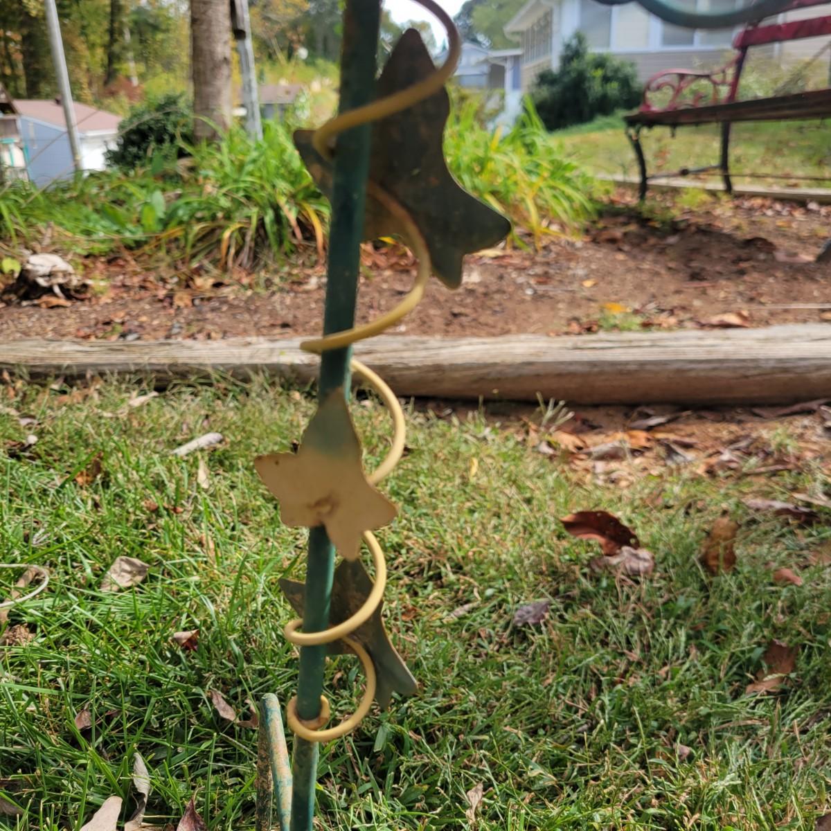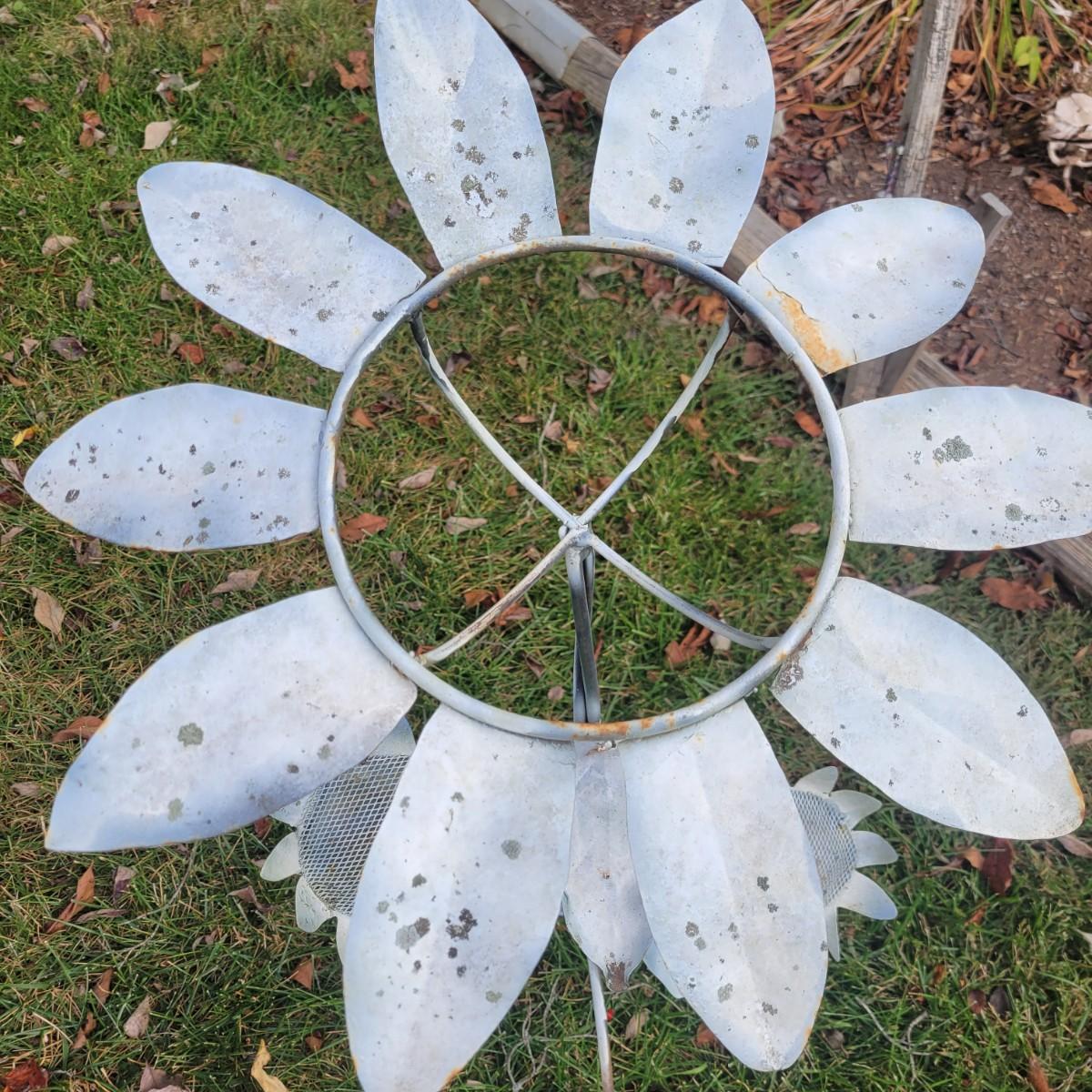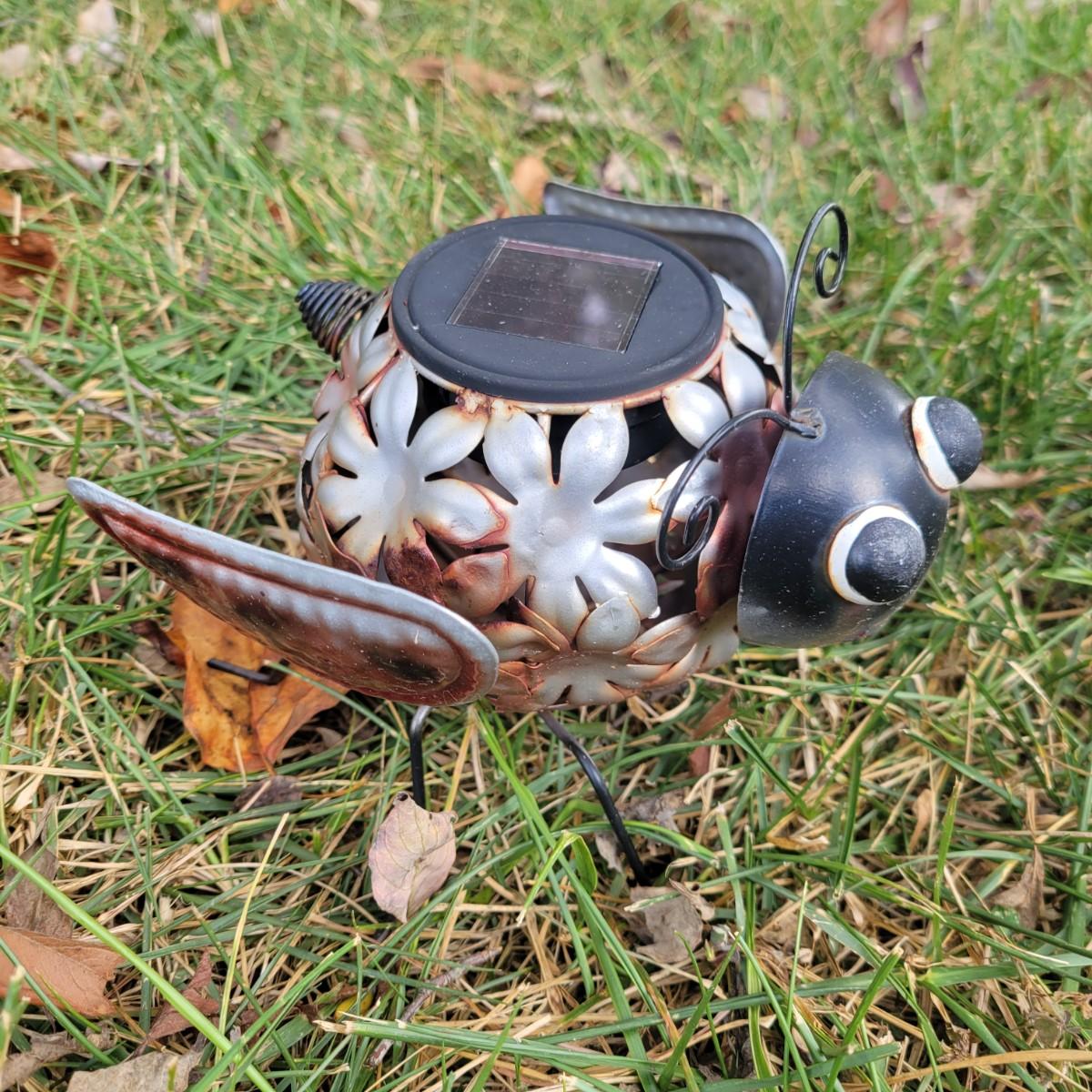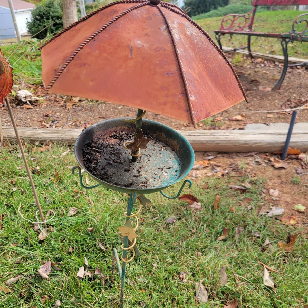 An assortment of five pieces of yard art. Included is a small metal lady bug solar light that did not light up when the photo cell was covered, a metal multicolored star, a metal bird feeder with ivy and an umbrella, a glass flower on a metal pole and a large cluster of metal flower. The largest metal flower cluster measures approximately 19"D x 37"H. Local pickup only