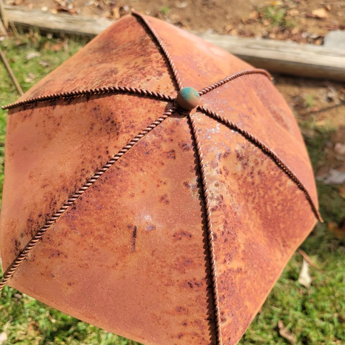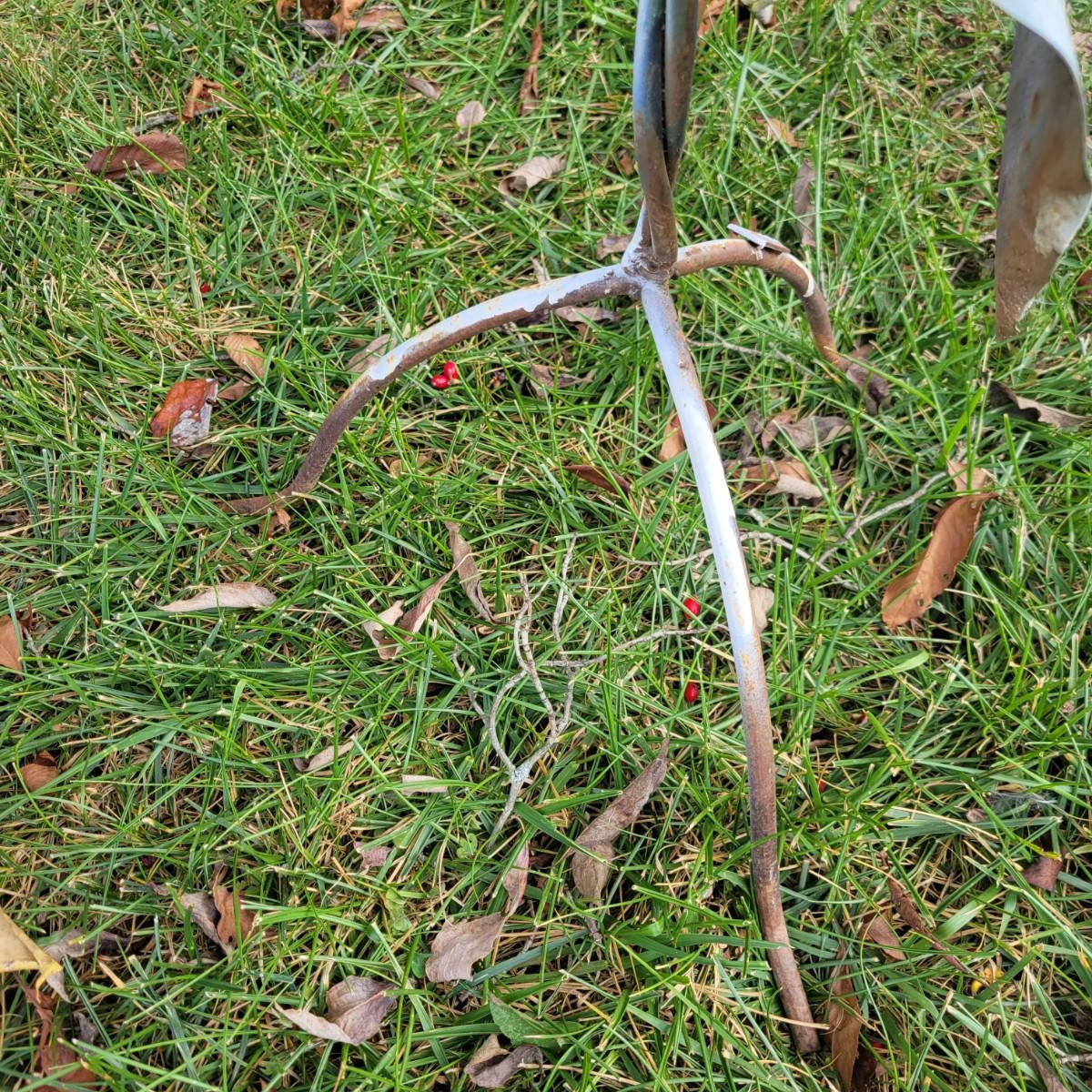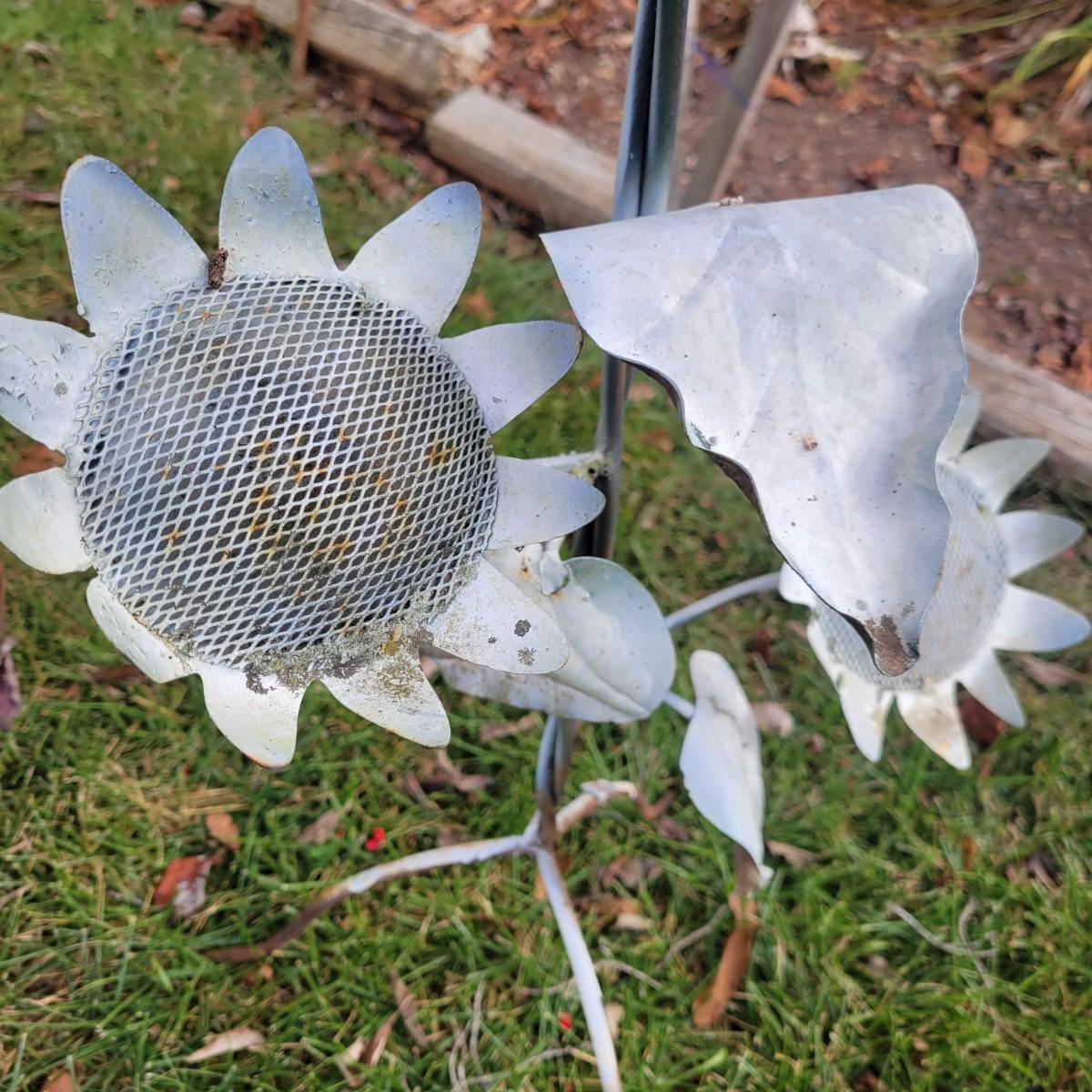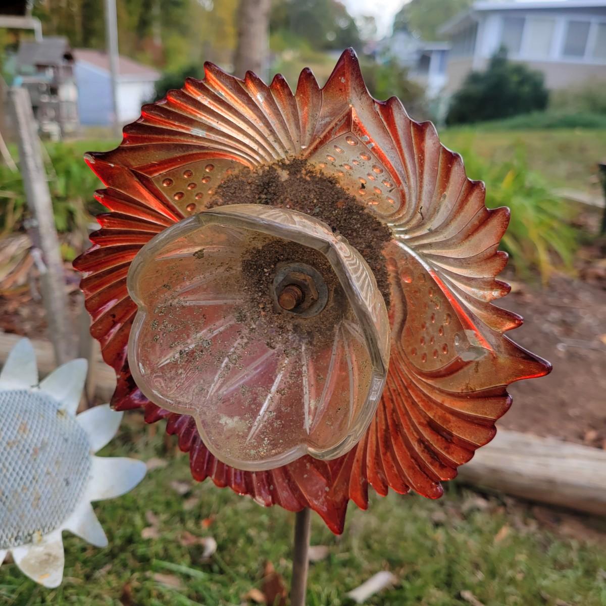 An assortment of five pieces of yard art. Included is a small metal lady bug solar light that did not light up when the photo cell was covered, a metal multicolored star, a metal bird feeder with ivy and an umbrella, a glass flower on a metal pole and a large cluster of metal flower. The largest metal flower cluster measures approximately 19"D x 37"H. Local pickup only