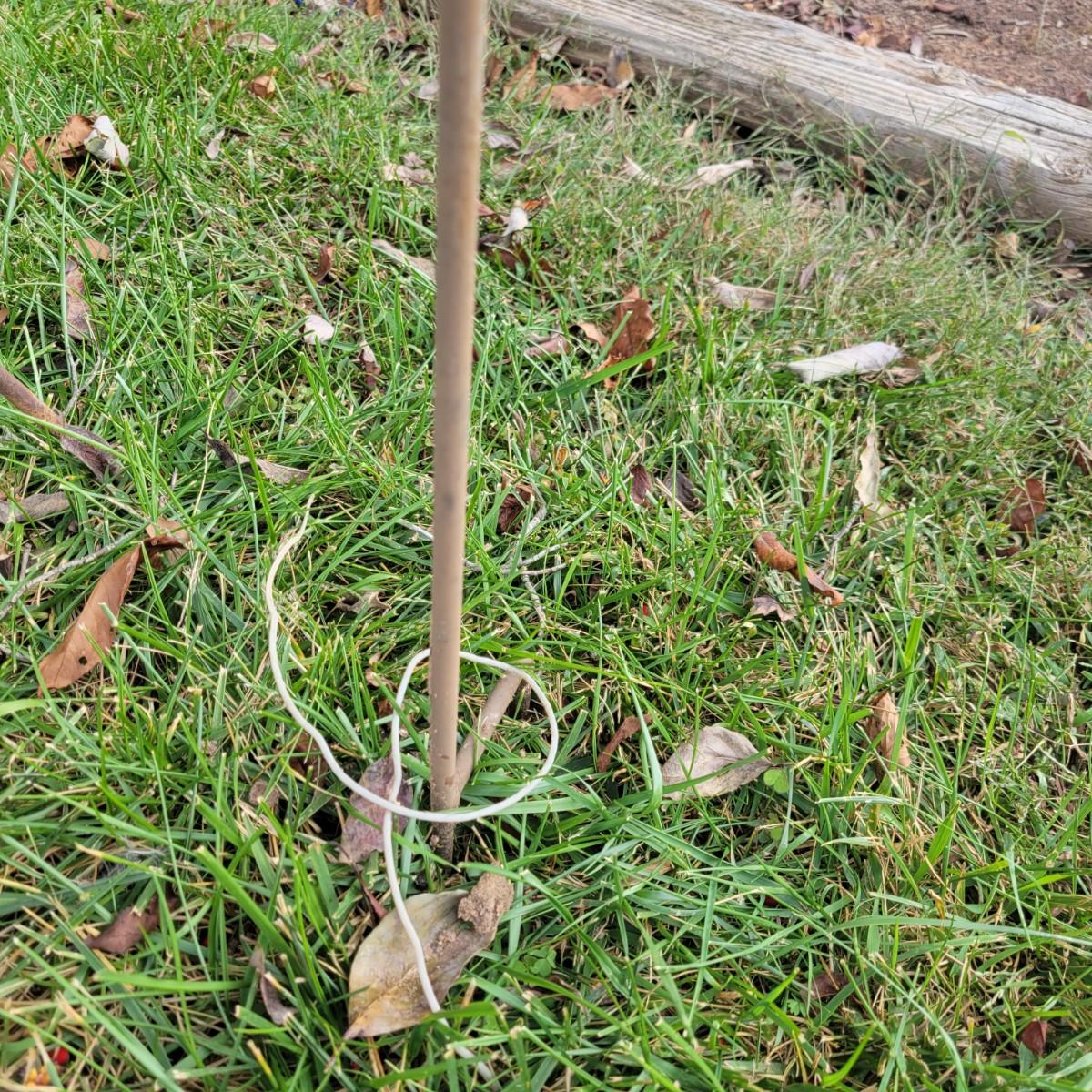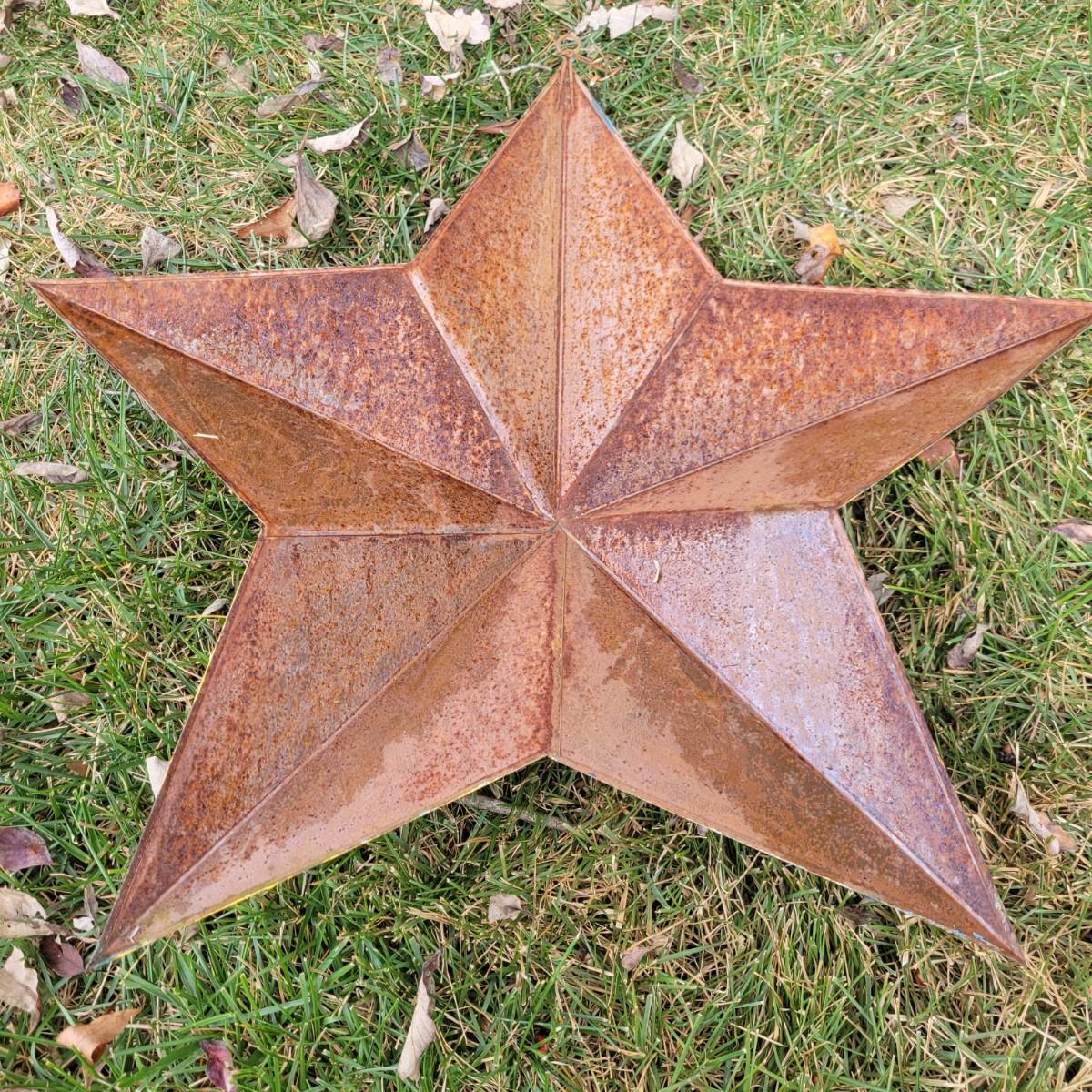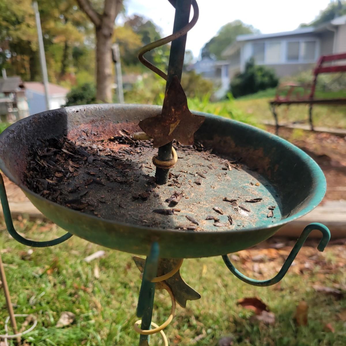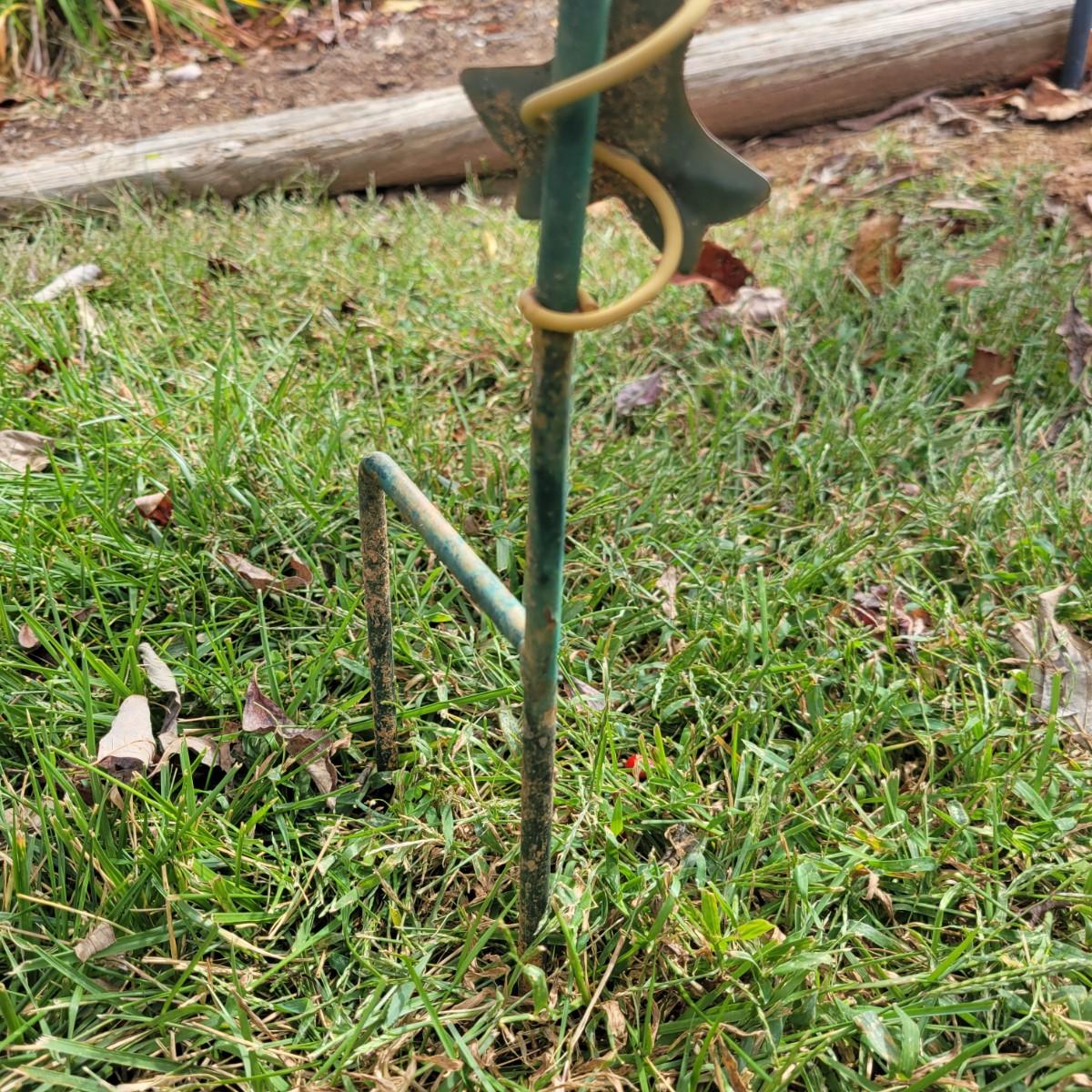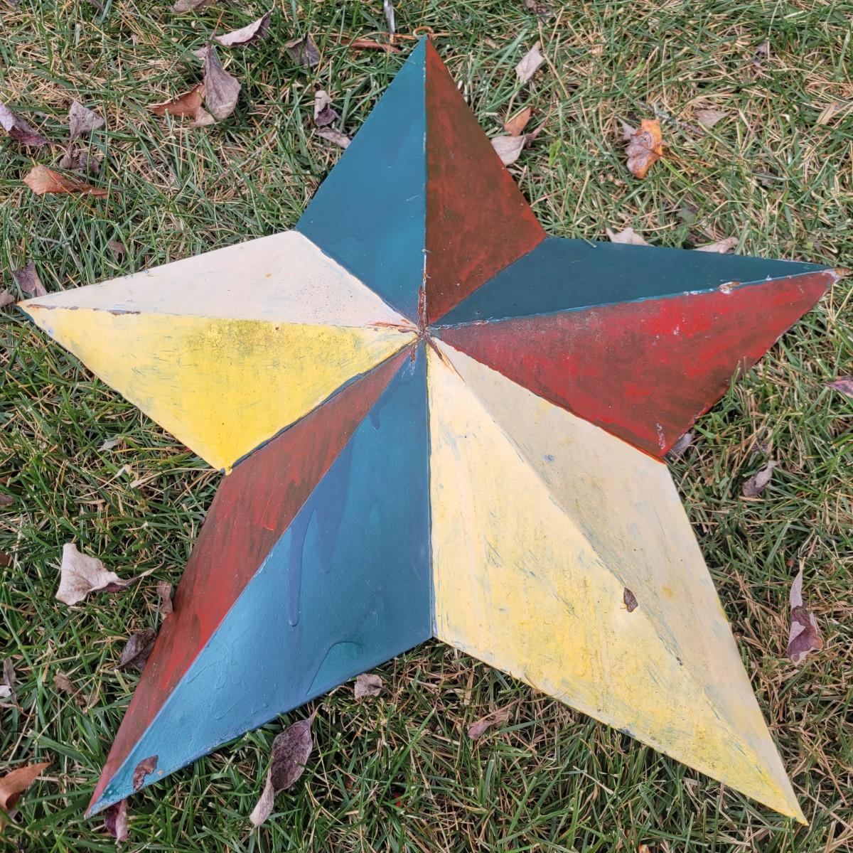 An assortment of five pieces of yard art. Included is a small metal lady bug solar light that did not light up when the photo cell was covered, a metal multicolored star, a metal bird feeder with ivy and an umbrella, a glass flower on a metal pole and a large cluster of metal flower. The largest metal flower cluster measures approximately 19"D x 37"H. Local pickup only