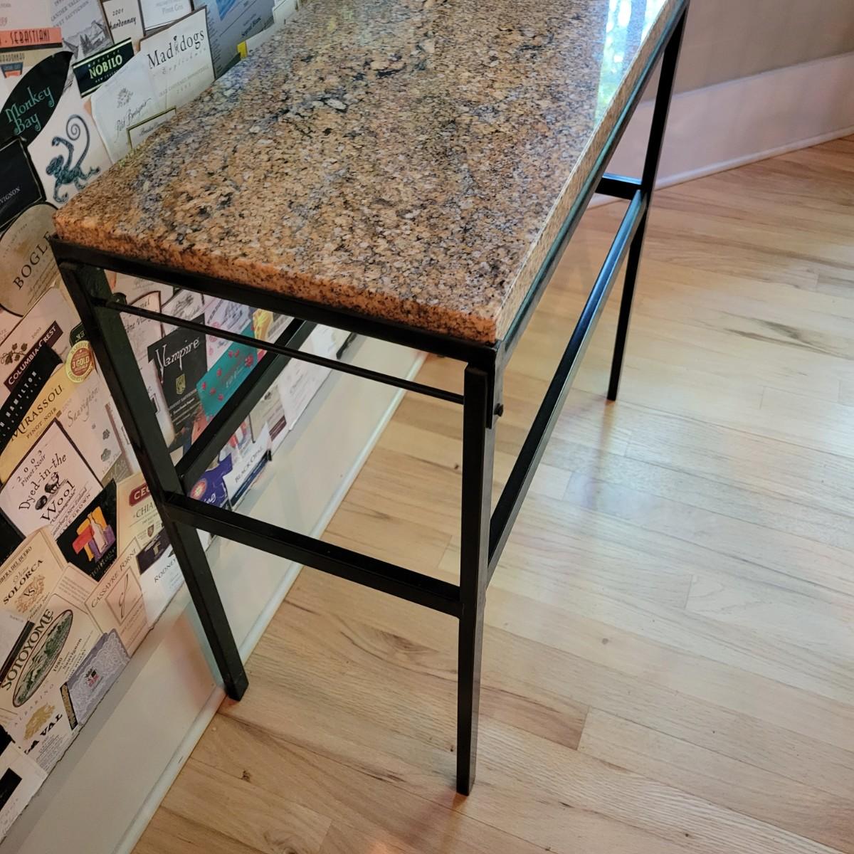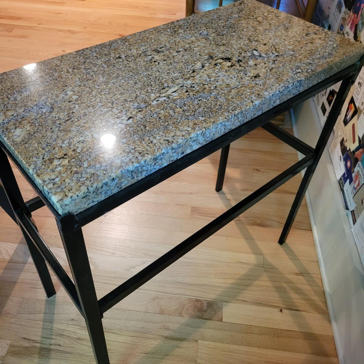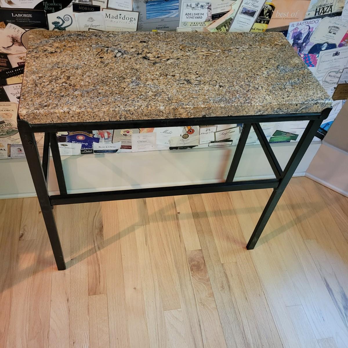 A small granite and metal accent table. This table has a black metal frame with thick granite top and measures approximately 27" x 12.5" x 26.5"H. Local pickup only