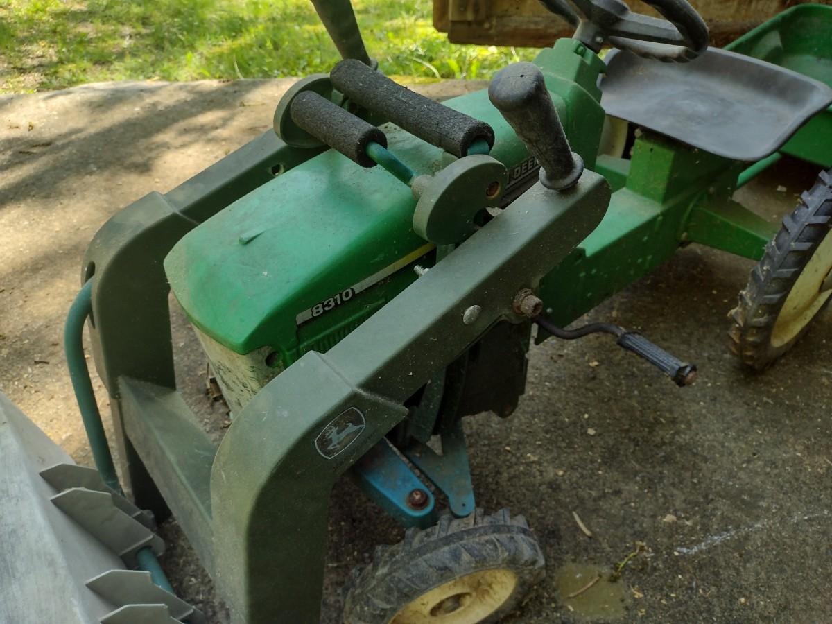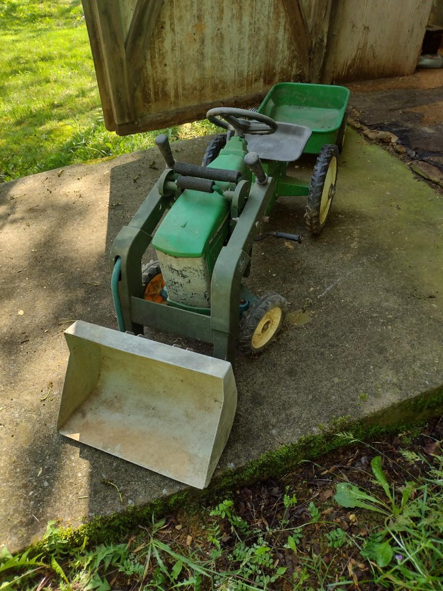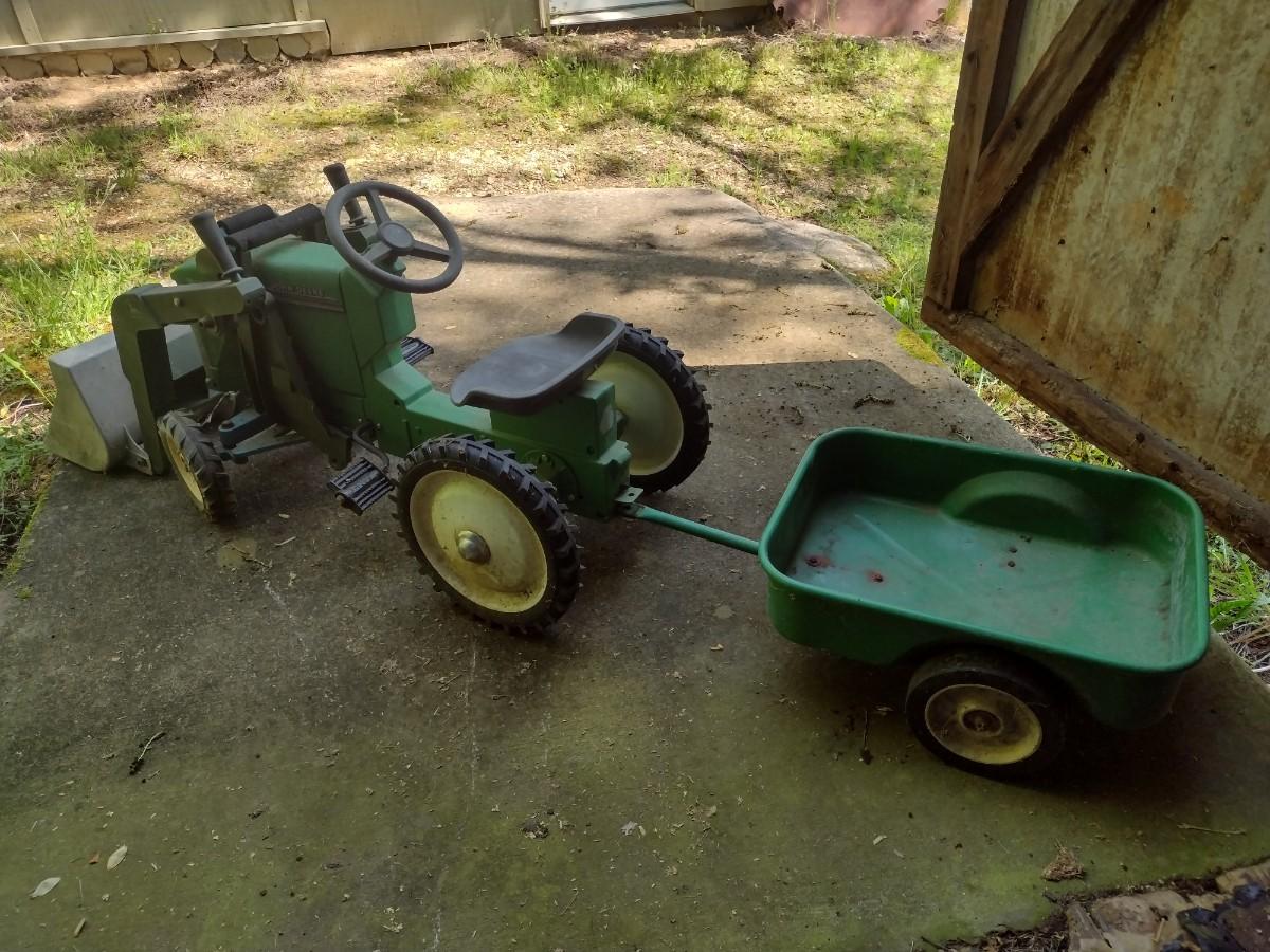 Metal and Plastic Body John Deere Peddle Tractor with Front Loader and Metal Pull Wagon. Used condition.