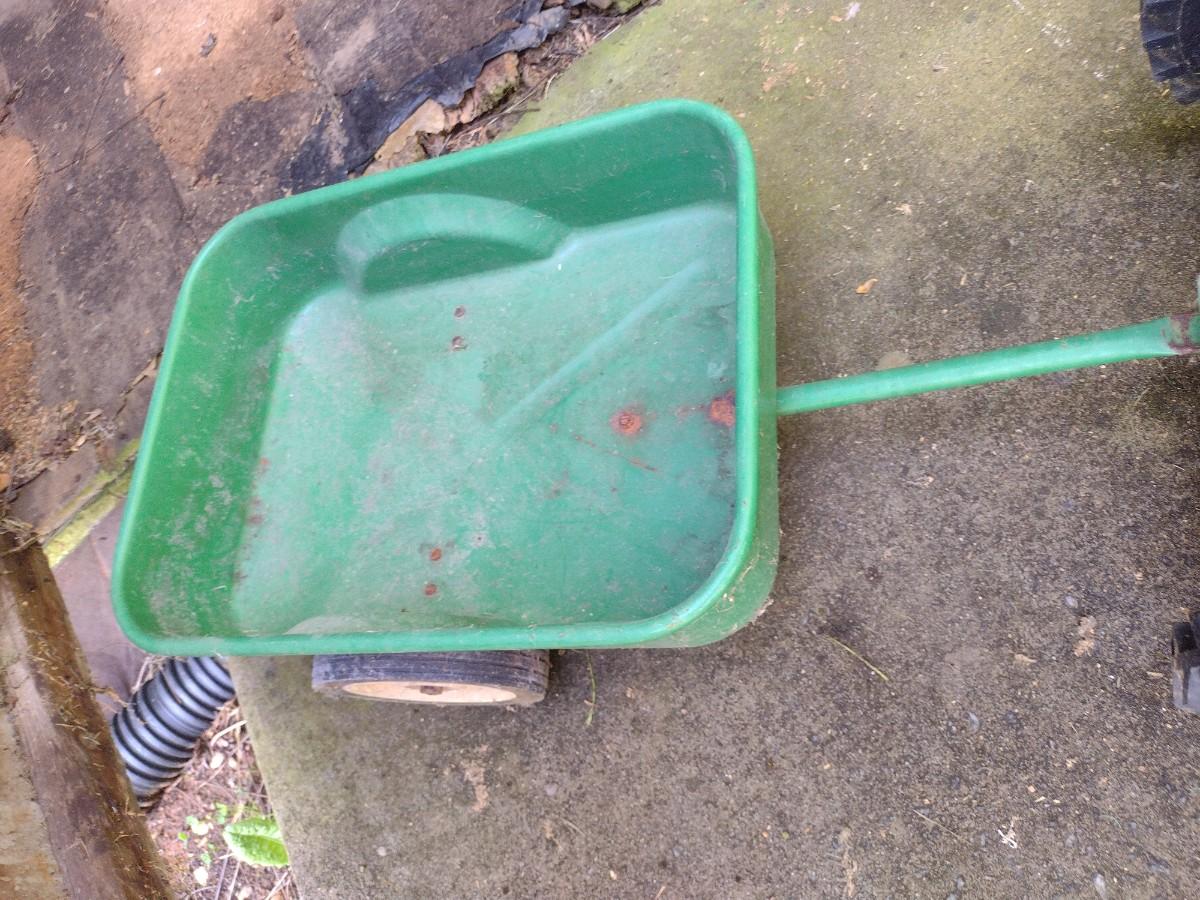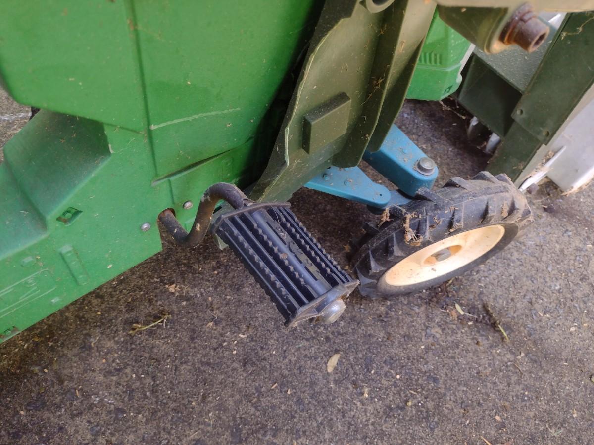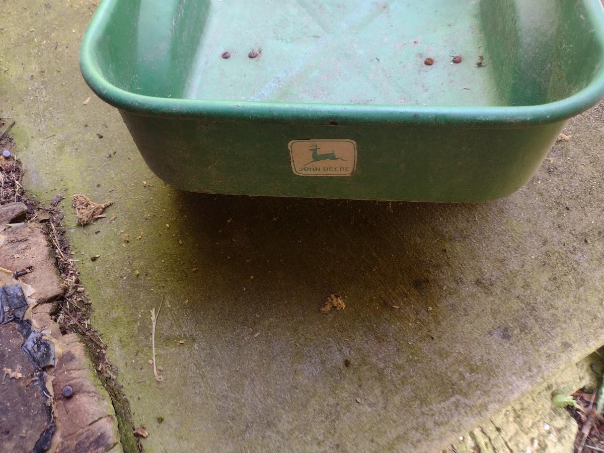 Metal and Plastic Body John Deere Peddle Tractor with Front Loader and Metal Pull Wagon. Used condition.