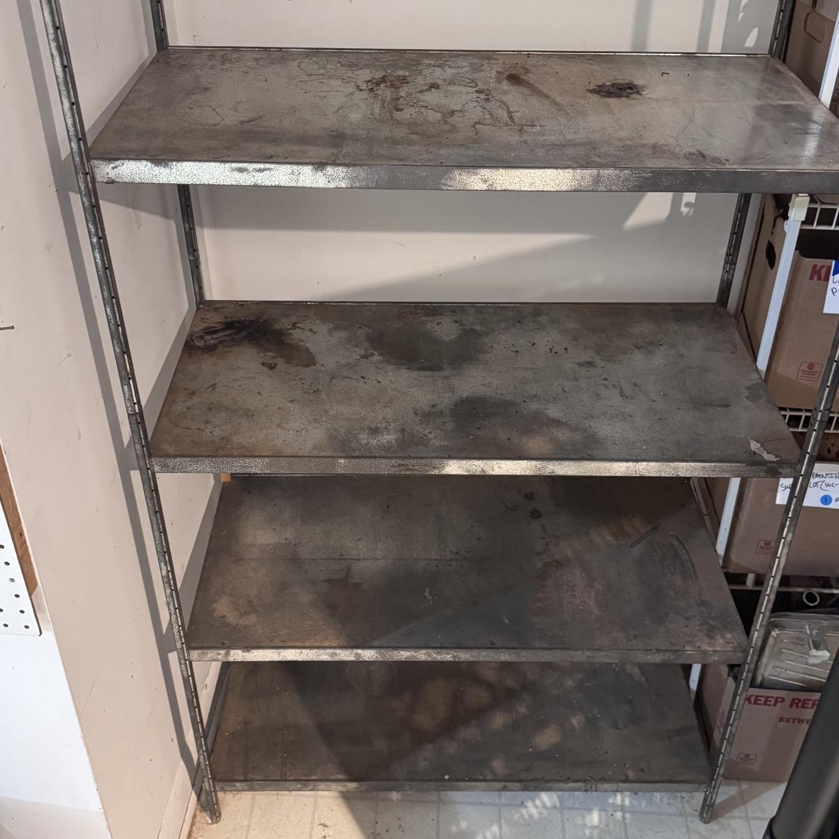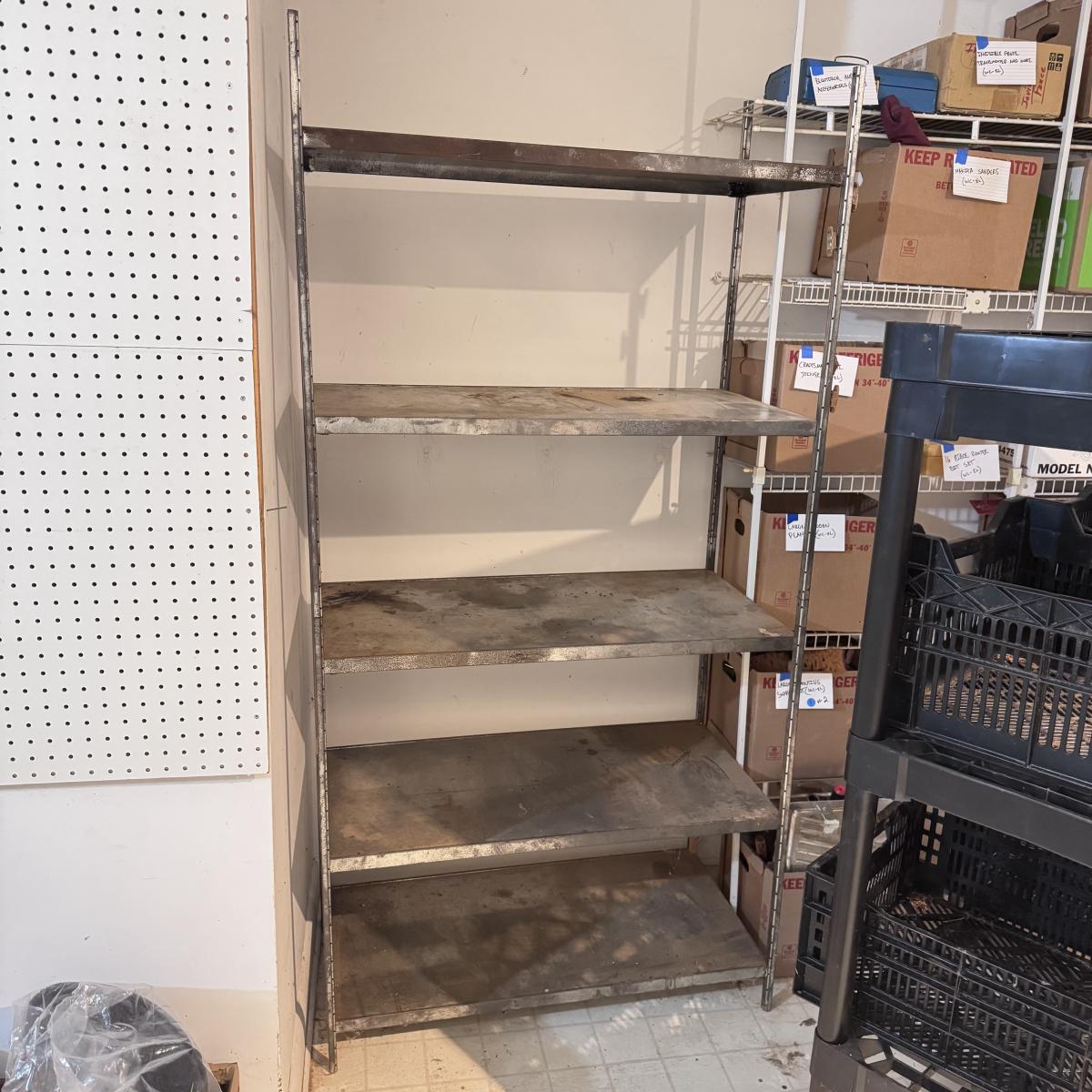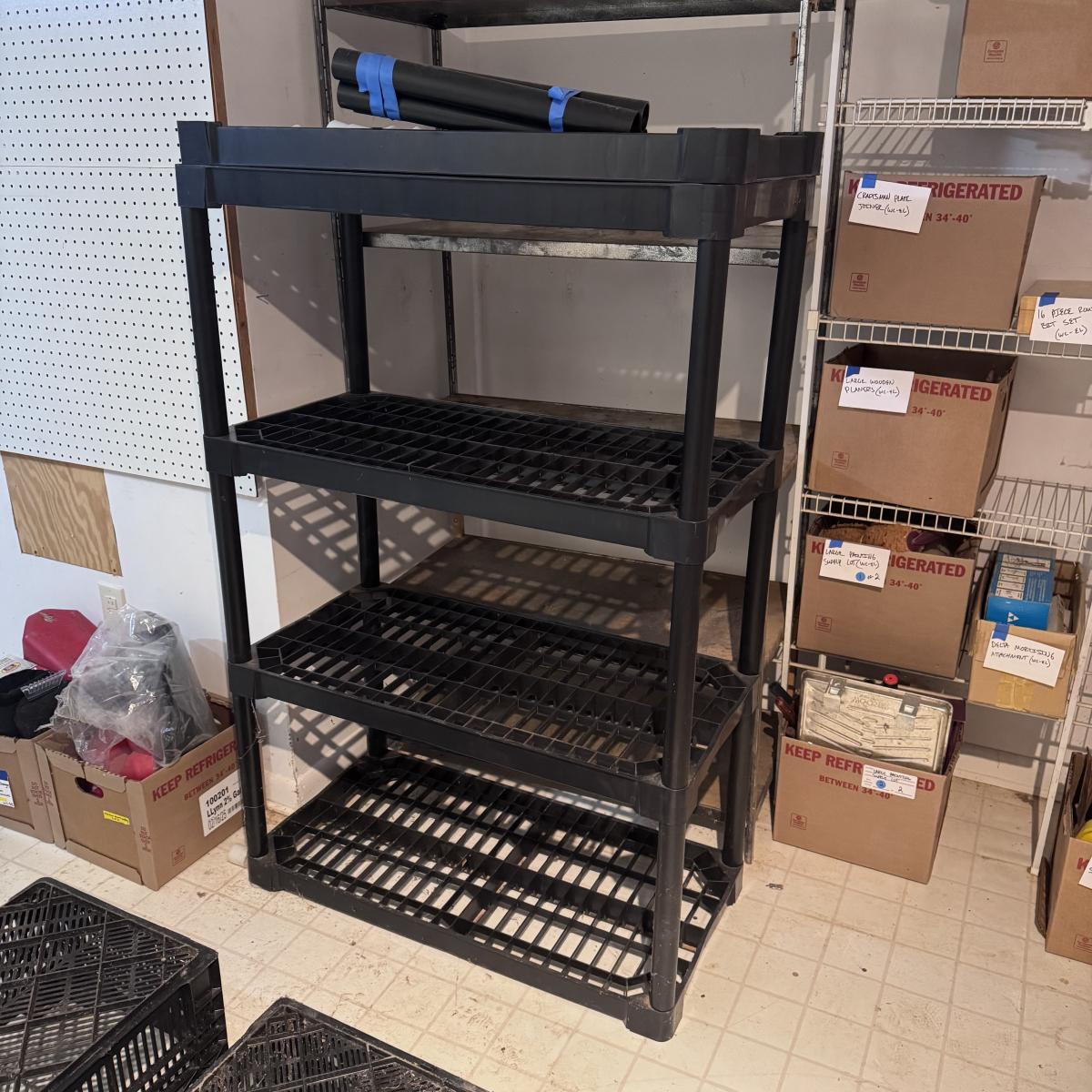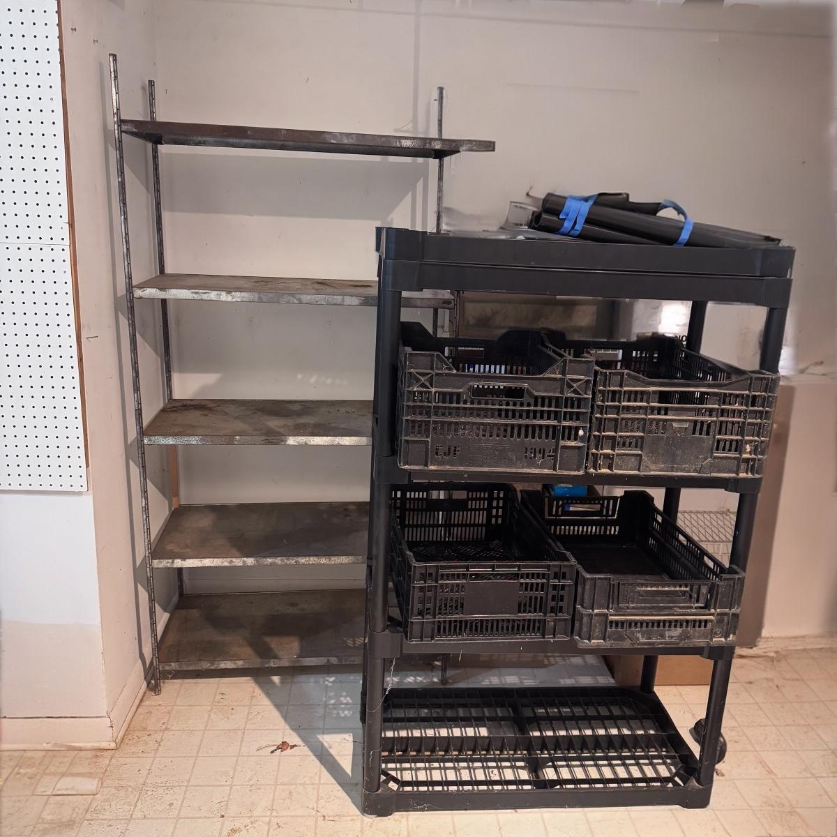 This lot includes one metal shelving unit, one plastic shelving unit, four plastic crates, and an extra shelf for the plastic unit. The metal shelf needs a good cleaning. It measures 35.95” x 18” x 72”H. The plastic shelf measures 35.5” x 17.5” x 54.5”H and appears to break down easily (metal shelf may require tools for breakdown). An extra 17” is added to the height when the extra shelf is installed. Local pickup only.