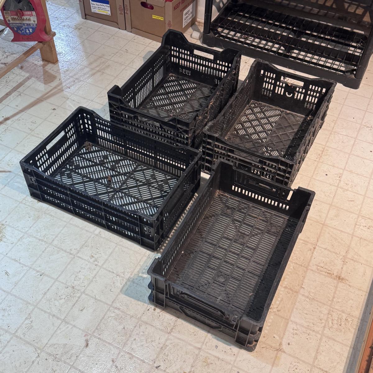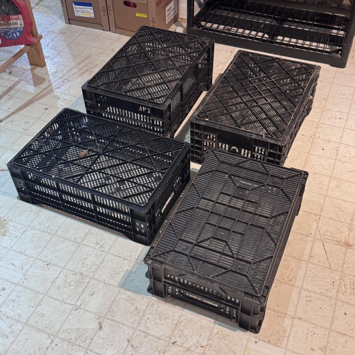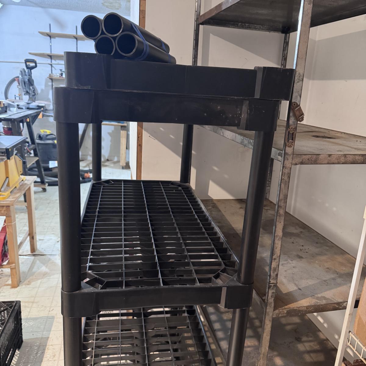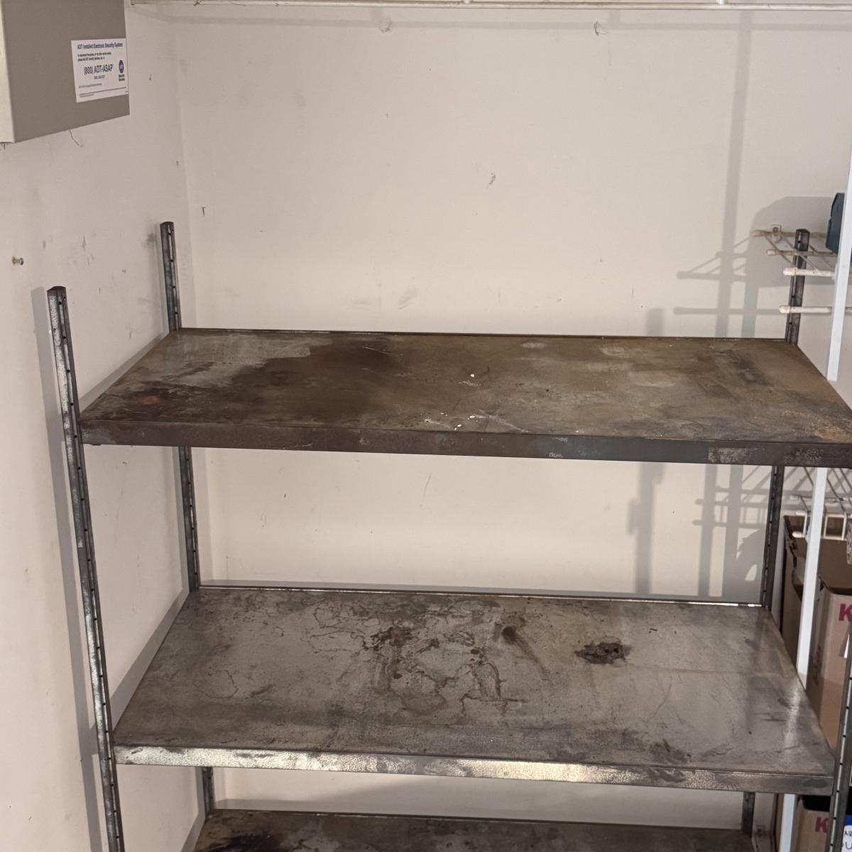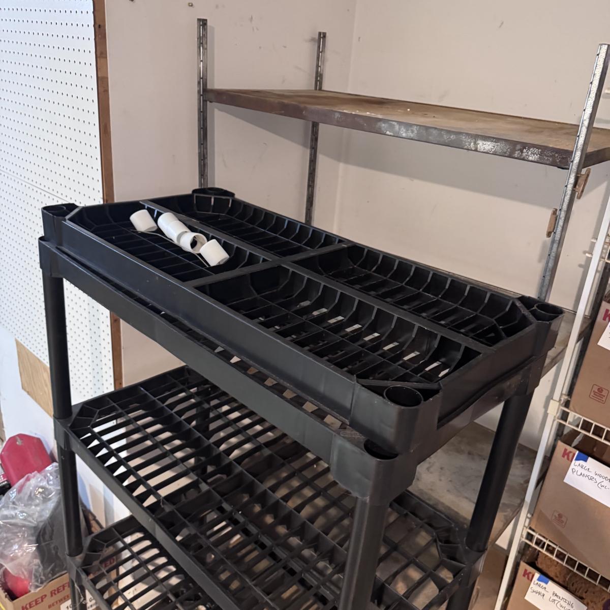 This lot includes one metal shelving unit, one plastic shelving unit, four plastic crates, and an extra shelf for the plastic unit. The metal shelf needs a good cleaning. It measures 35.95” x 18” x 72”H. The plastic shelf measures 35.5” x 17.5” x 54.5”H and appears to break down easily (metal shelf may require tools for breakdown). An extra 17” is added to the height when the extra shelf is installed. Local pickup only.