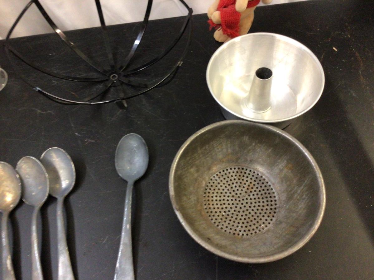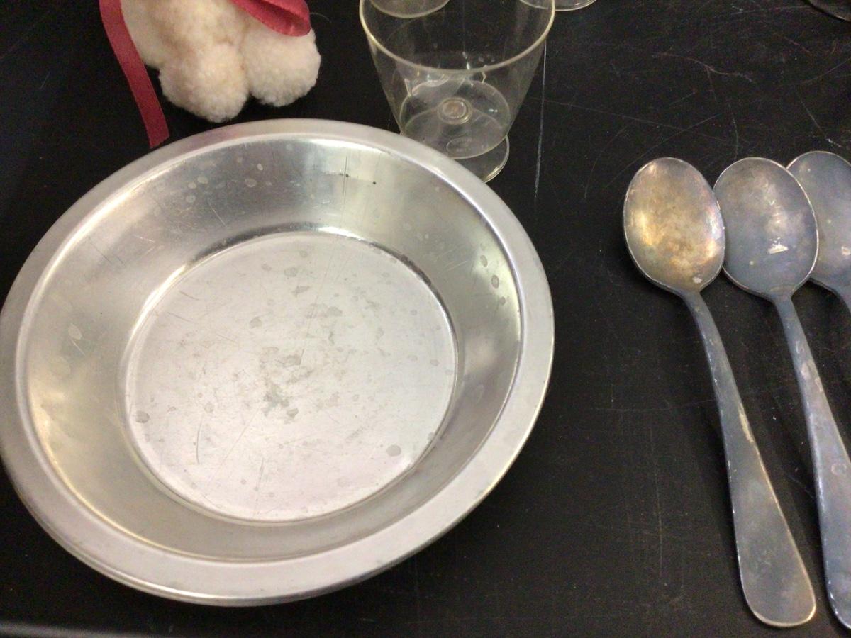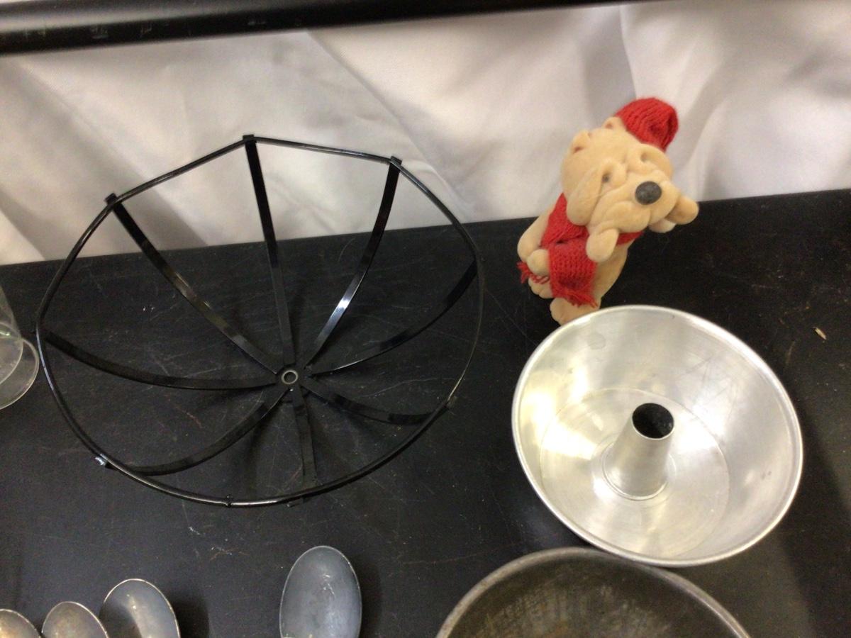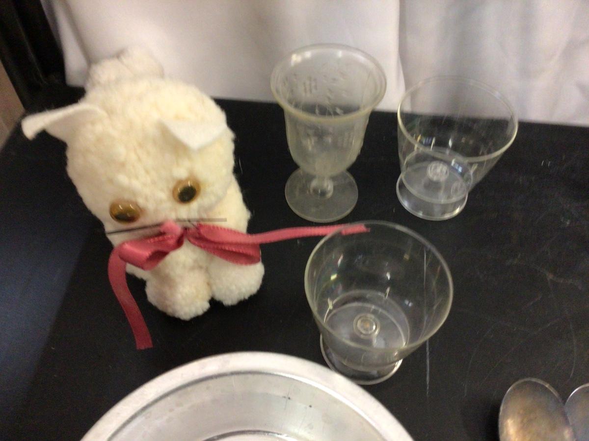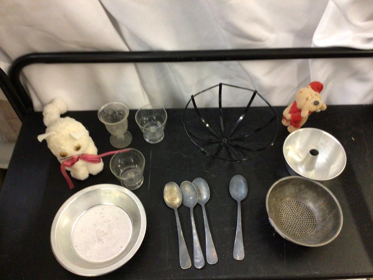 You get two plushy one cat and one dog. You get small metal basket, toy pie plates, colander, Angel food cake pan, and four metal spoons. There is also three plastic toy glasses.