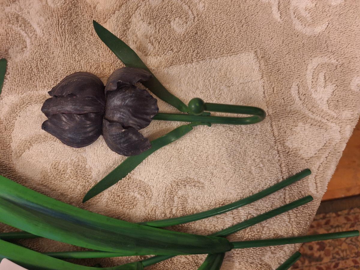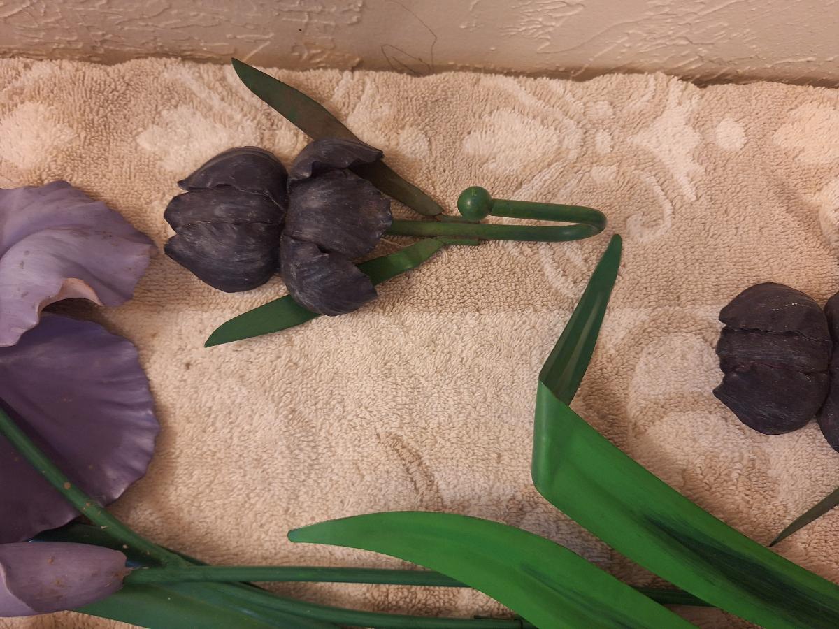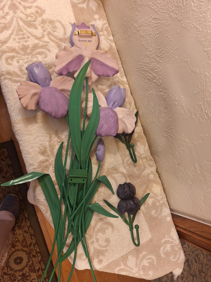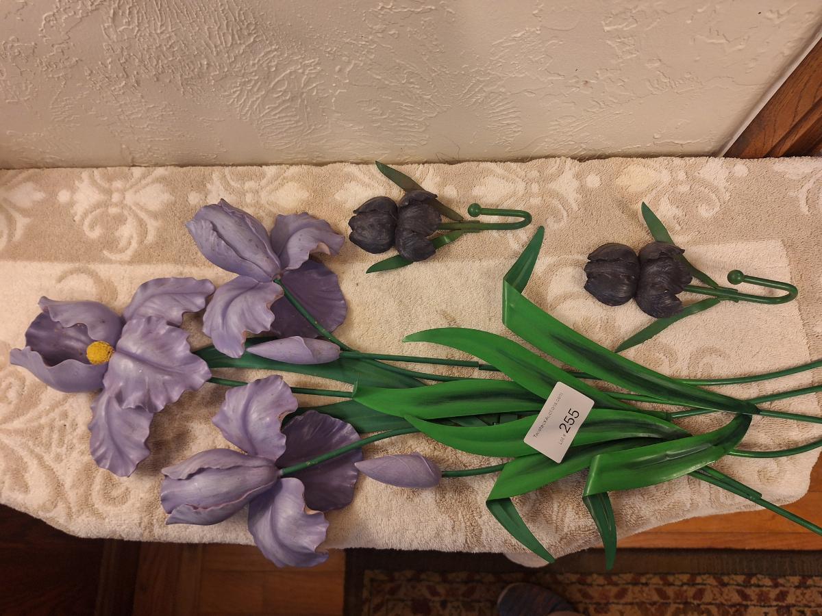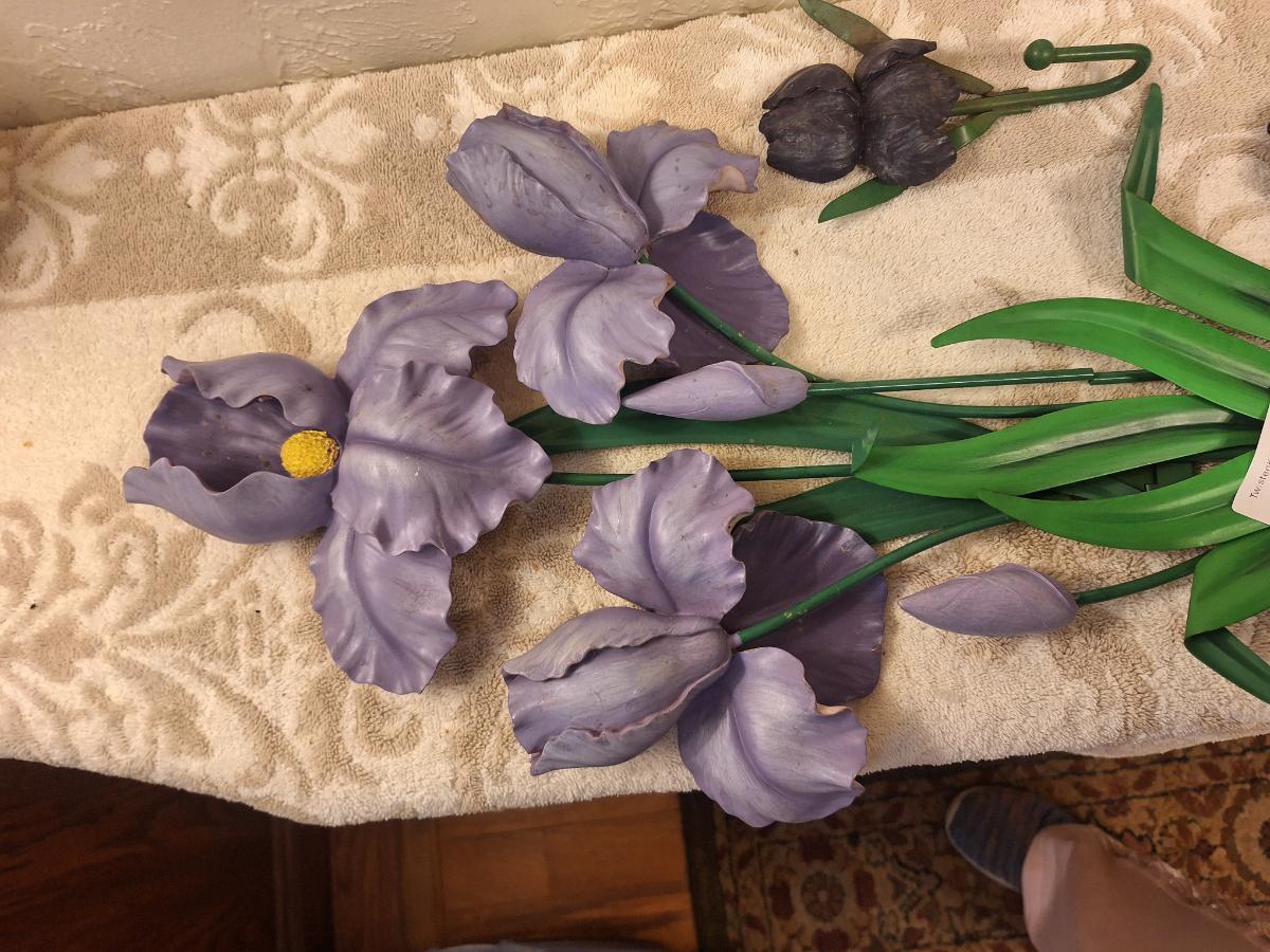 Metal and resin irisn wall hangings.