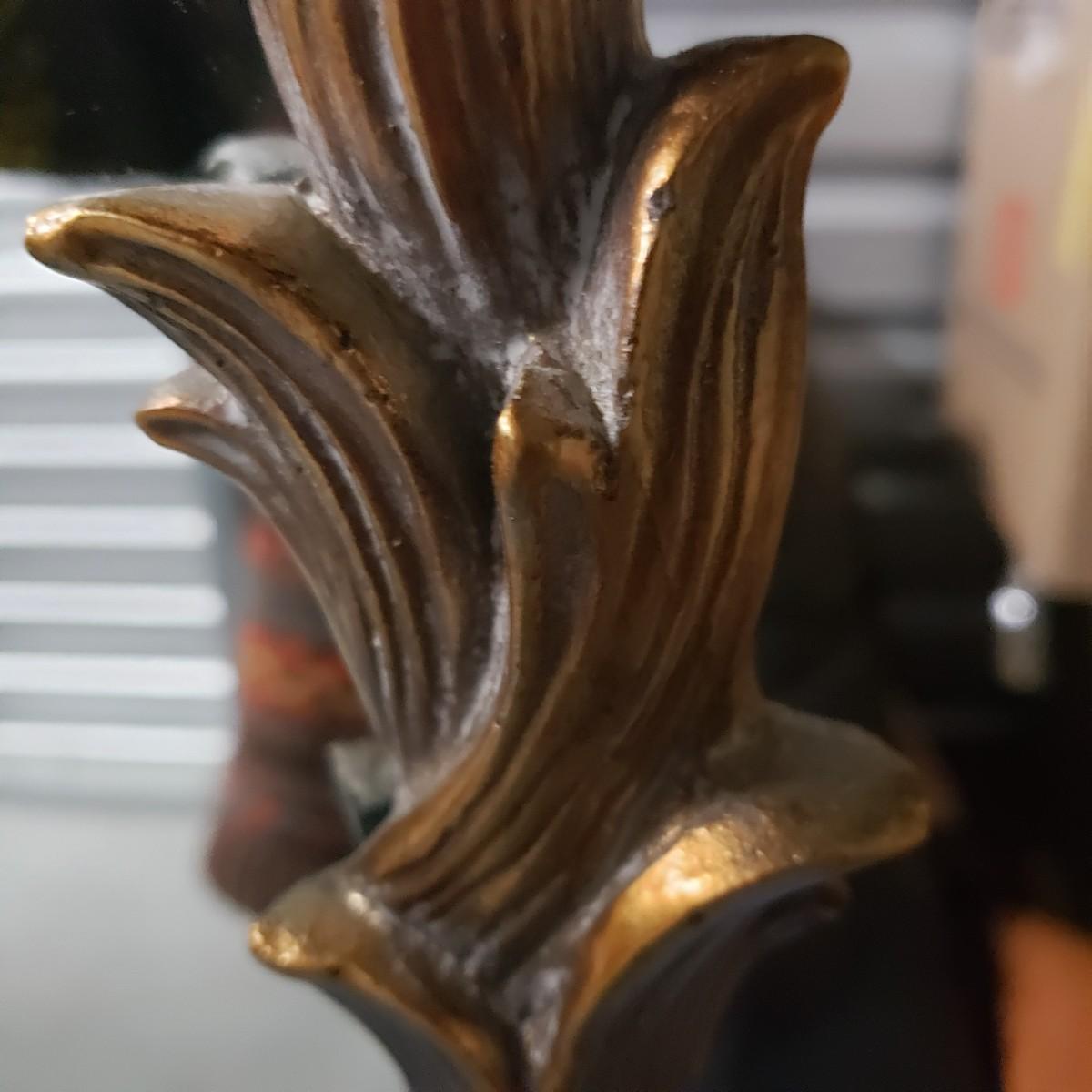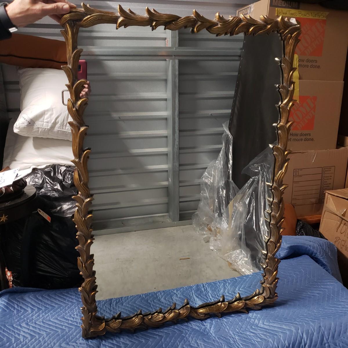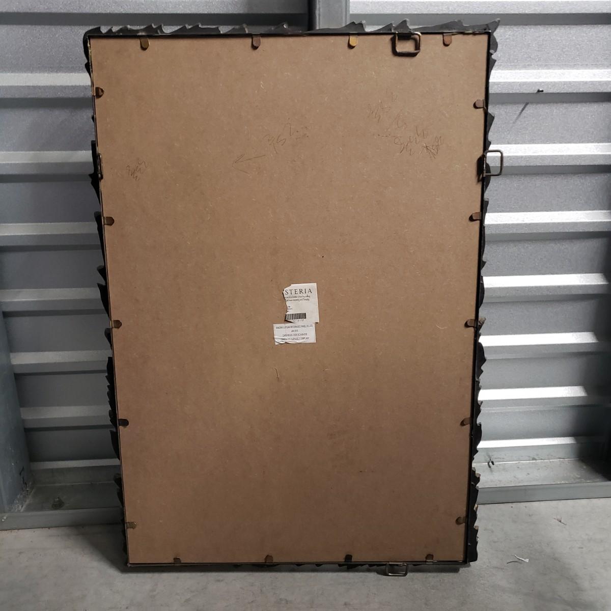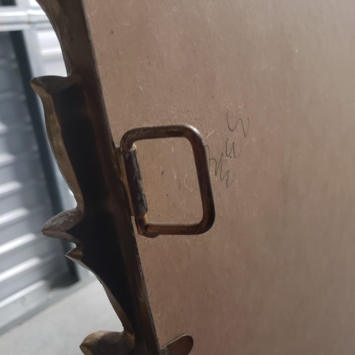 This 29" x 43" ornate mirror is made of a metal frame with resin petal like decorations around the frame. The mirror is quite heavy. There are four brackets for hanging either vertically or horizontal. The mirror does not have a wire for hanging. One petal has a missing end, see picture.