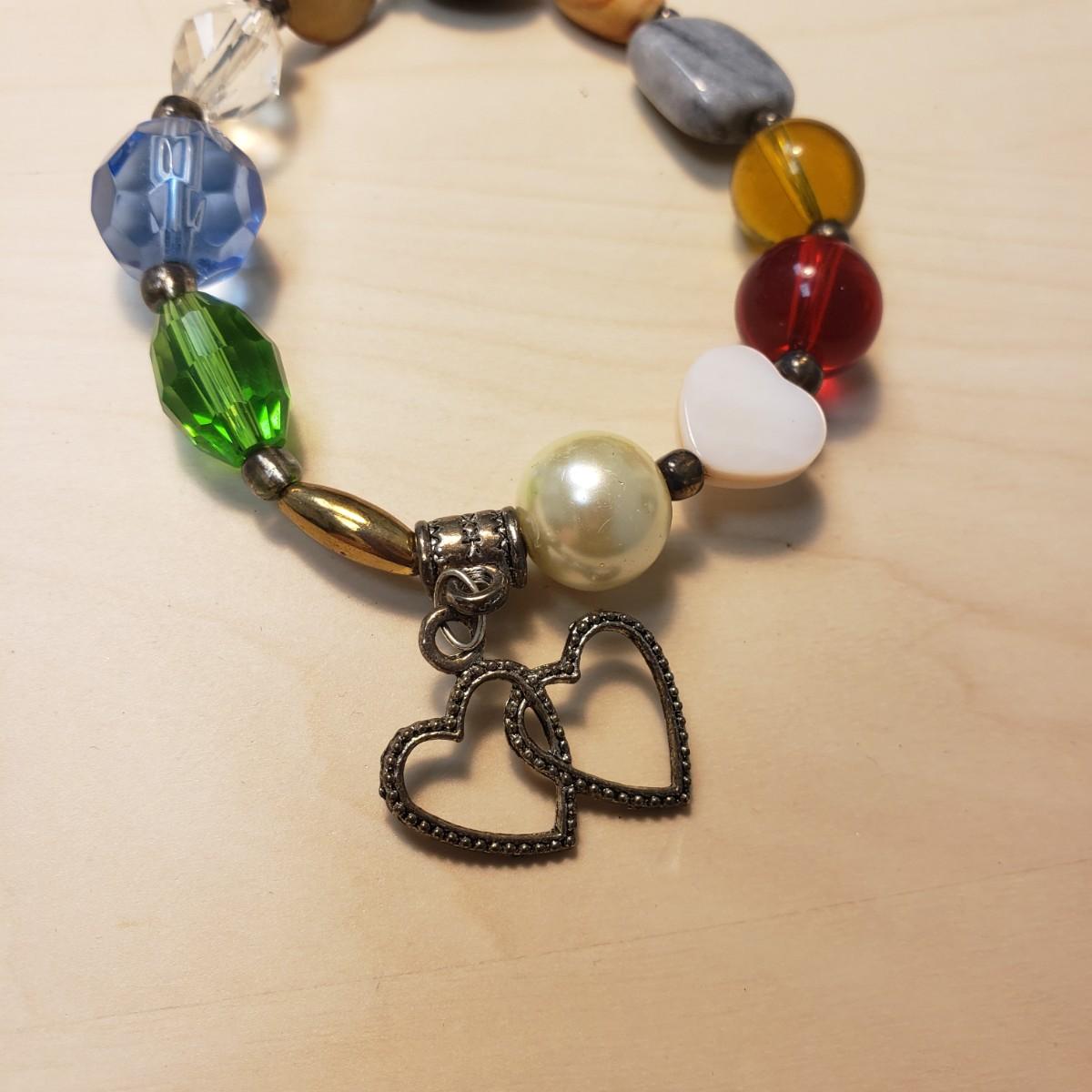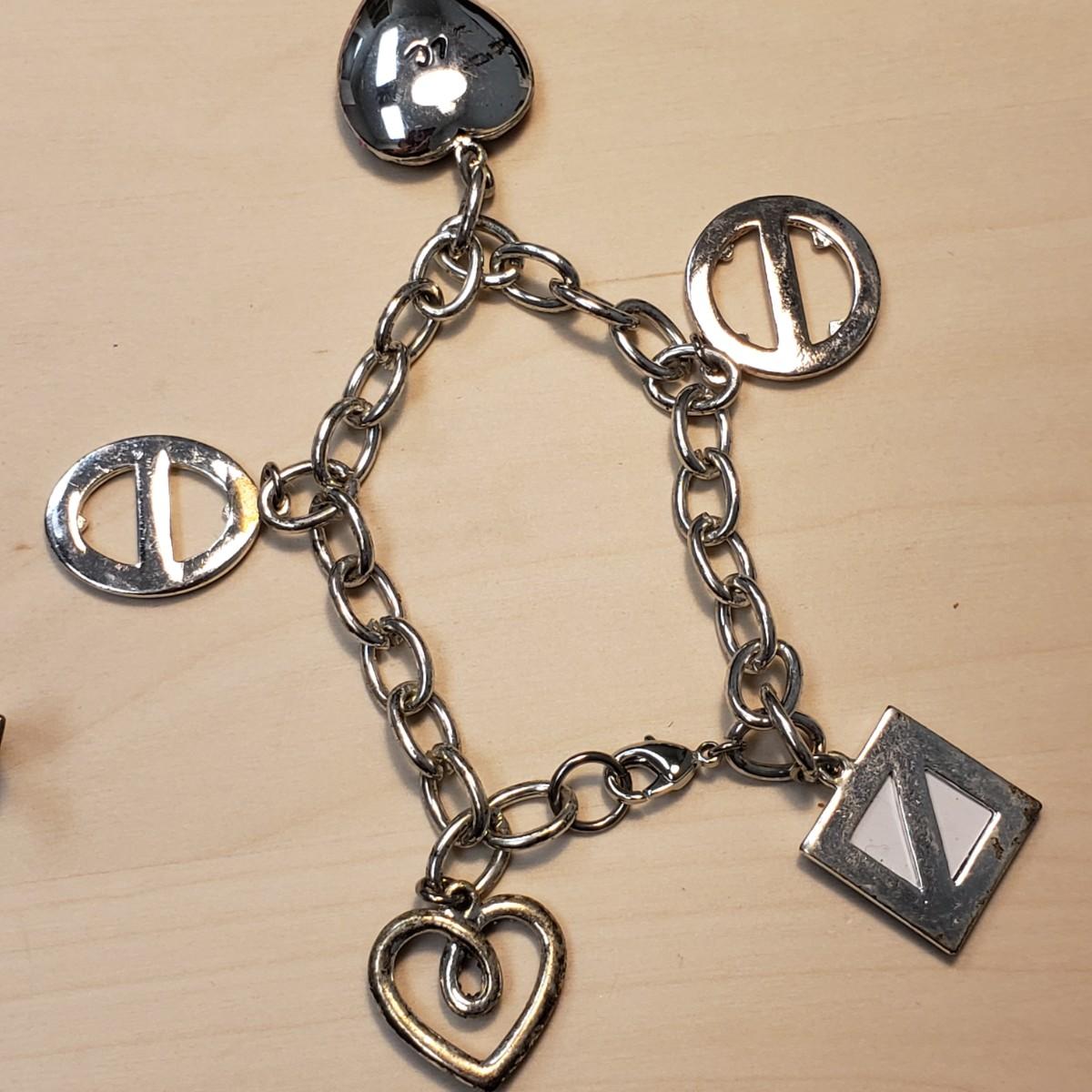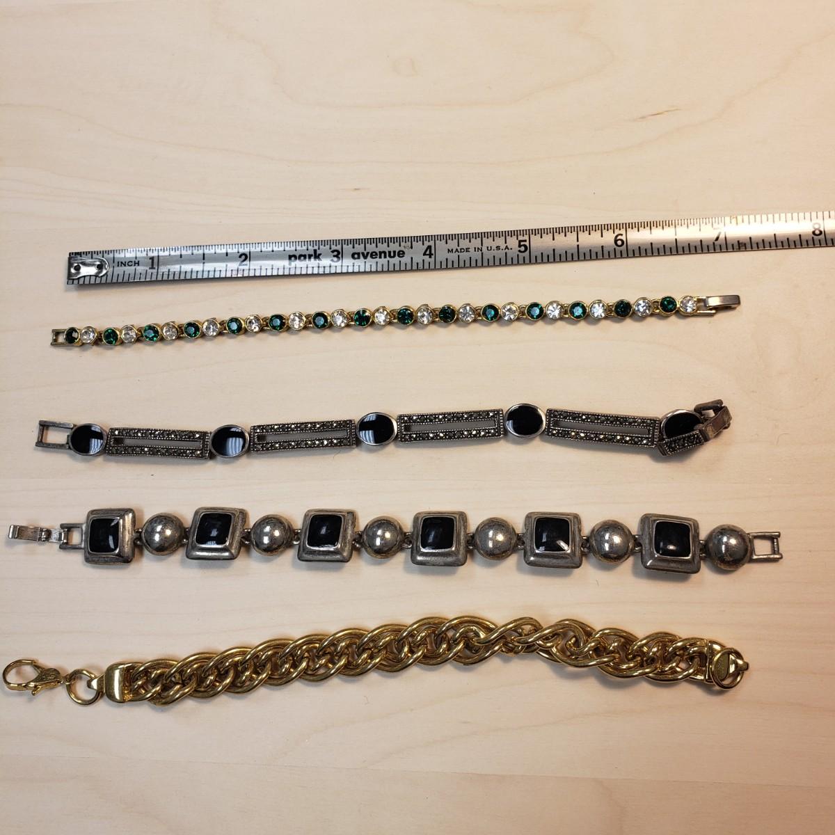This nine piece lot features bracelets made of metal or stone. The heart bracelet has an elastic band. The multicolored stone bracelet, also has an elastic band. The silver colored bracelet with oval black stones and rectangular pieces is marked "925" on the clasp. The solid twisted bracelet is a little heavy to the touch.