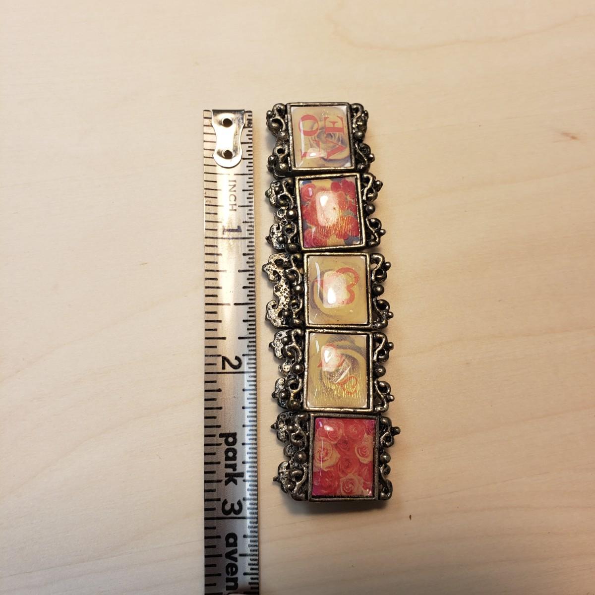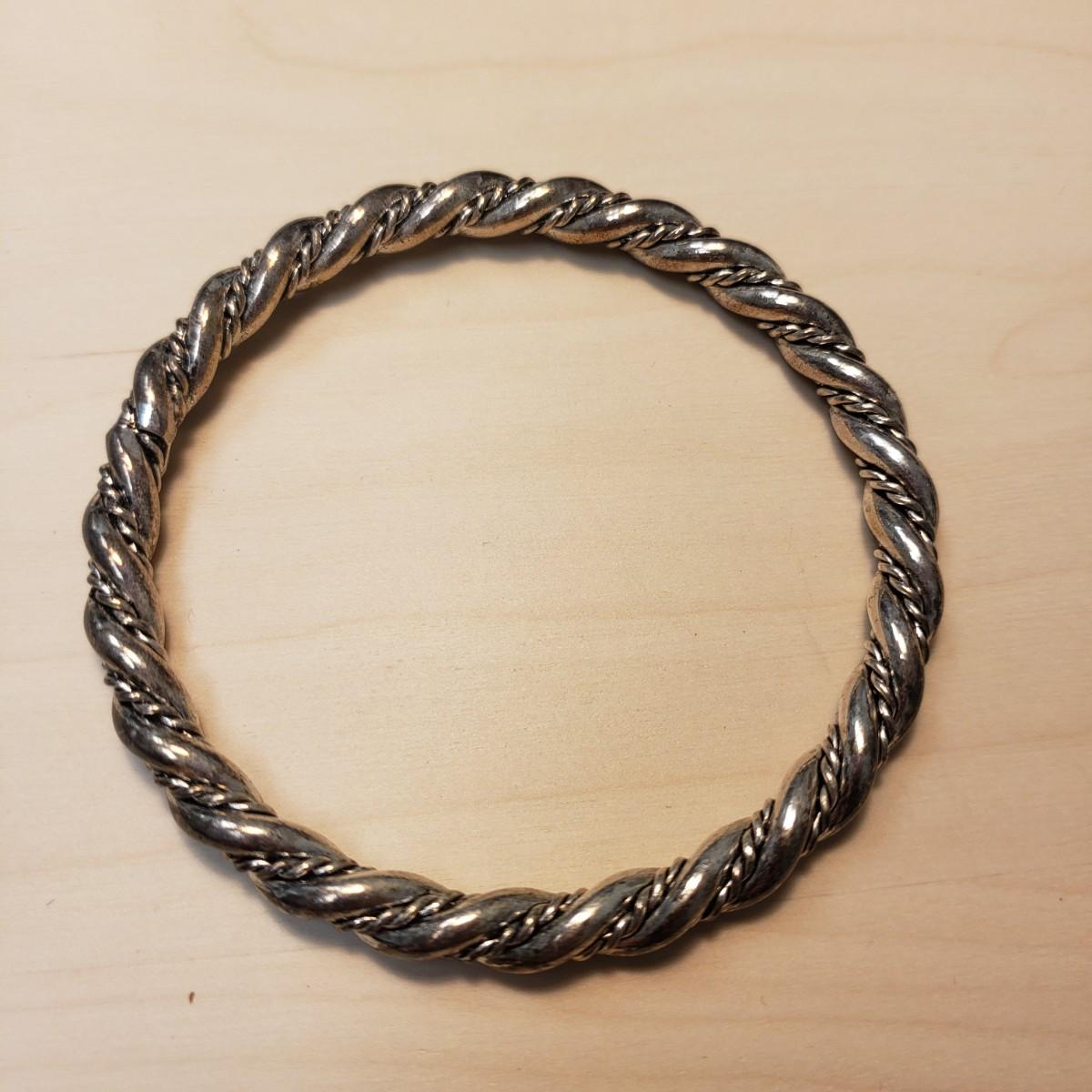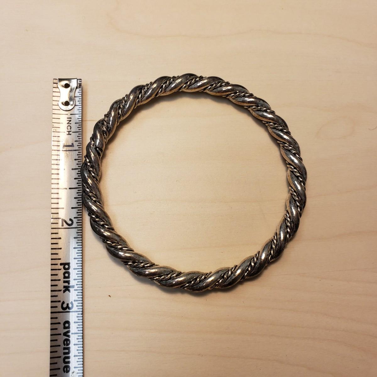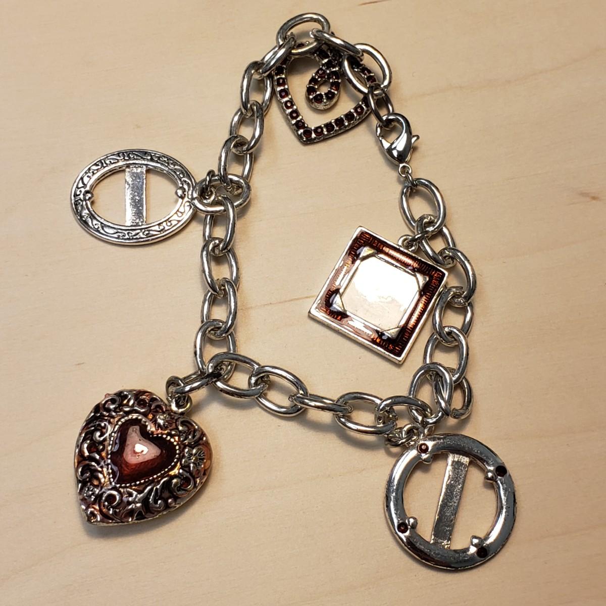 This nine piece lot features bracelets made of metal or stone. The heart bracelet has an elastic band. The multicolored stone bracelet, also has an elastic band. The silver colored bracelet with oval black stones and rectangular pieces is marked "925" on the clasp. The solid twisted bracelet is a little heavy to the touch.