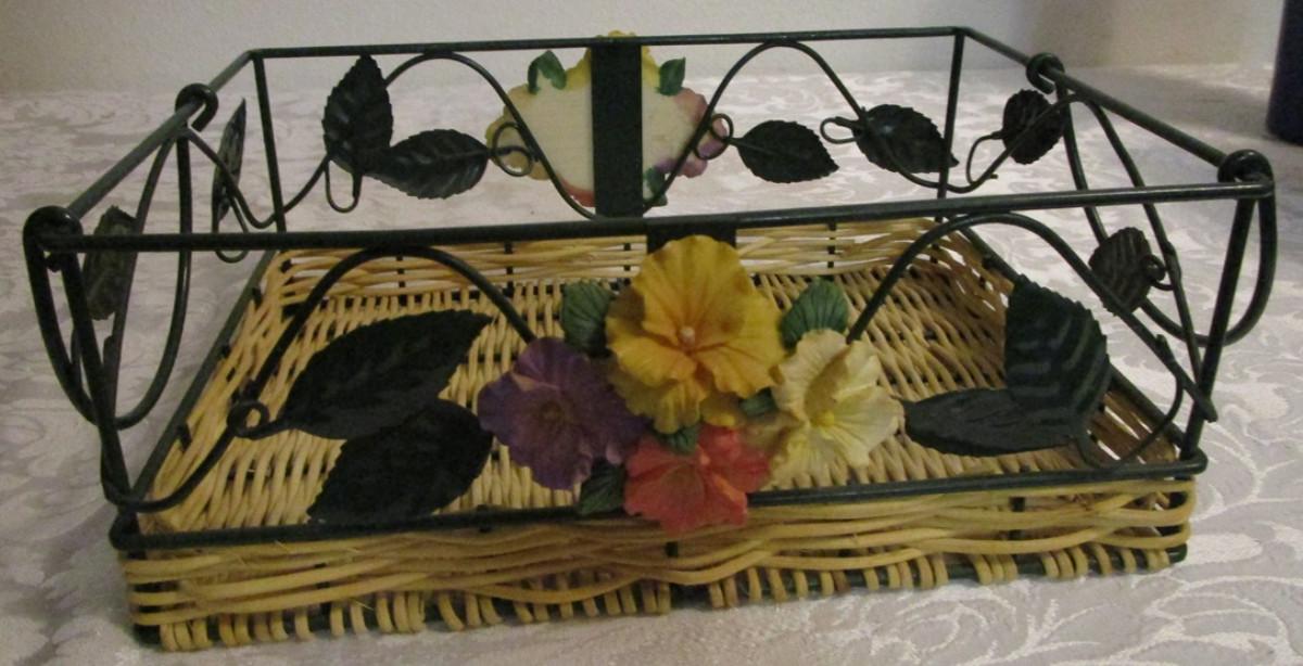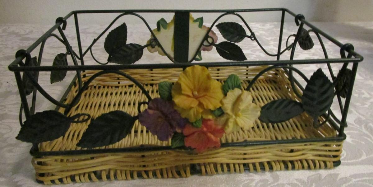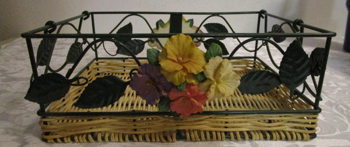 Metal and wicker basket with resin flowers and handles