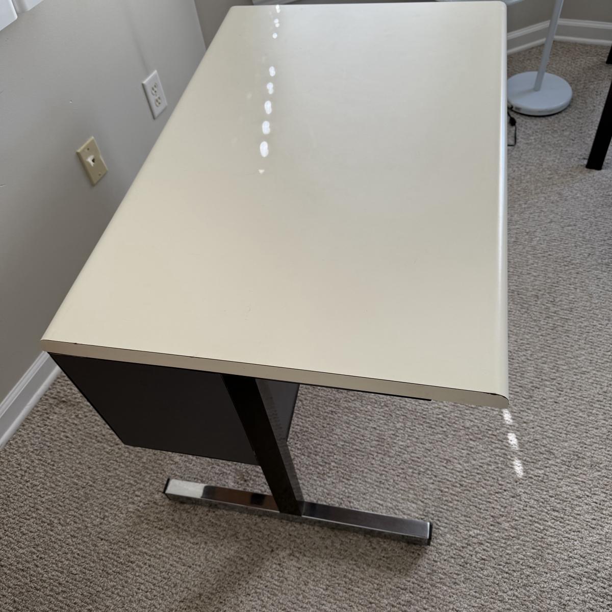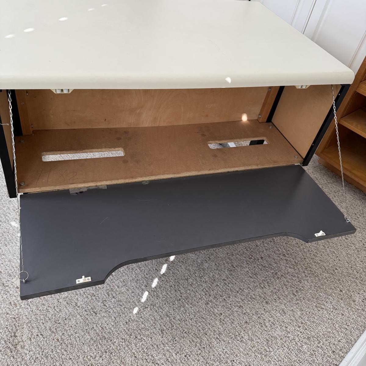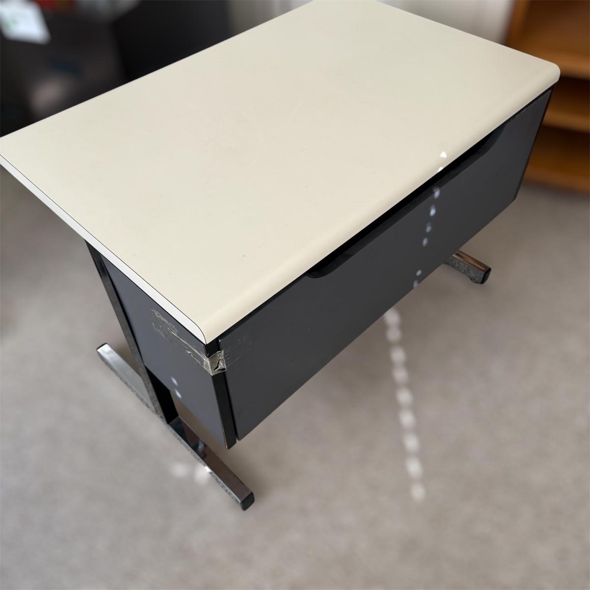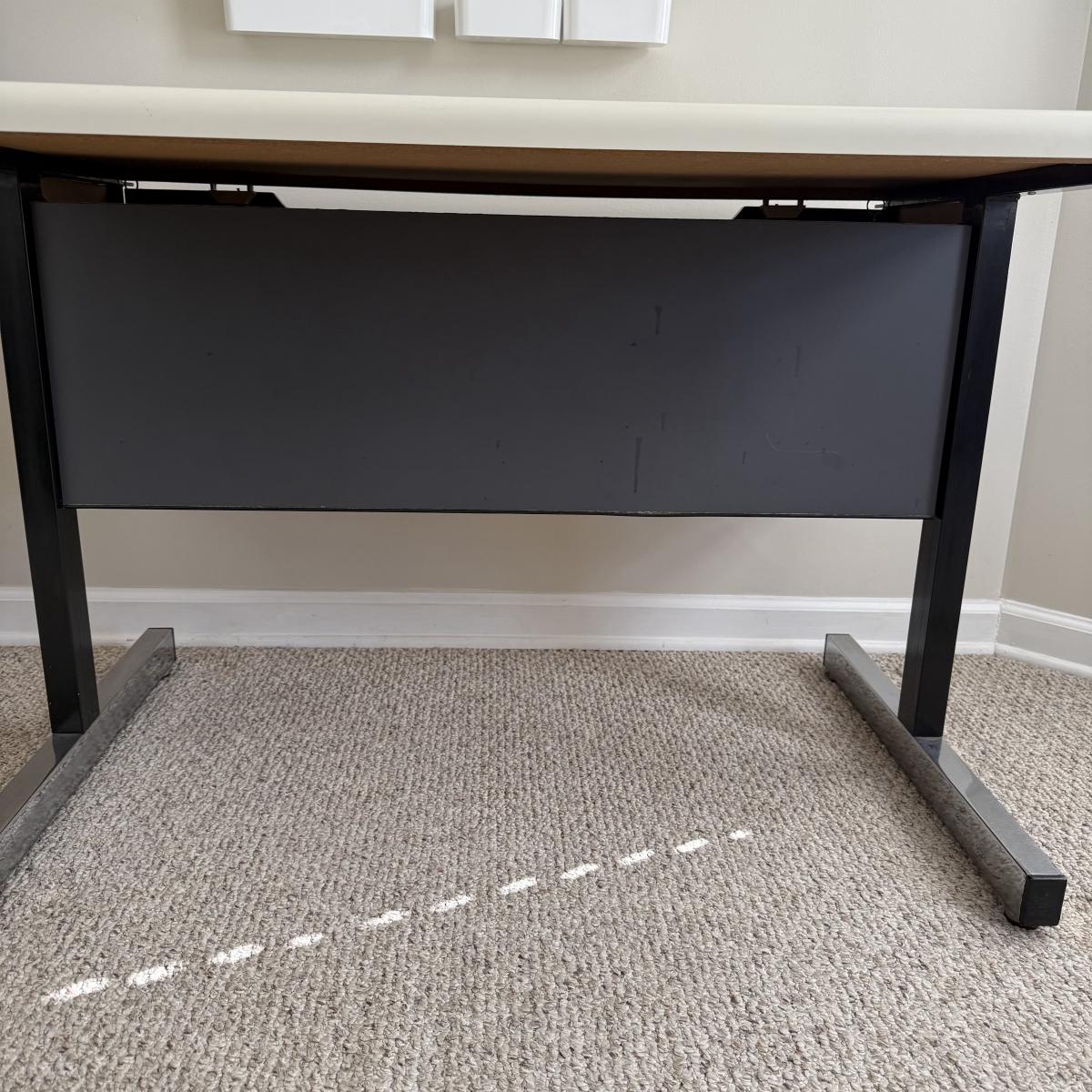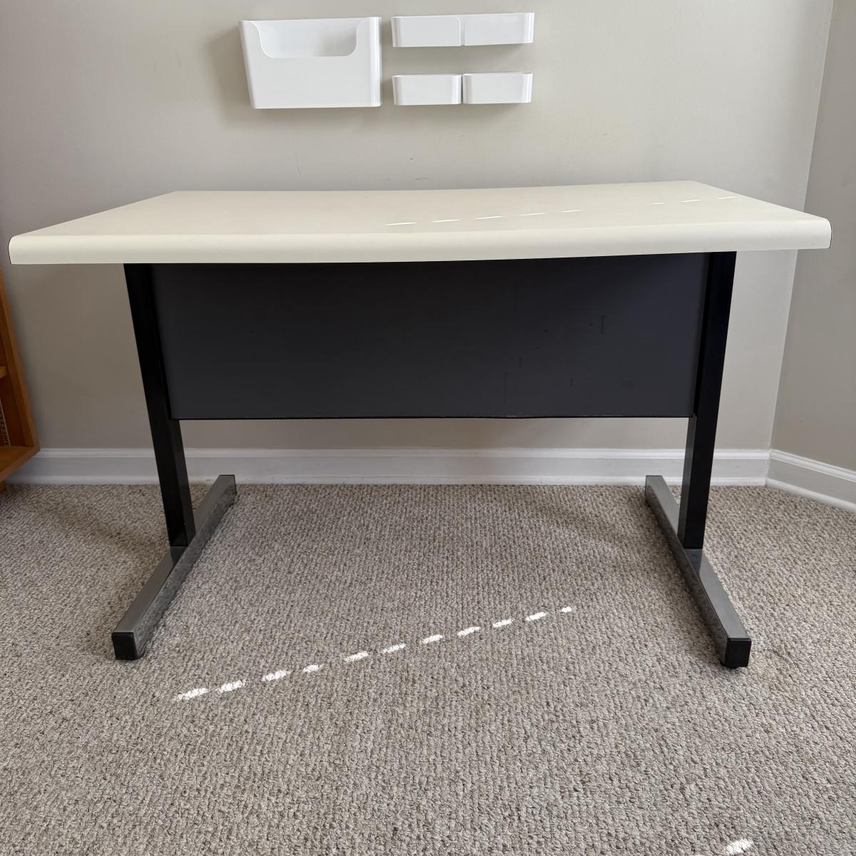 This lot contains a metal and what appears to be manufactured wood desk. It measures 39.5” x 25.5” x 27”H. The desk is a pretty straightforward design and does have a compartment in the back for storage. There is some old tape/residue on the side of the back storage section. The door closes on It's own, so may be just old tape. Local pickup only. Winning bidder must bring assistance to help move and load this item due to its weight and/or size.