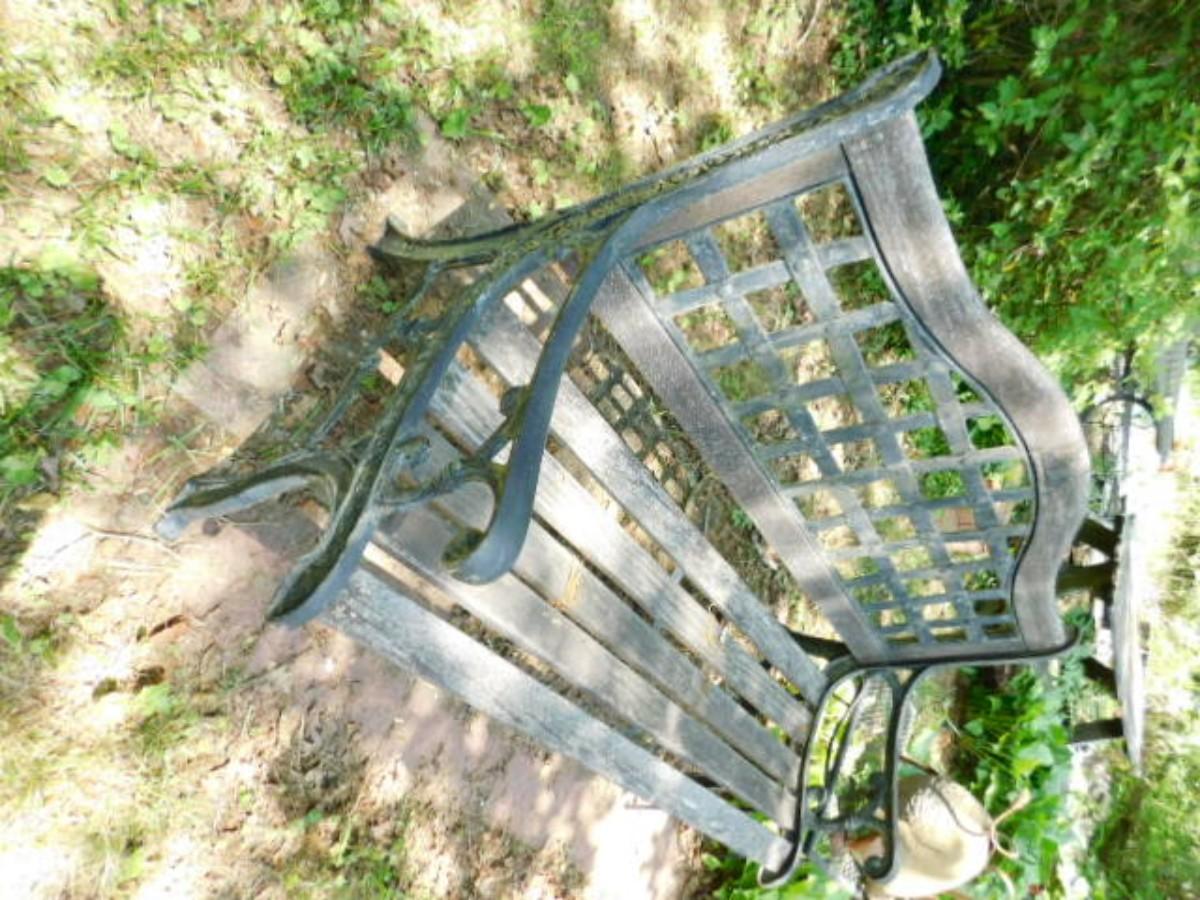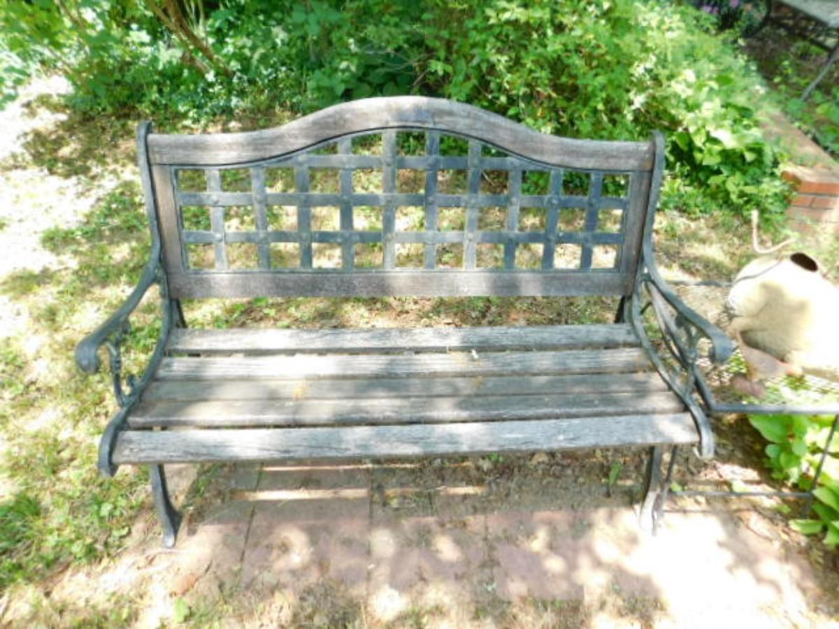 Metal and Wood Finish Garden Bench May need to bring help removing from yard. Expect weathering and color fade.