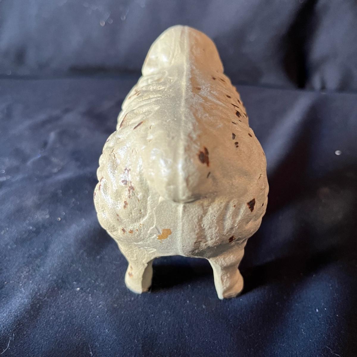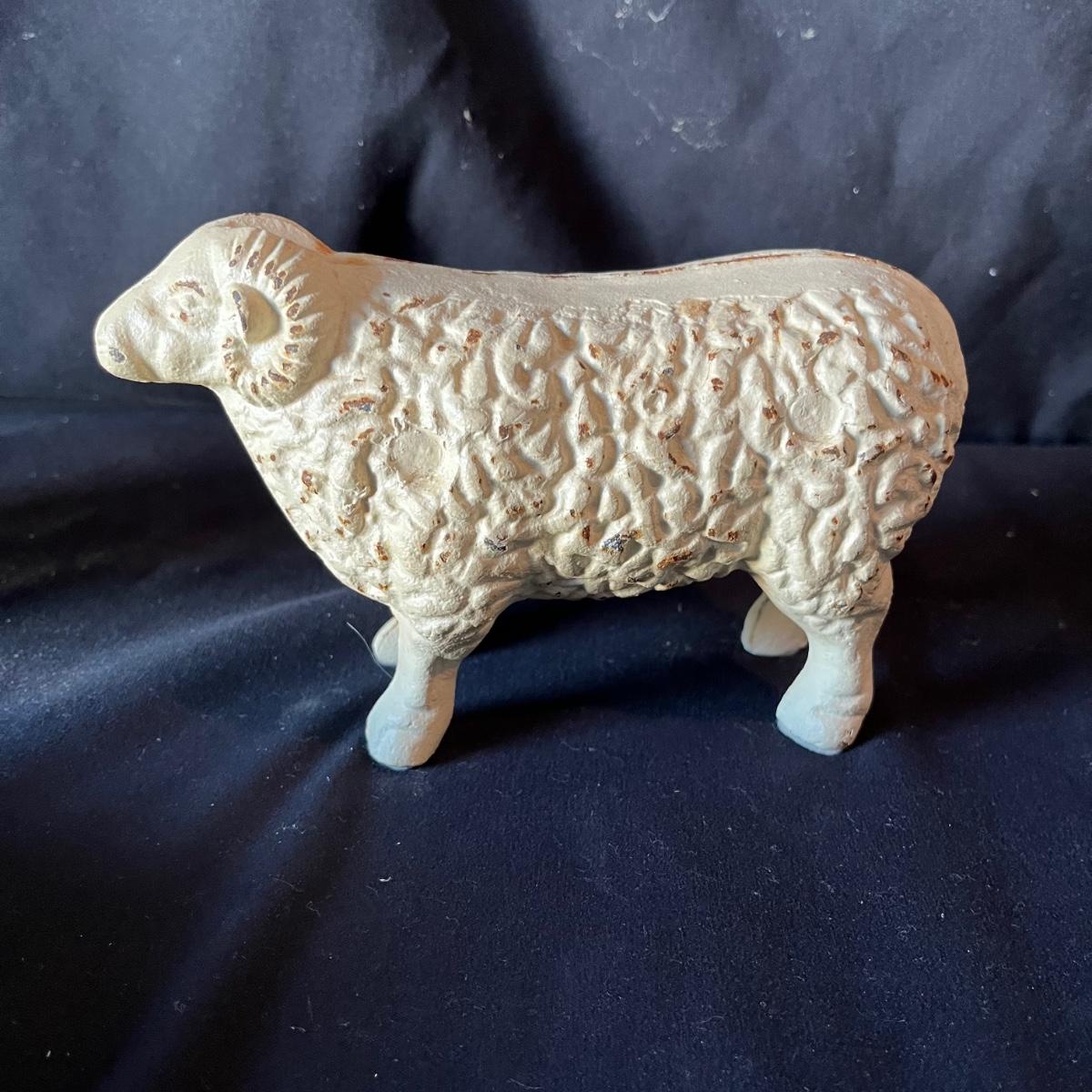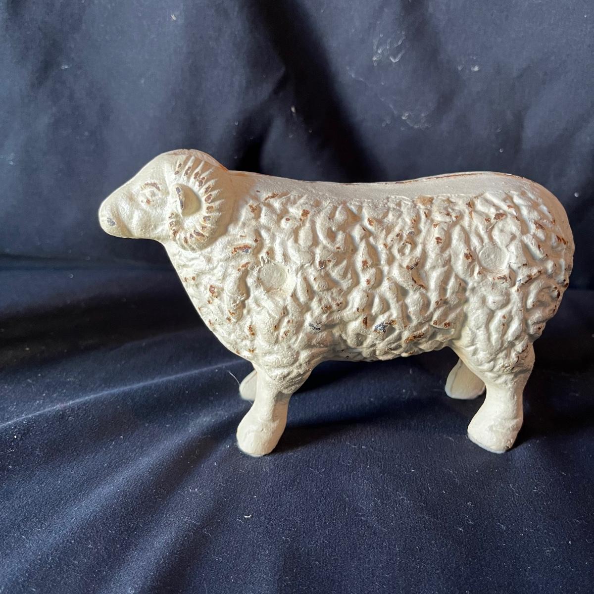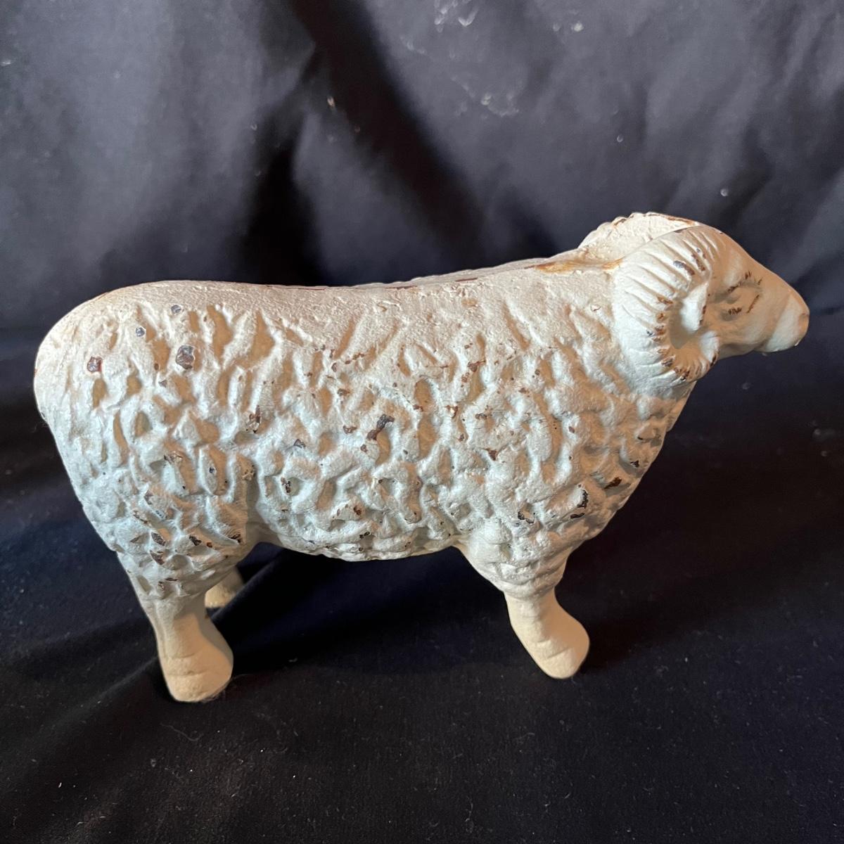 Lot includes a brass rabbit figurine and a painted heavy metal ram and sheep. Ram measures 2.5” x 7” x 4”.