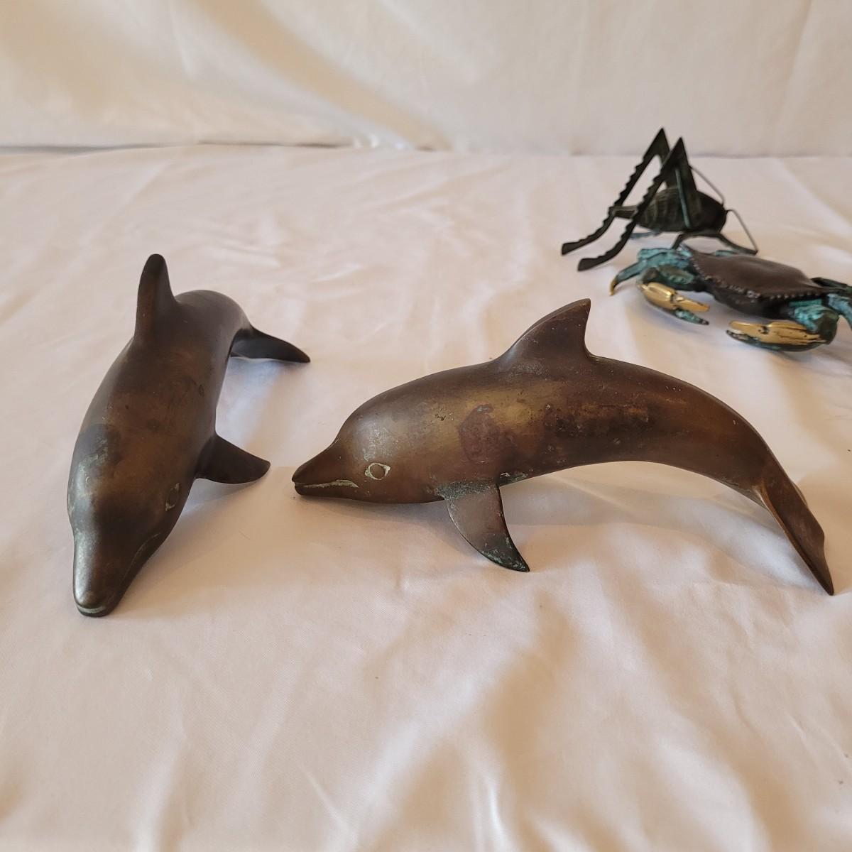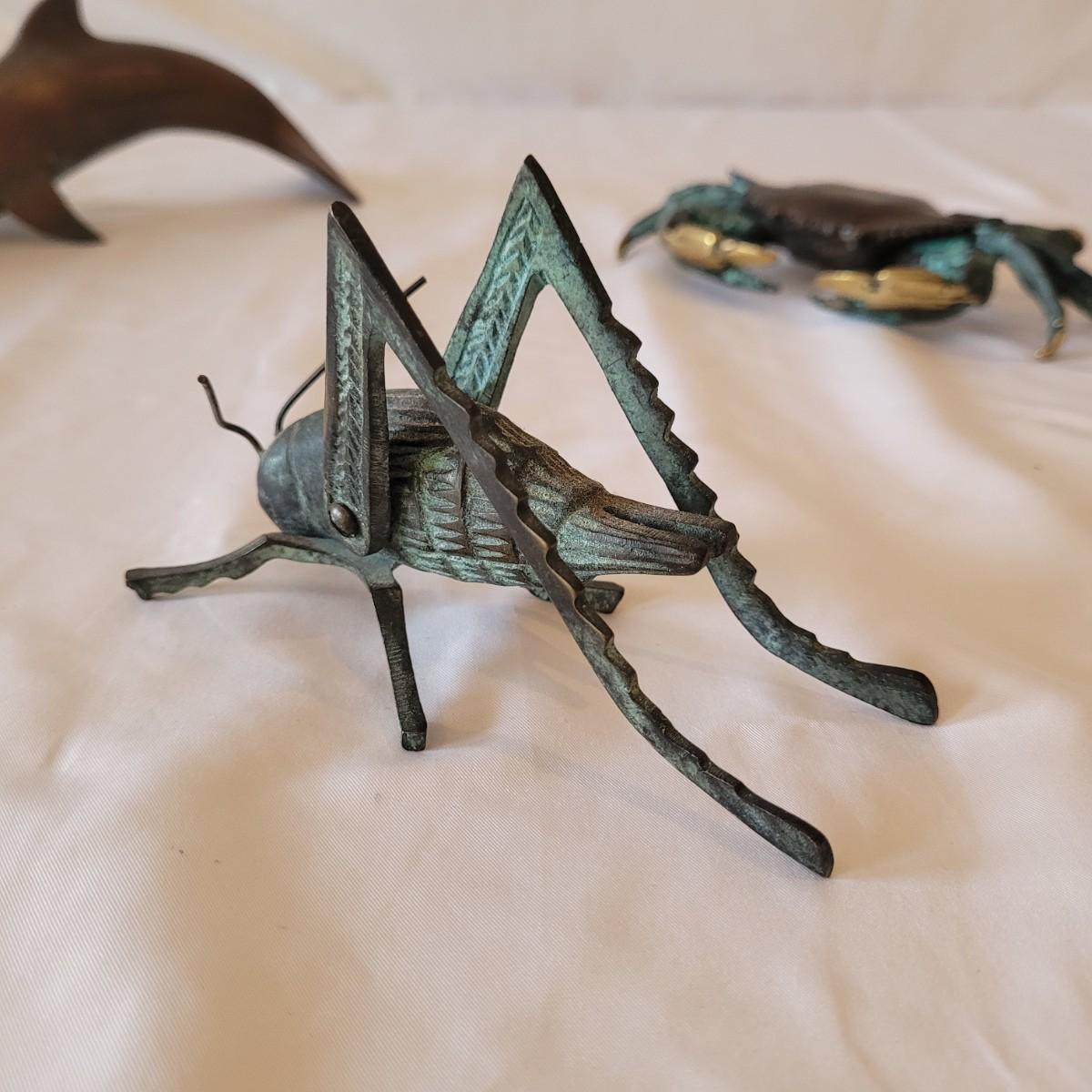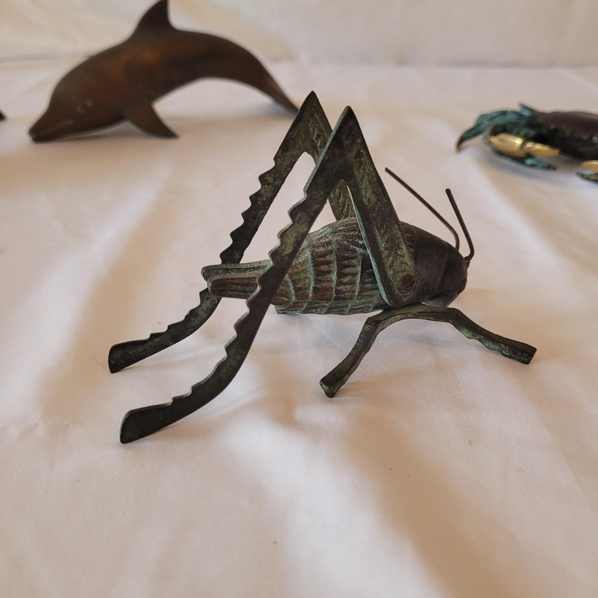 A collection of metal sculptures including a crab, grasshopper and two dolphins. Appear to be brass. Dolphins measure approximately 8” x 4”H. Shipping available.