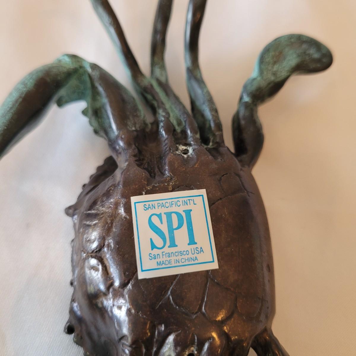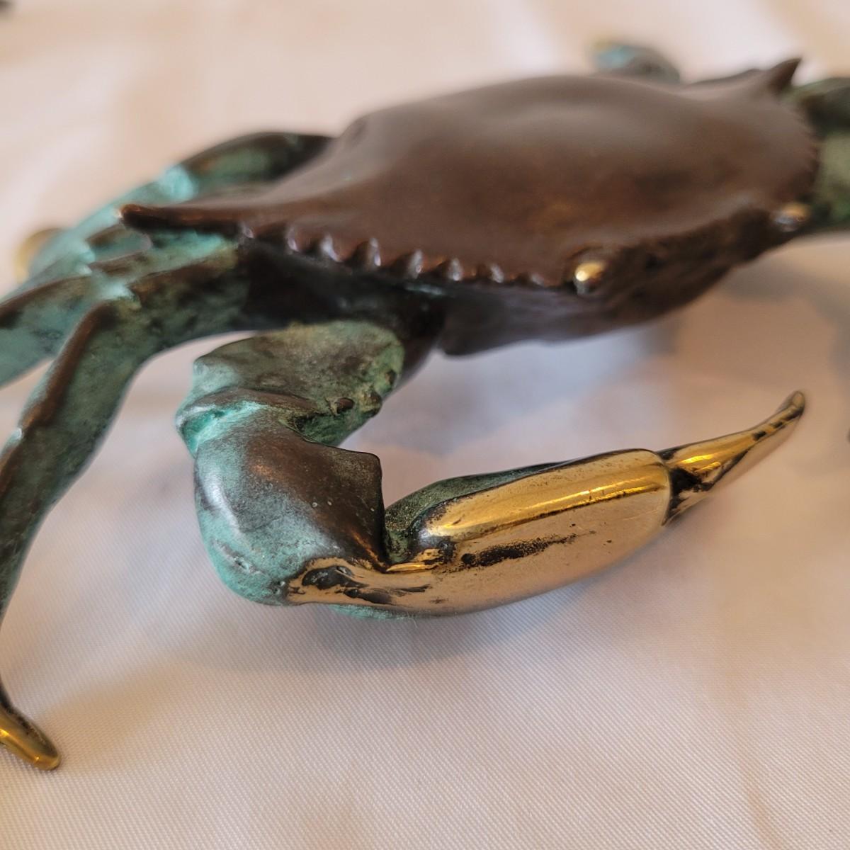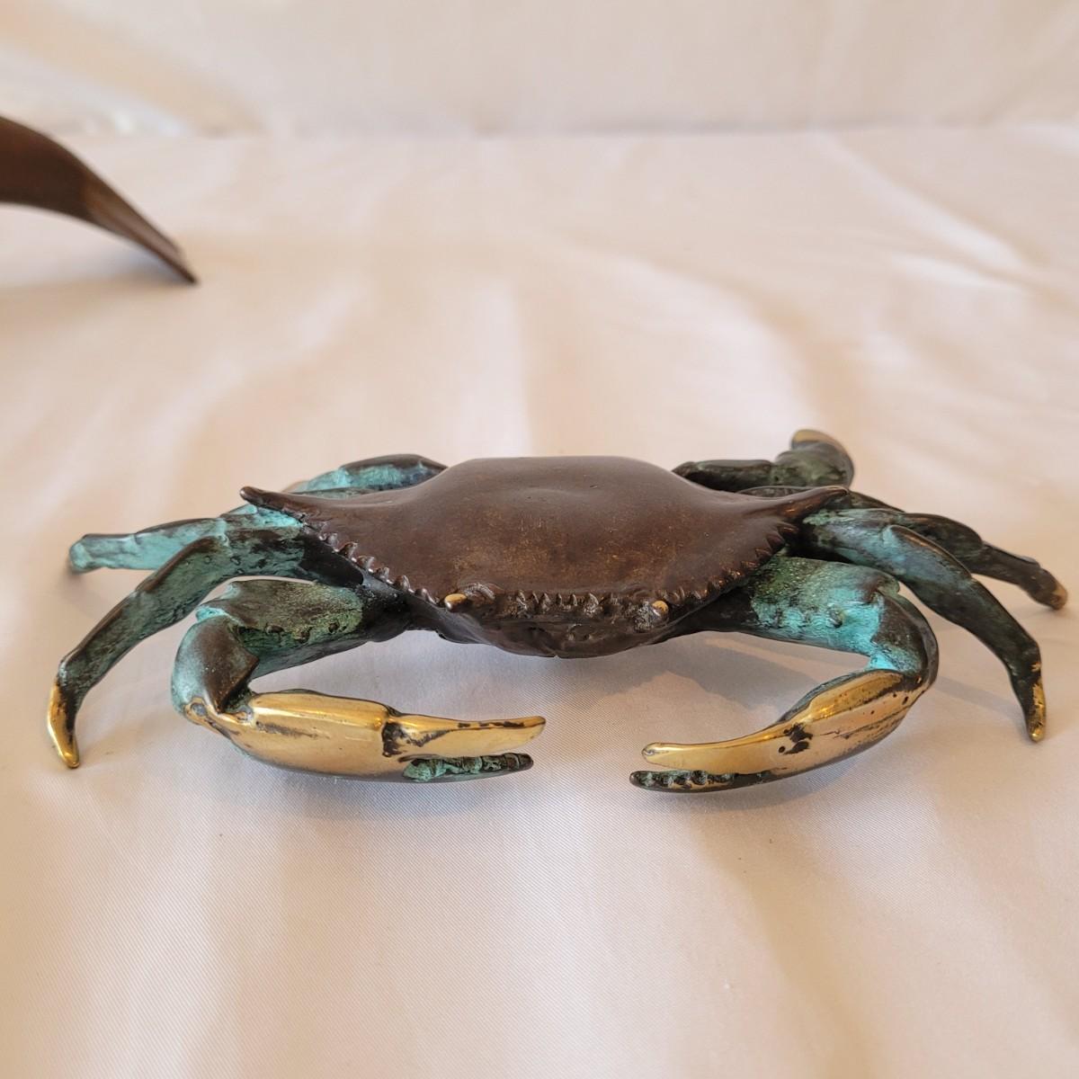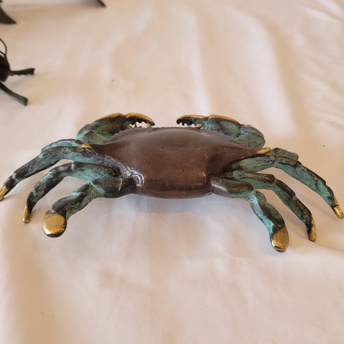 A collection of metal sculptures including a crab, grasshopper and two dolphins. Appear to be brass. Dolphins measure approximately 8” x 4”H. Shipping available.