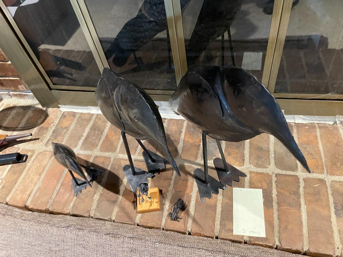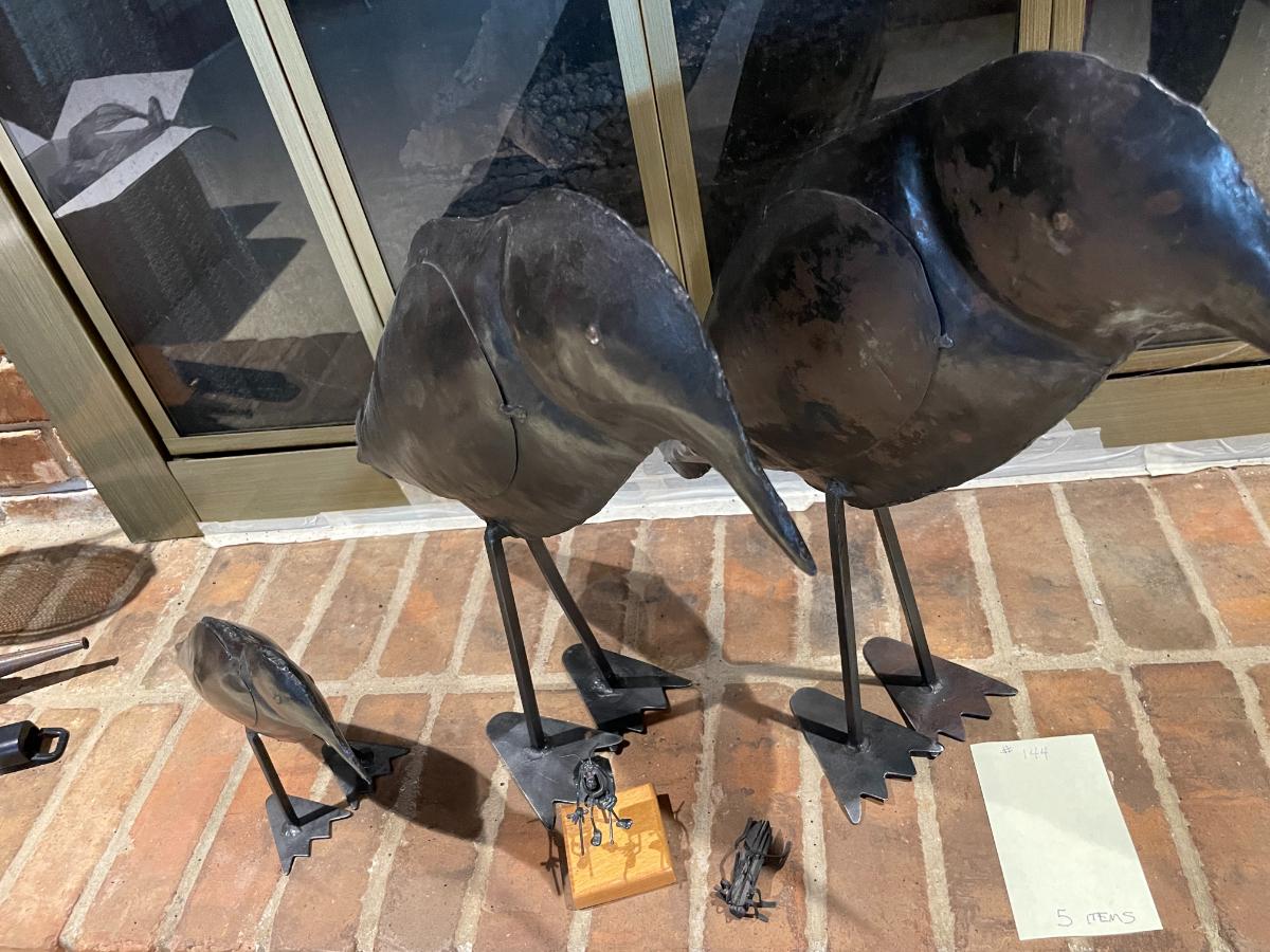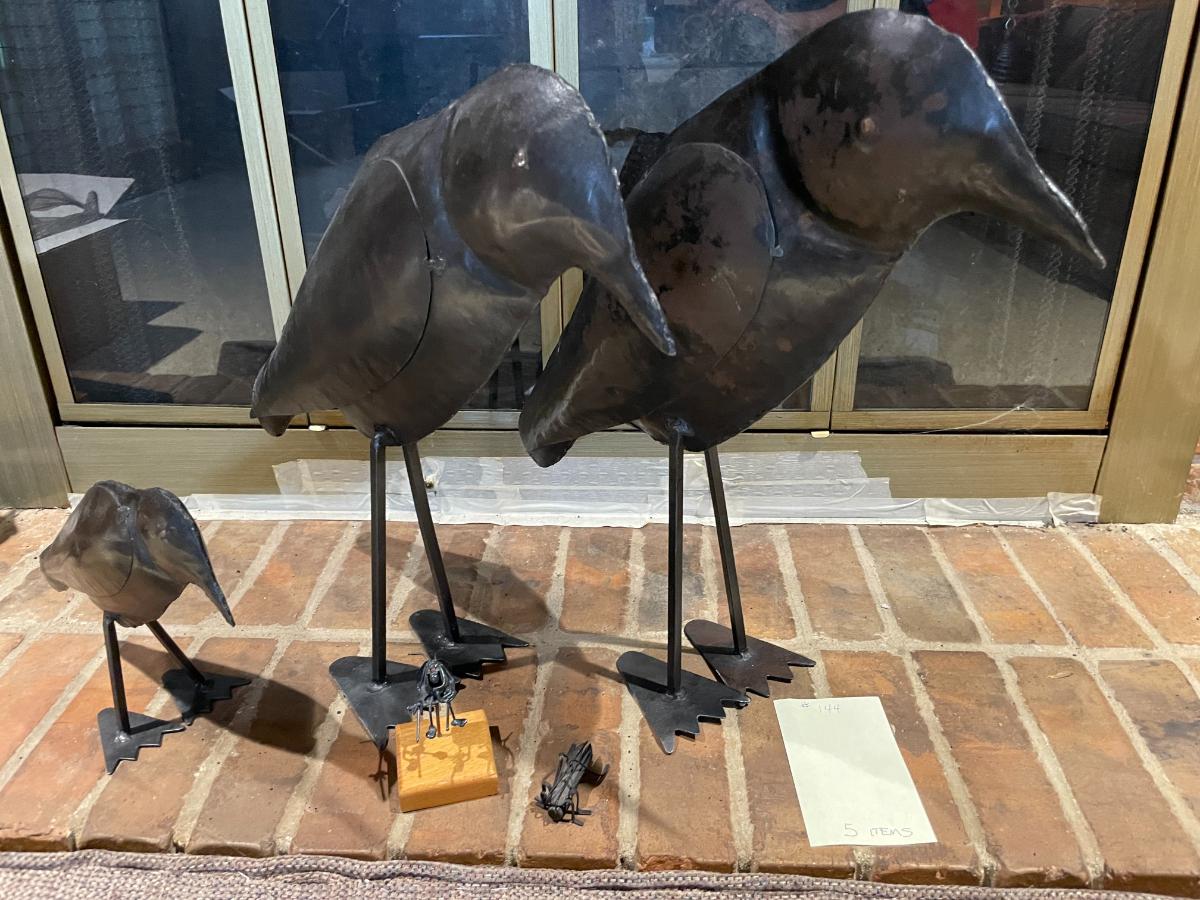 3 large black metal birds, metal grasshopper & metal sand flea