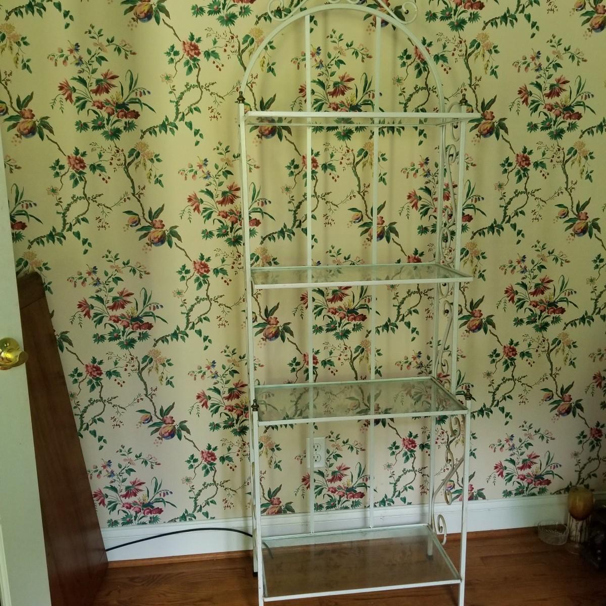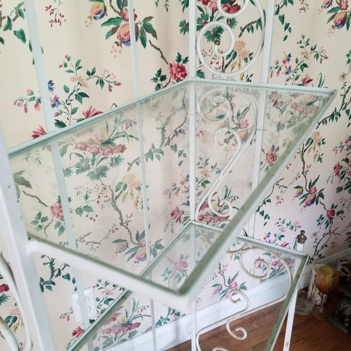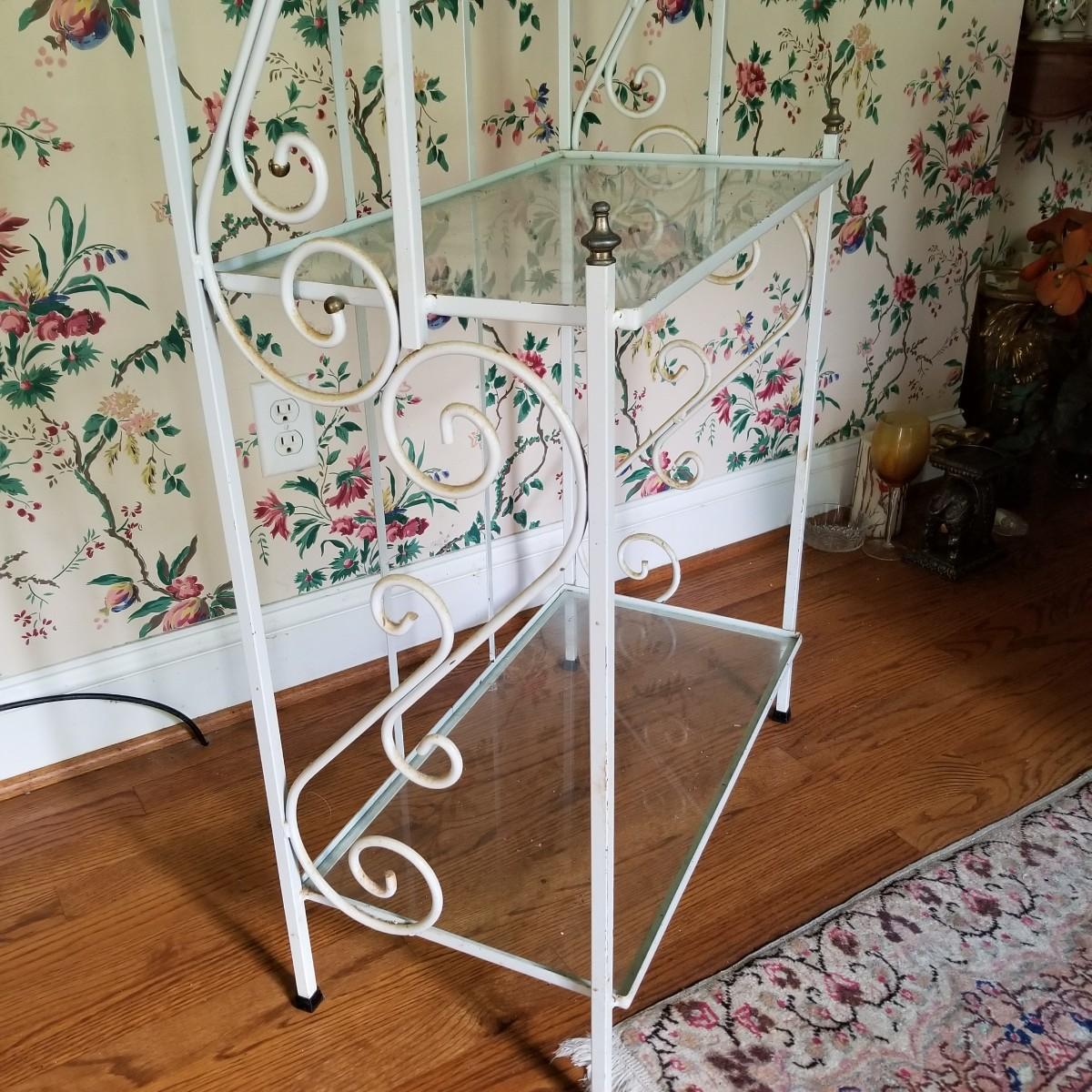 Bakers rack with metal frame and four glass shelves. White in color with gold knob accents. Decorative scroll-work on sides of rack. 24" x 12" x 71.5". Shows normal wear. Local pickup only.
