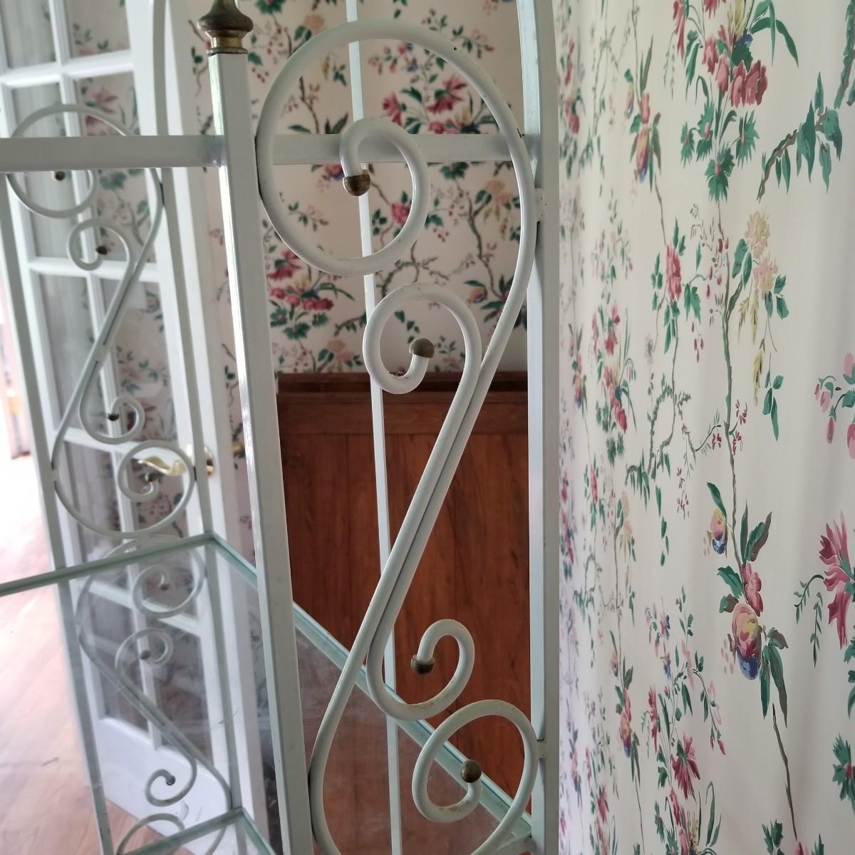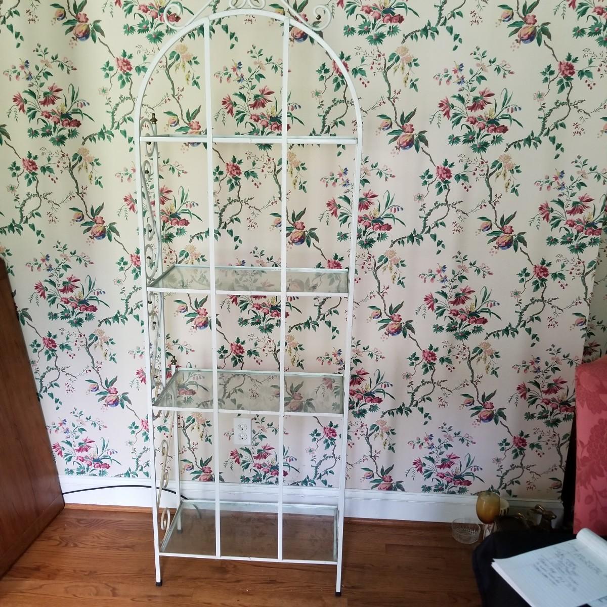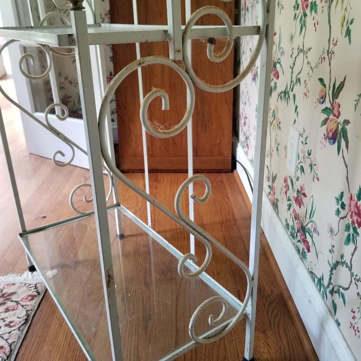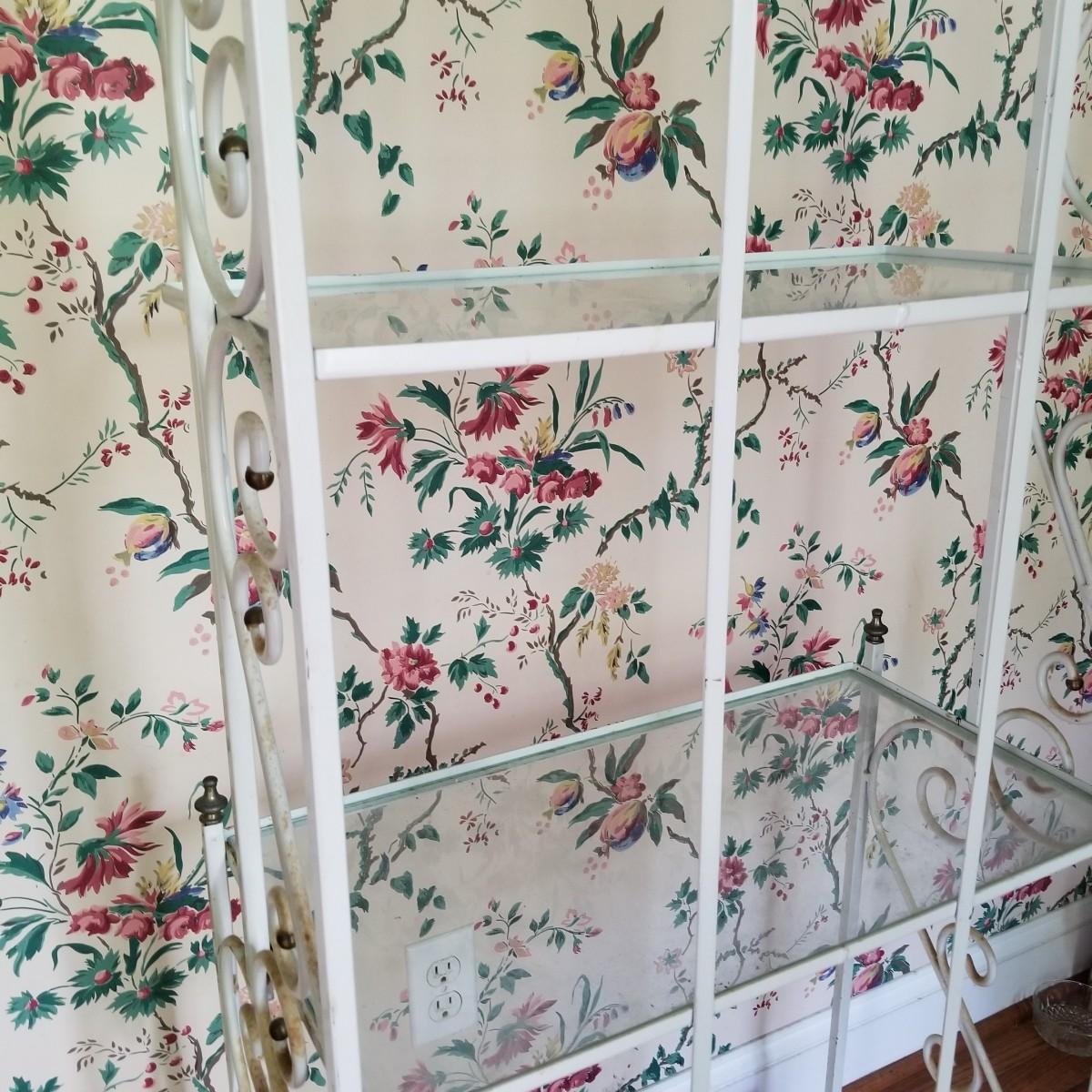 Bakers rack with metal frame and four glass shelves. White in color with gold knob accents. Decorative scroll-work on sides of rack. 24" x 12" x 71.5". Shows normal wear. Local pickup only.