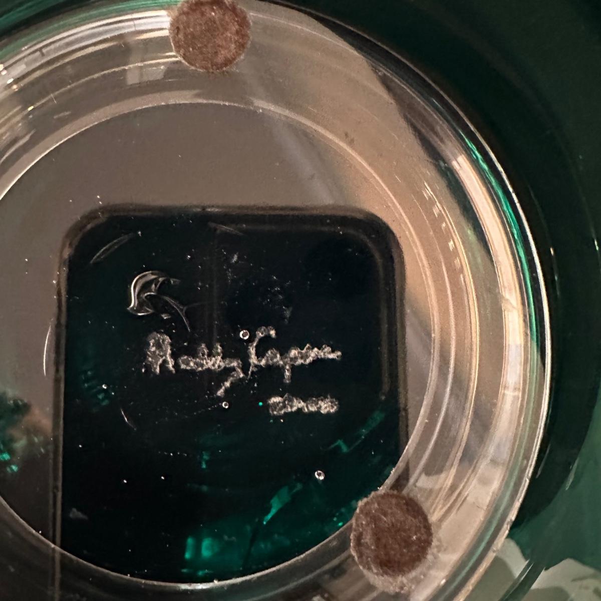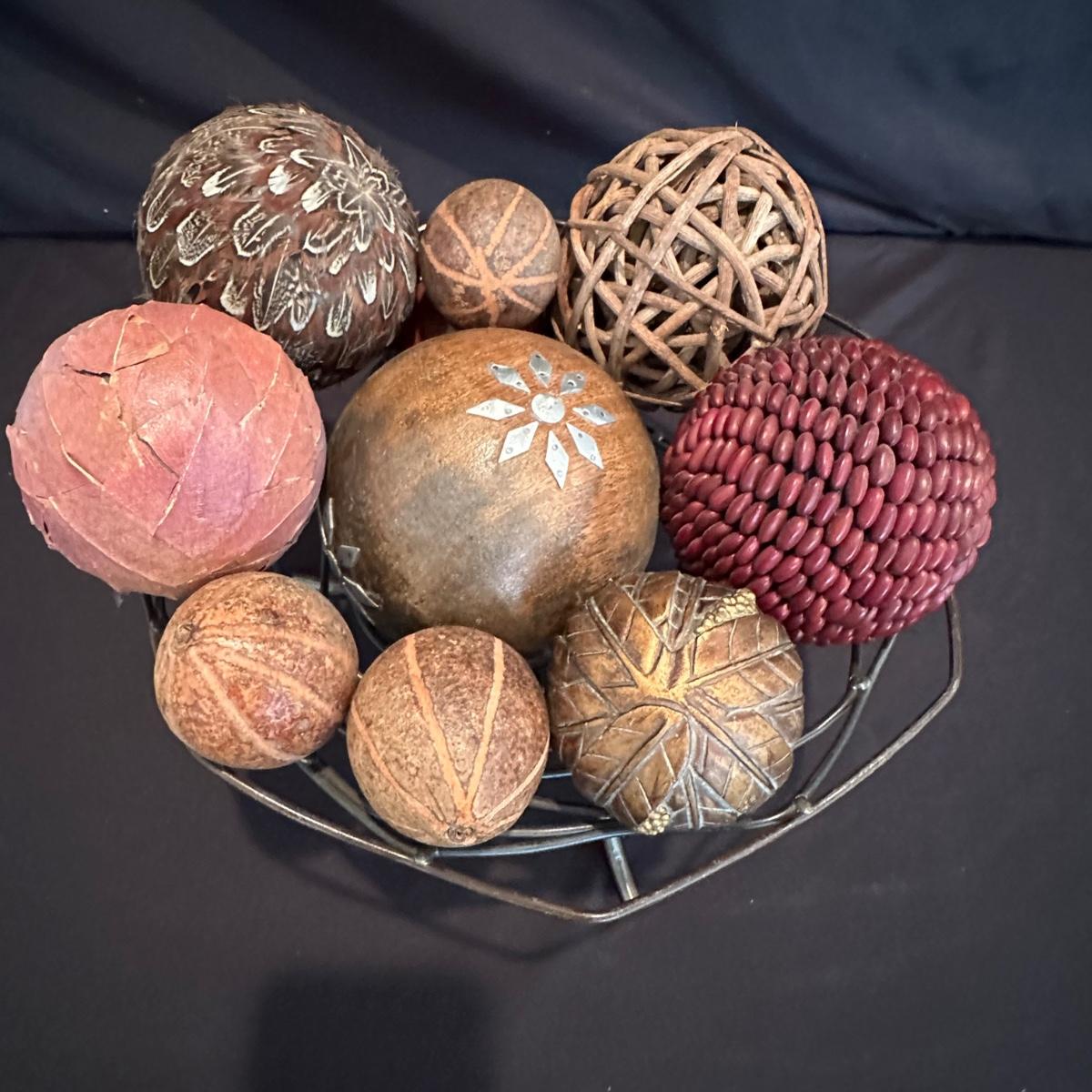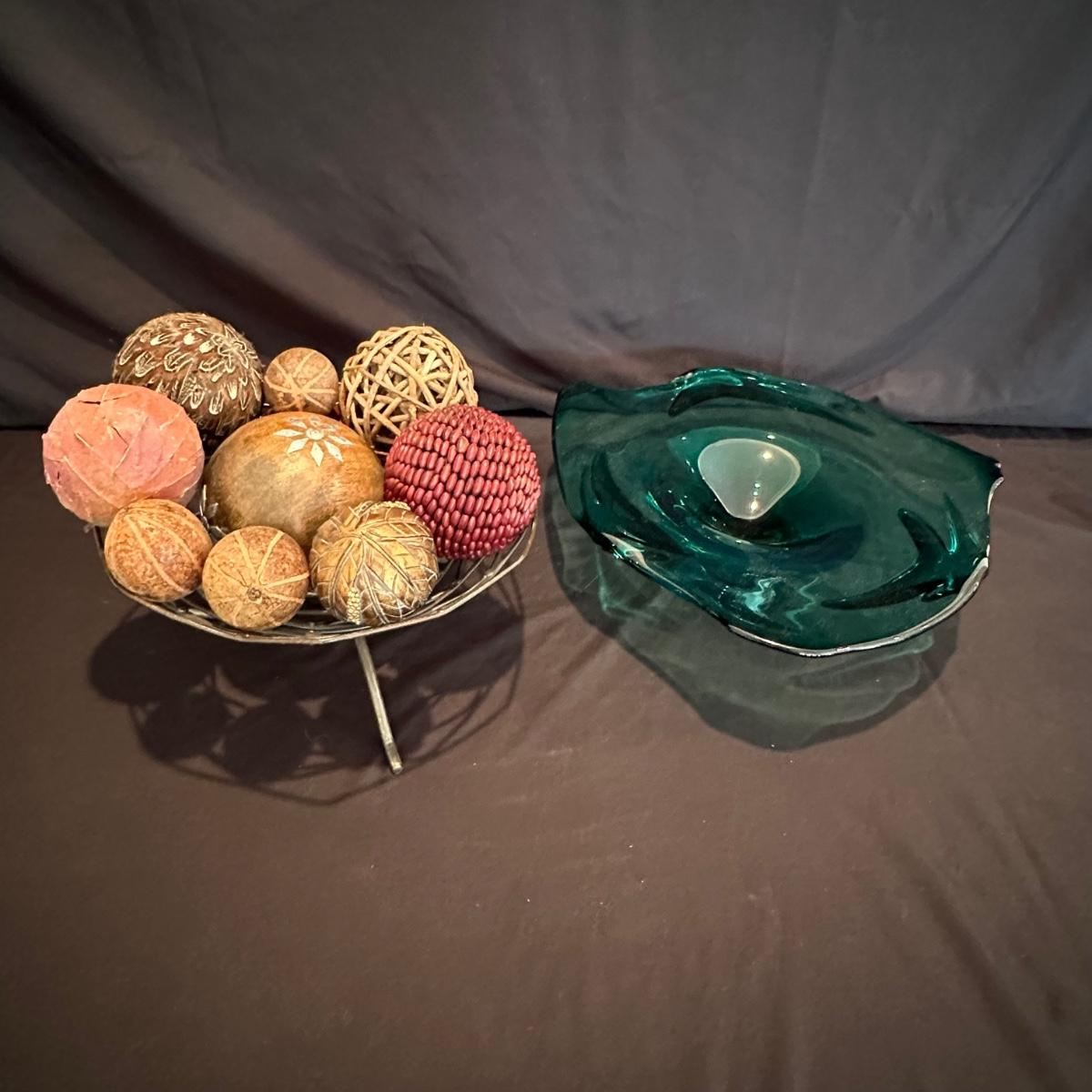 Creative metal basket with decorative multi textured balls. Asymmetrical green glass bowl measures 15.5” x 4”H. Has a blurred marking on the base that appears to be a signature. Shipping available.
