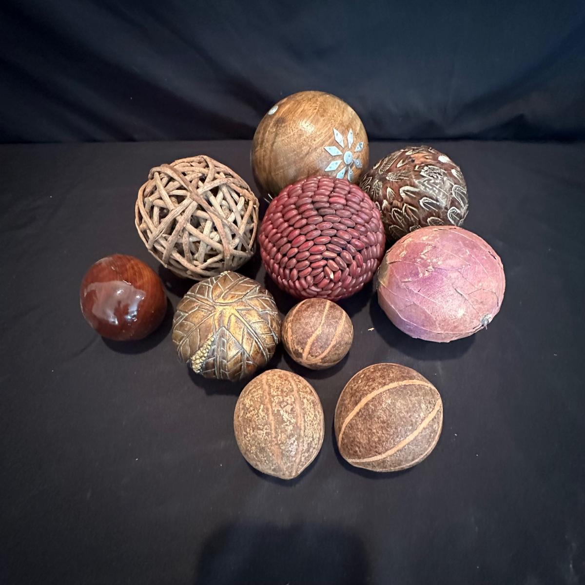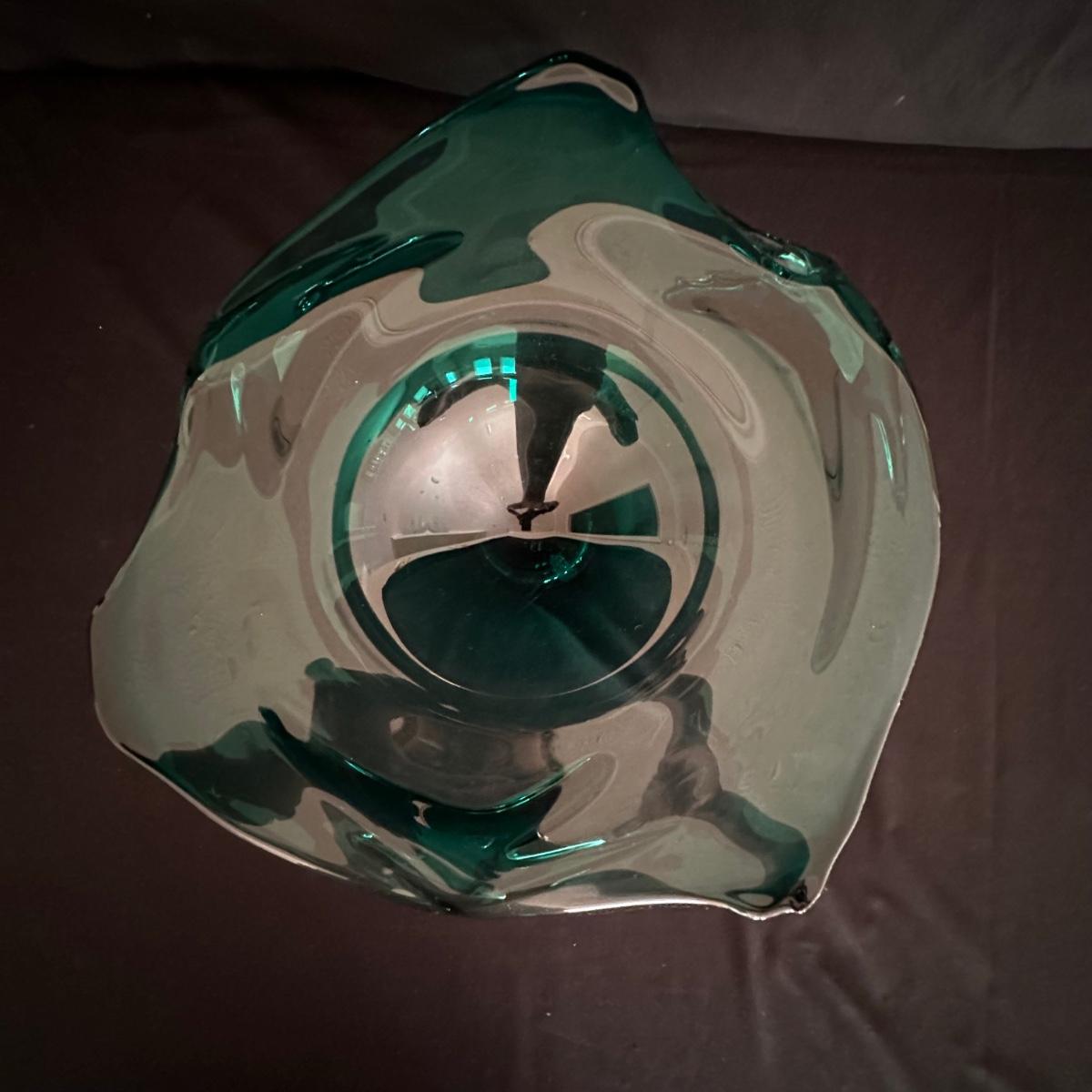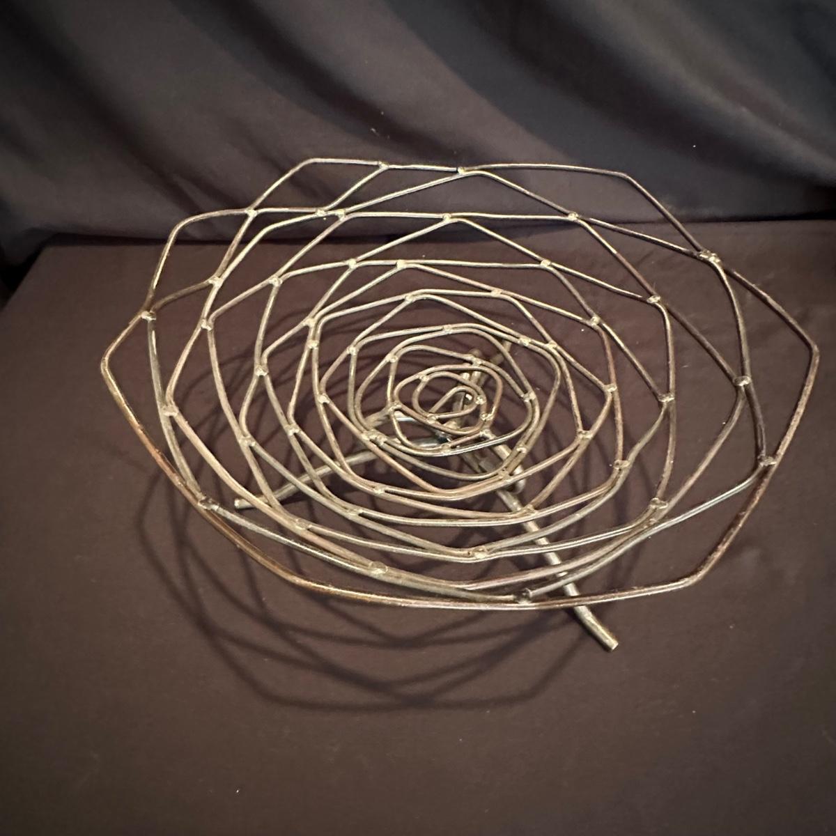 Creative metal basket with decorative multi textured balls. Asymmetrical green glass bowl measures 15.5” x 4”H. Has a blurred marking on the base that appears to be a signature. Shipping available.