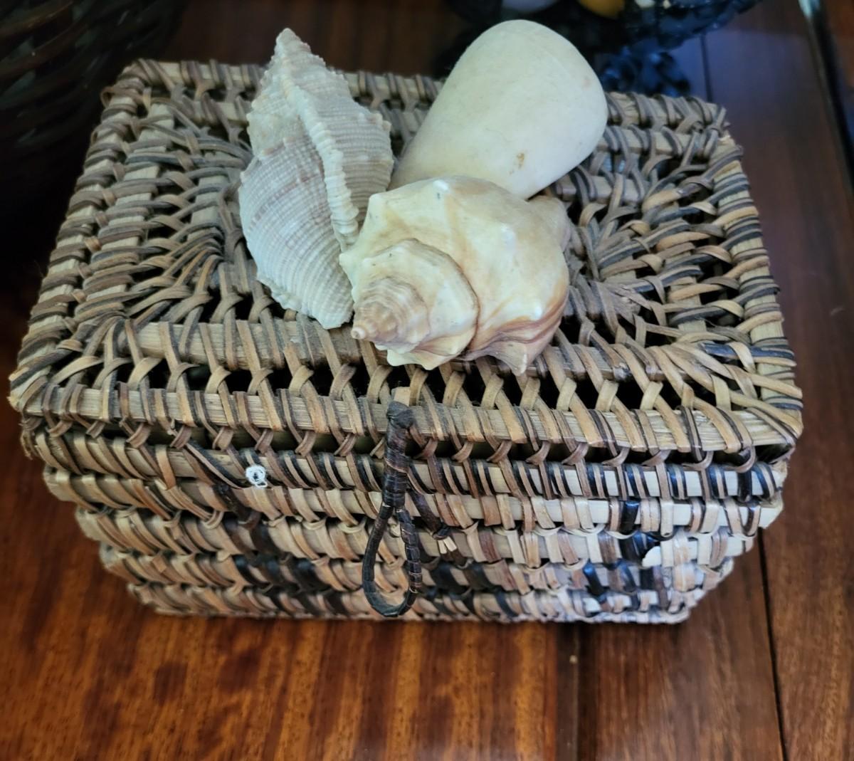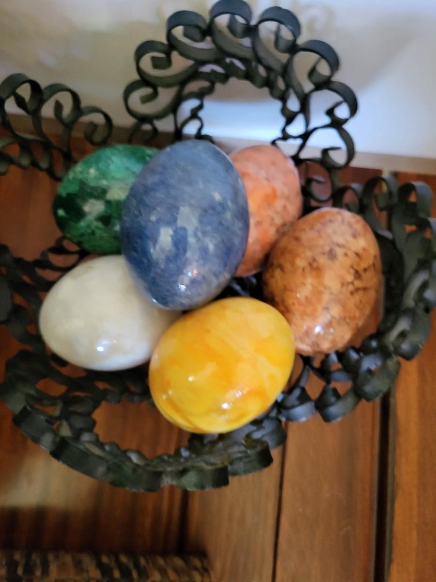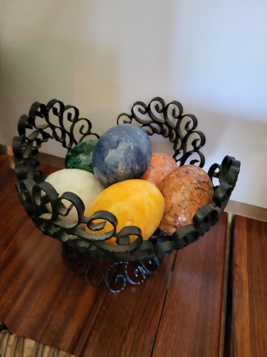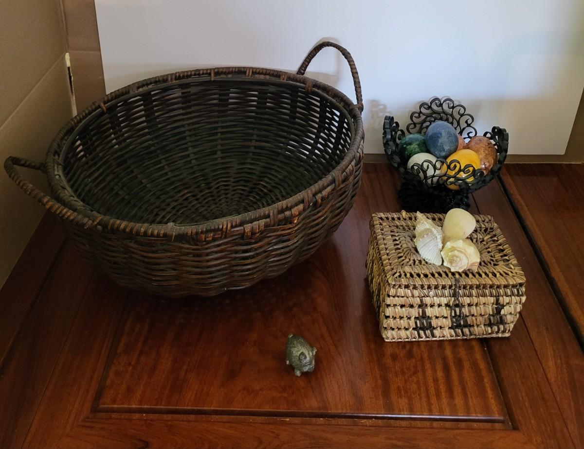METAL BASKET W/MARBLE EGGS, HAND WOVEN BASKET, PEWTER PIG AND WEAVED BOX