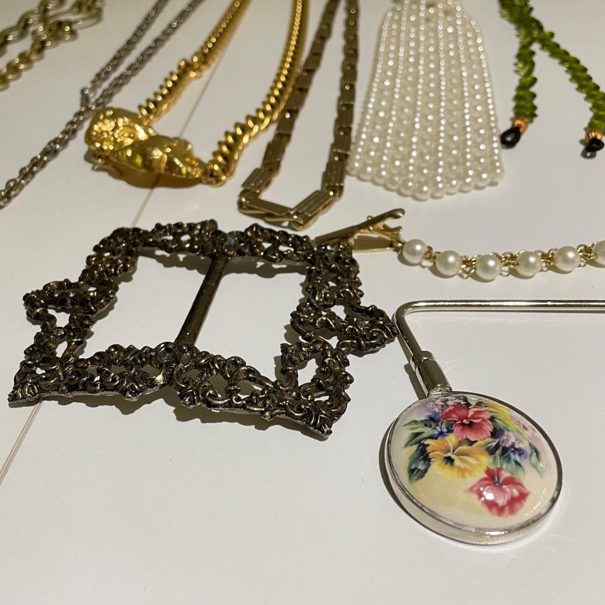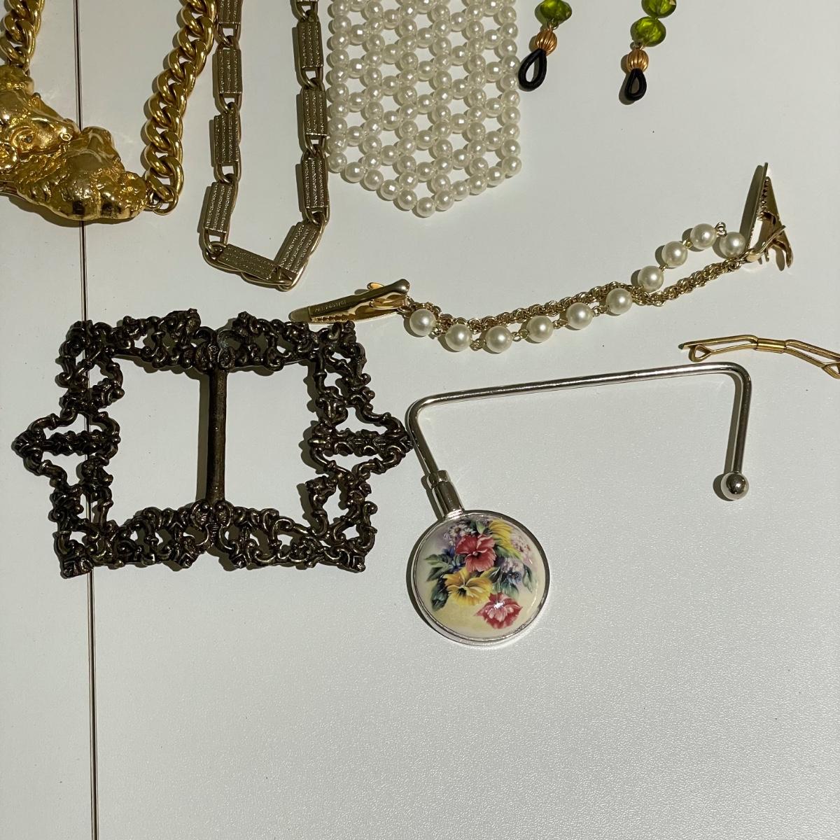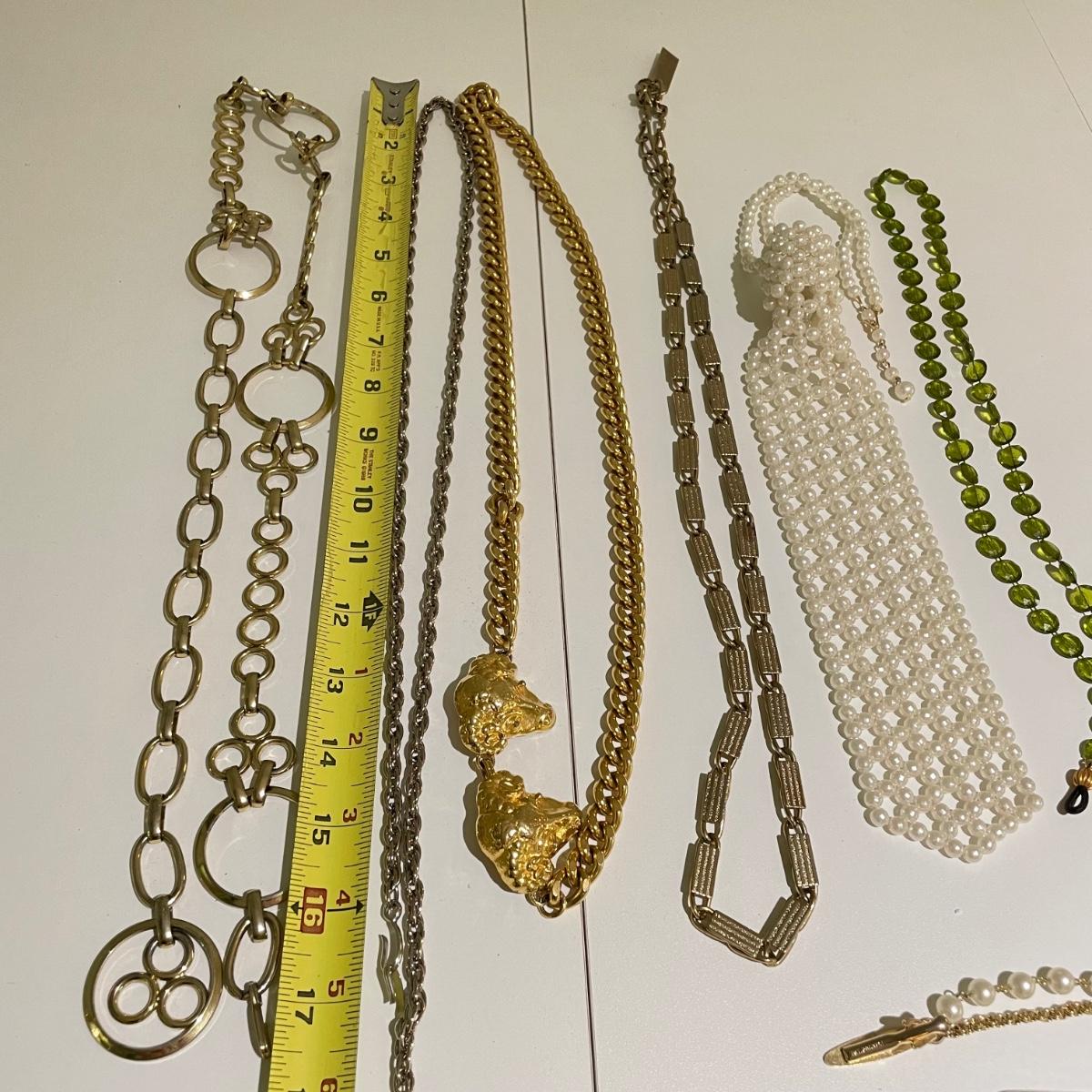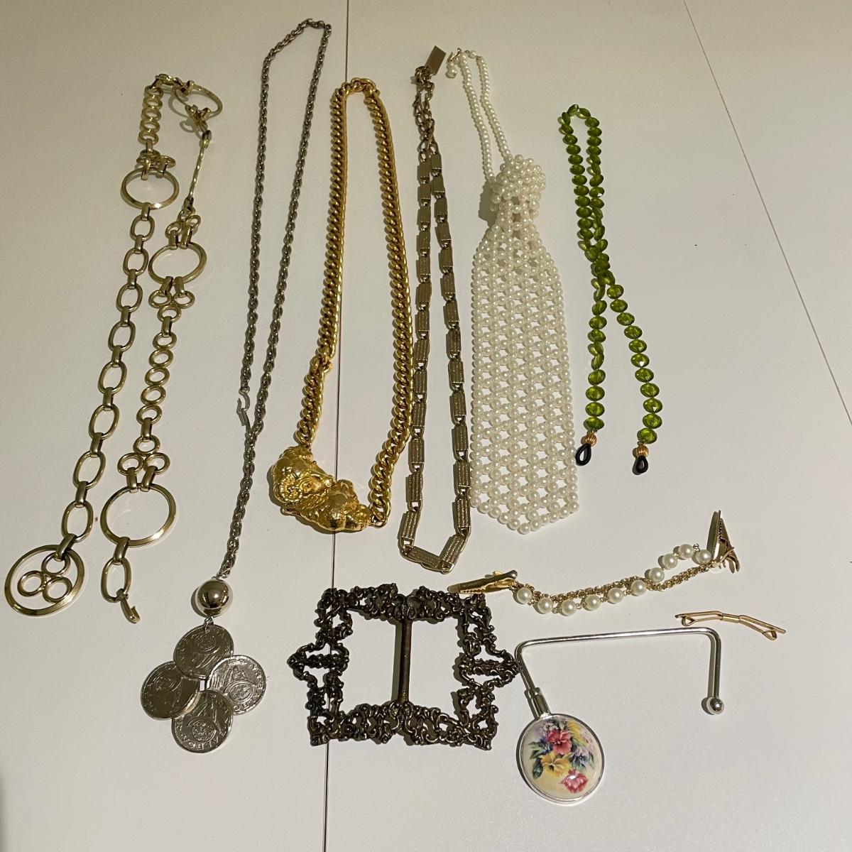 Four metal belts, about 34” when clasped. Lot also contains a metal belt buckle, a pearled cincher, a purse hook, collar clip, pearly tie and glasses holder. See images. Shipping available.