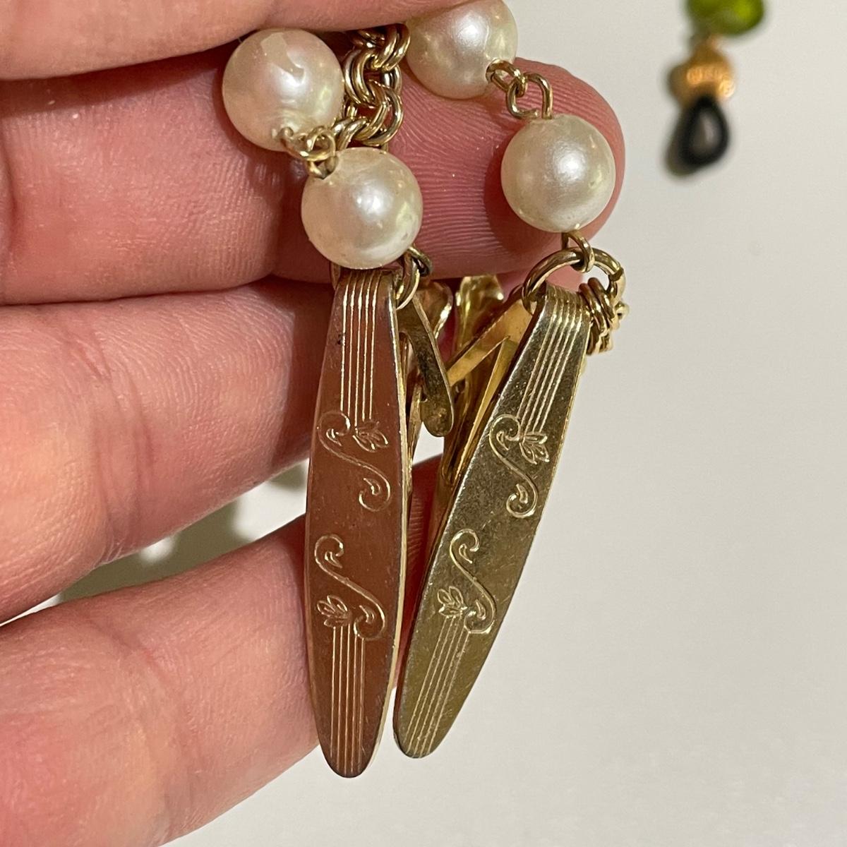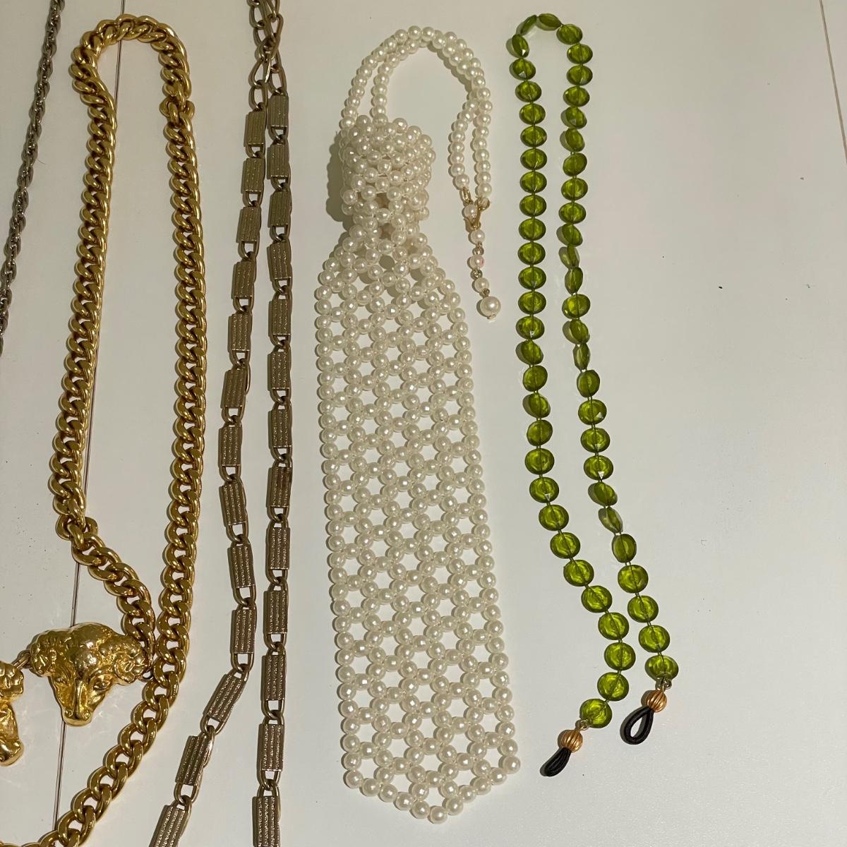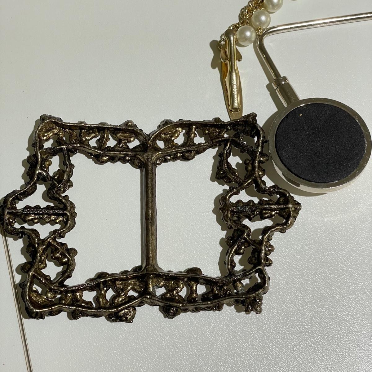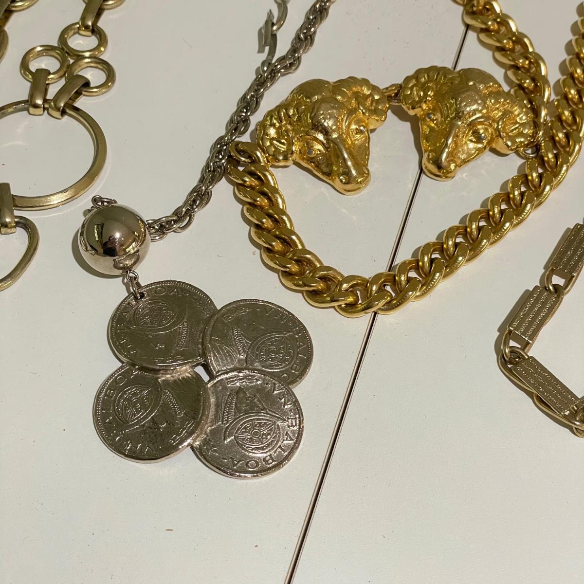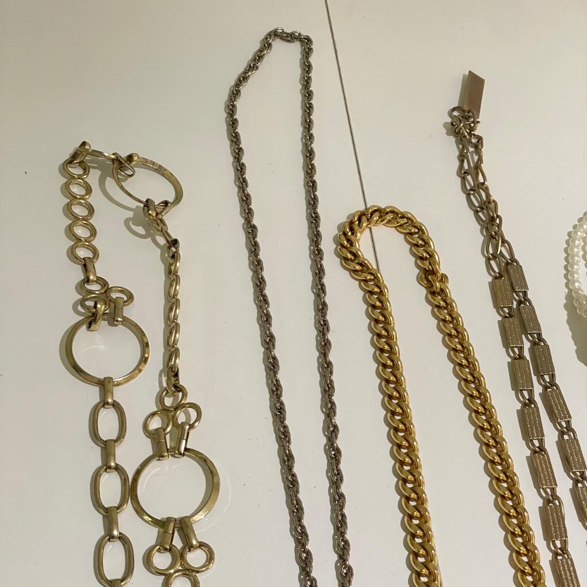 Four metal belts, about 34” when clasped. Lot also contains a metal belt buckle, a pearled cincher, a purse hook, collar clip, pearly tie and glasses holder. See images. Shipping available.