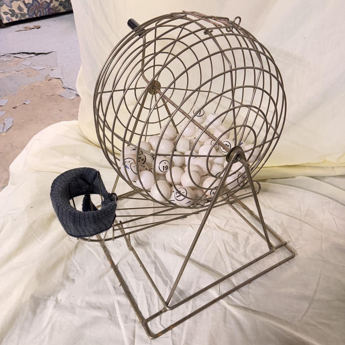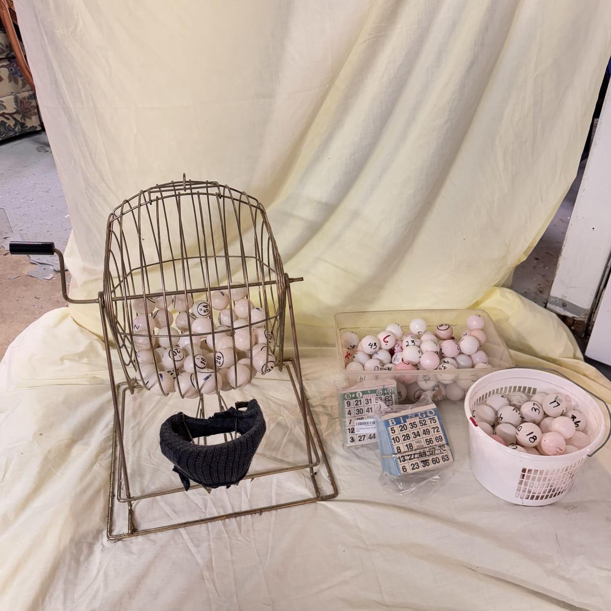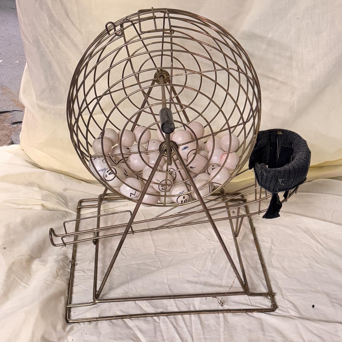 Lot includes one functioning metal bingo cage with several numbered ping pong balls, two bins/buckets of numbered ping pong balls, and two decks of unused bingo cards. The metal cage measures 15” x 15” x 19”H. Shipping available. Shipping can be costly. We suggest contacting our preferred local shipping provider, Postage Express, with dimensions and getting an estimate before bidding: (828) 255-9250 or shipping@postageexpressnc.com.