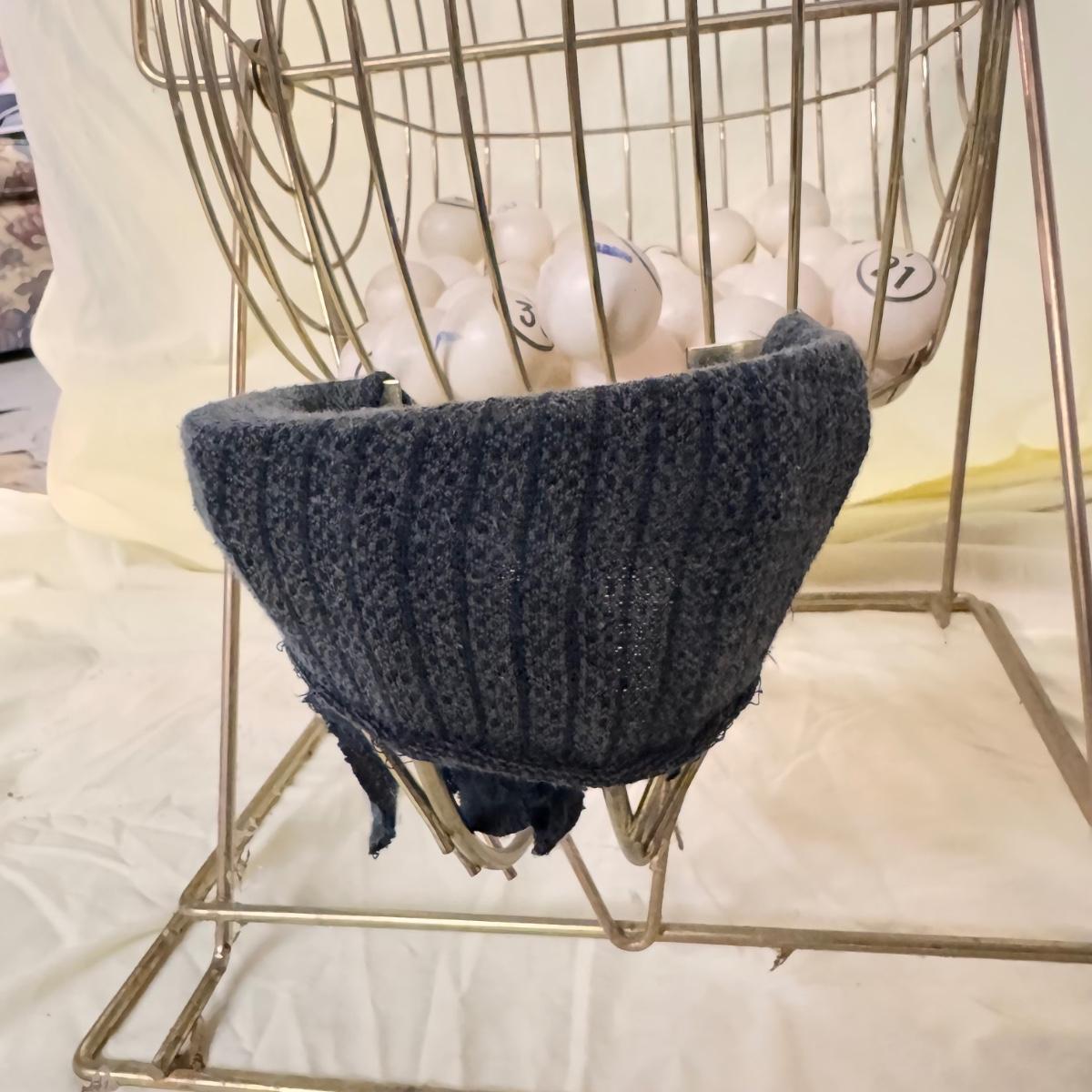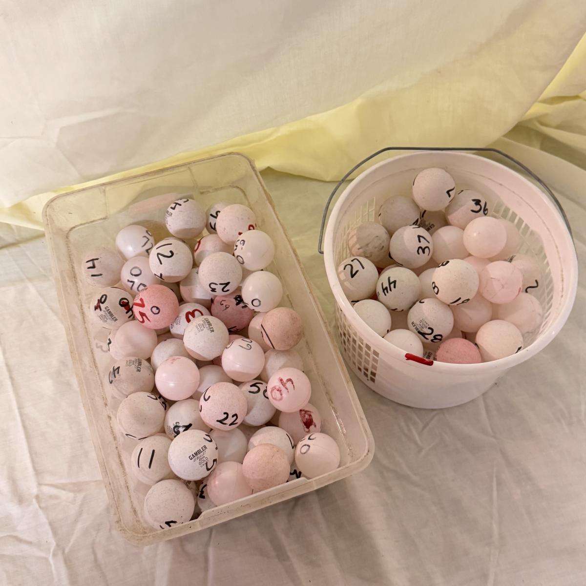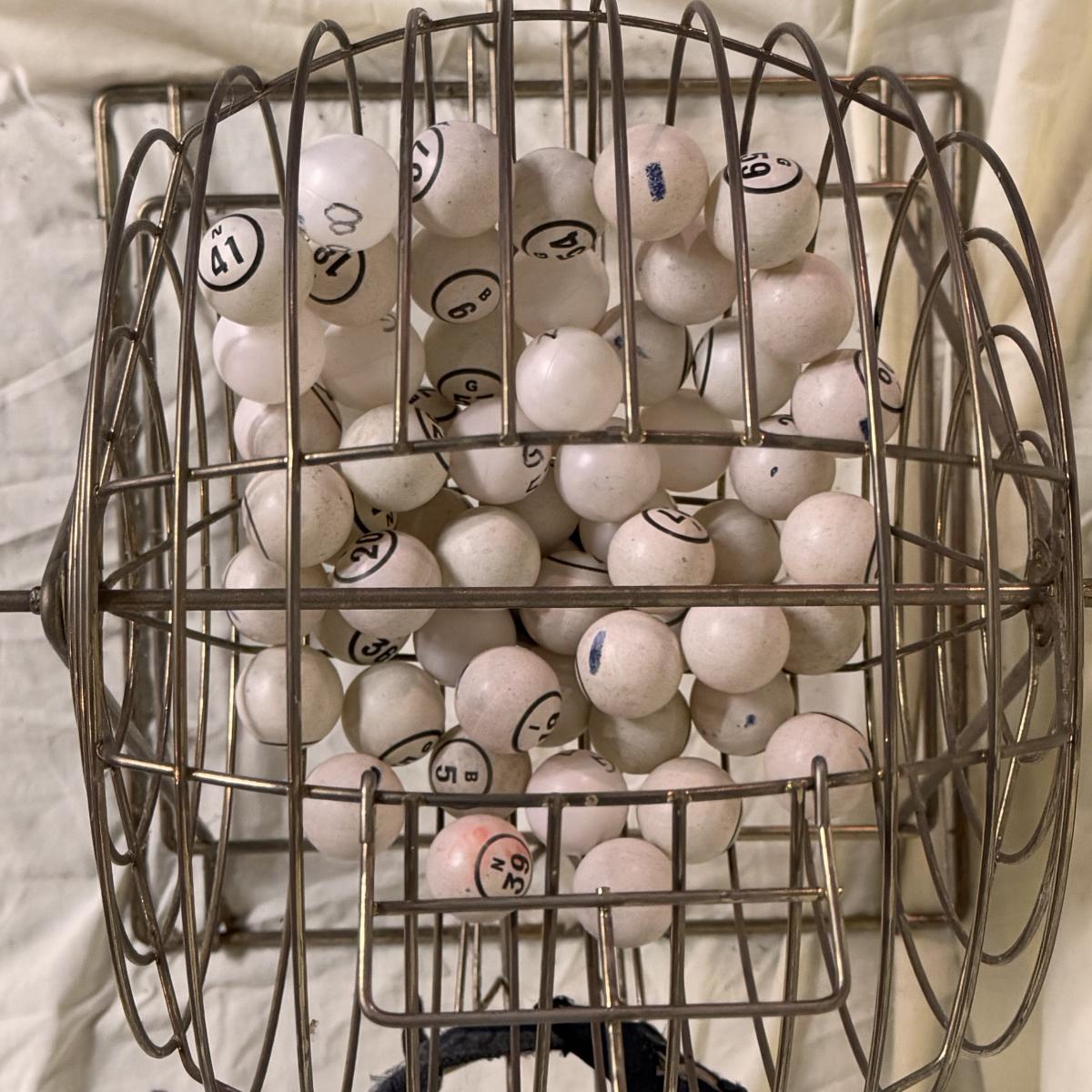Lot includes one functioning metal bingo cage with several numbered ping pong balls, two bins/buckets of numbered ping pong balls, and two decks of unused bingo cards. The metal cage measures 15” x 15” x 19”H. Shipping available. Shipping can be costly. We suggest contacting our preferred local shipping provider, Postage Express, with dimensions and getting an estimate before bidding: (828) 255-9250 or shipping@postageexpressnc.com.