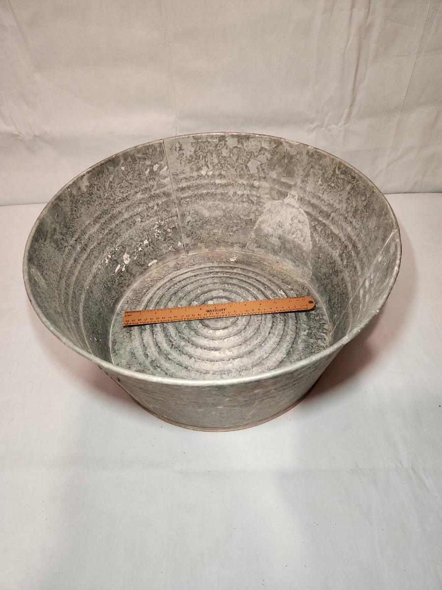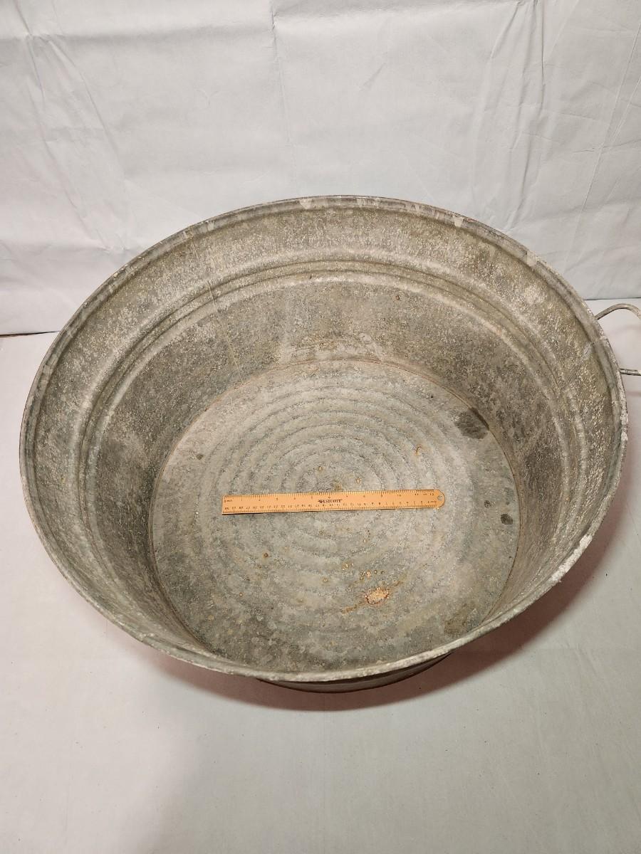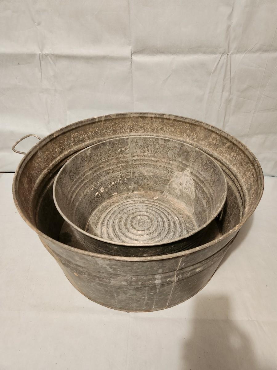 2 washtubs. The larger one is 24 in round and 12 in high. The smaller one is 18 in around and 9 in high.