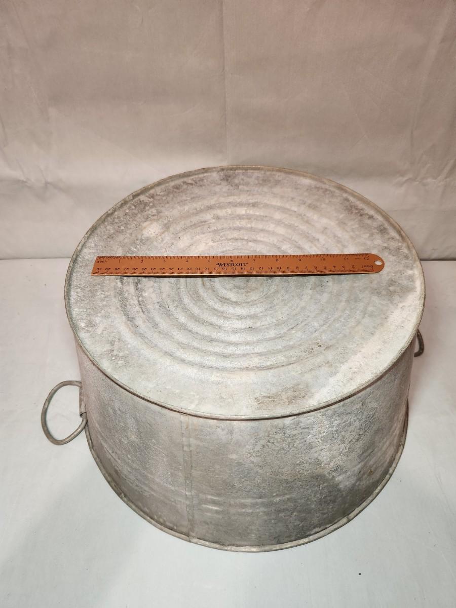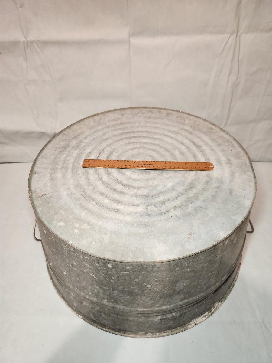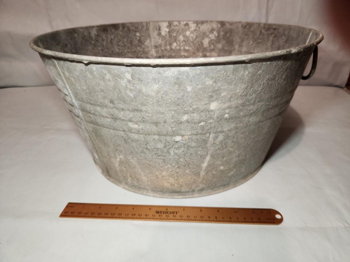 2 washtubs. The larger one is 24 in round and 12 in high. The smaller one is 18 in around and 9 in high.