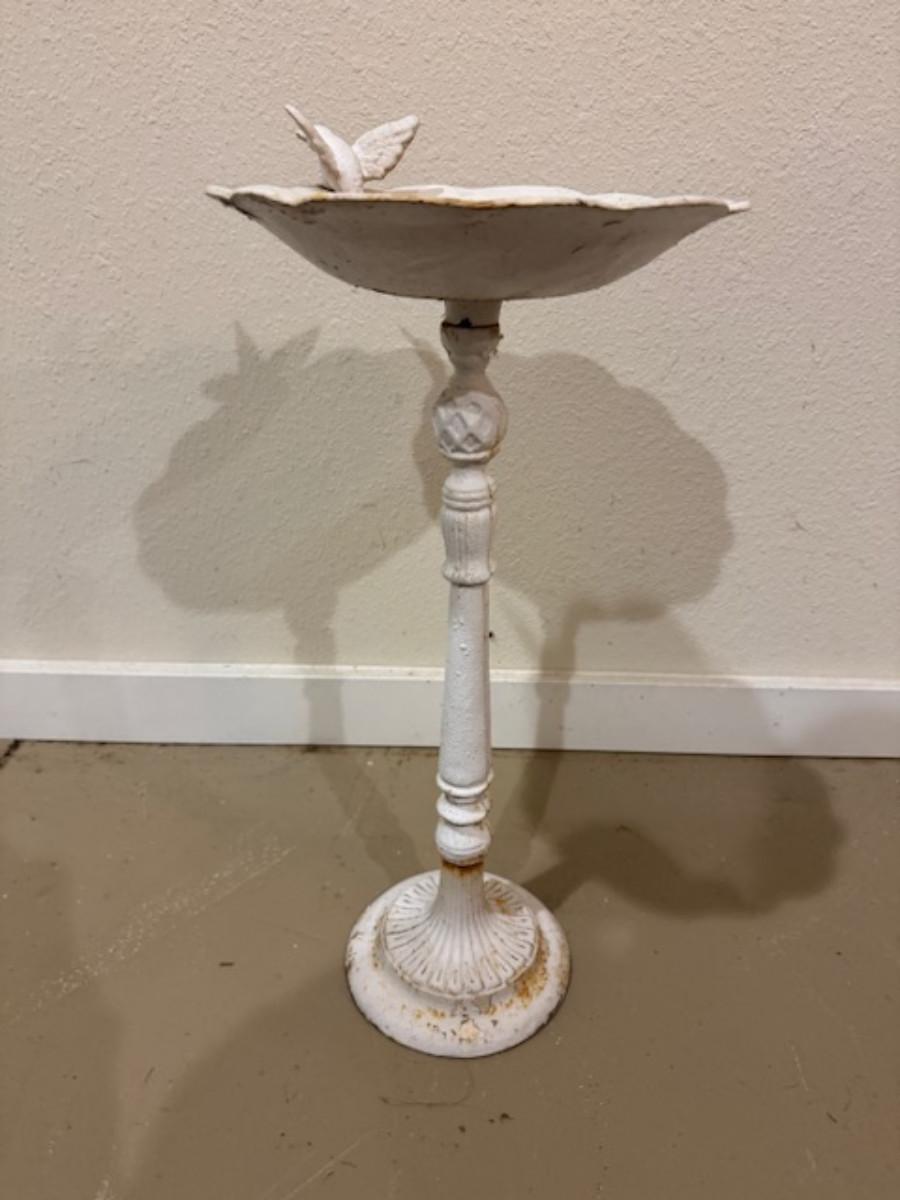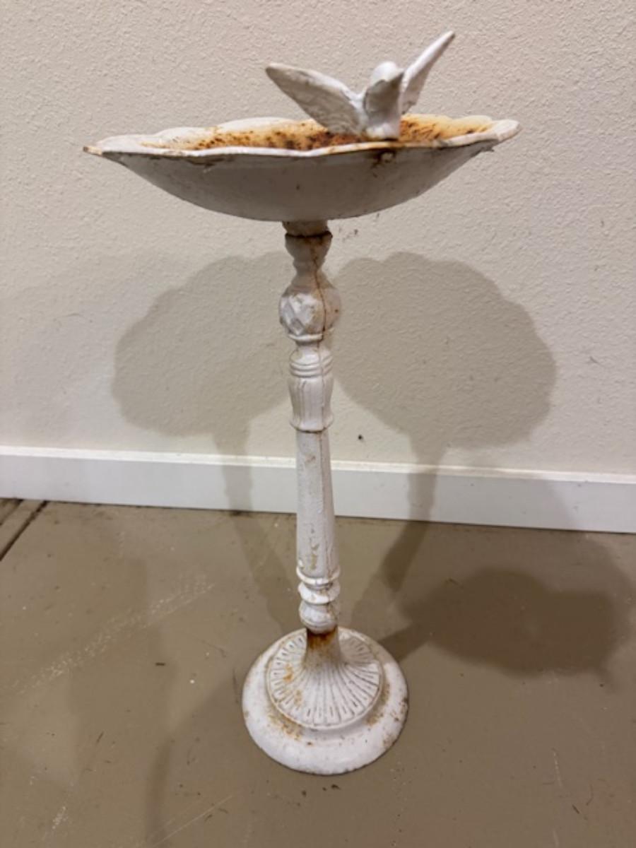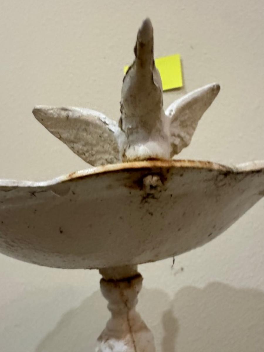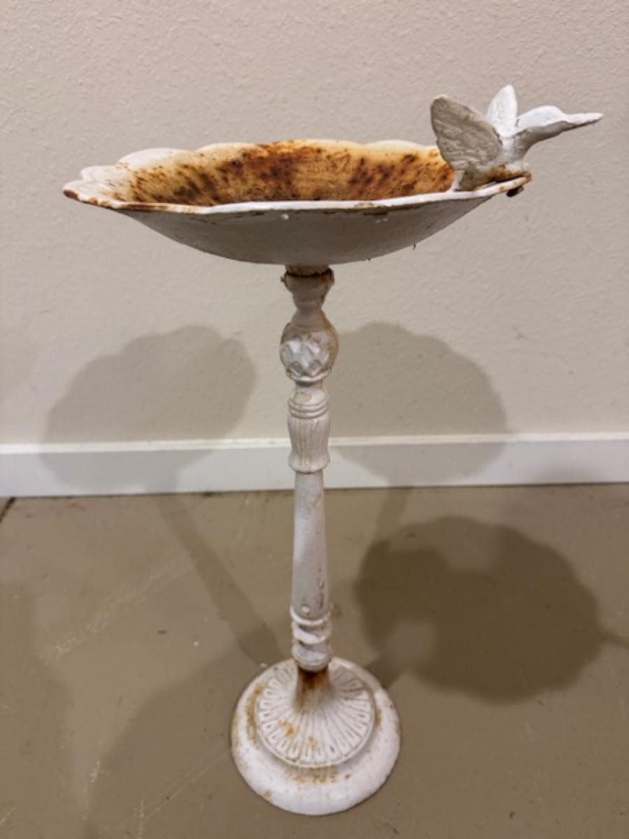 Metal Bird Bath. 22" top bowl, 24" to the top of the bird, 10.5" diameter bowl. Seems to be dirty or rusted in the bowl and in other places. See pics. As is.