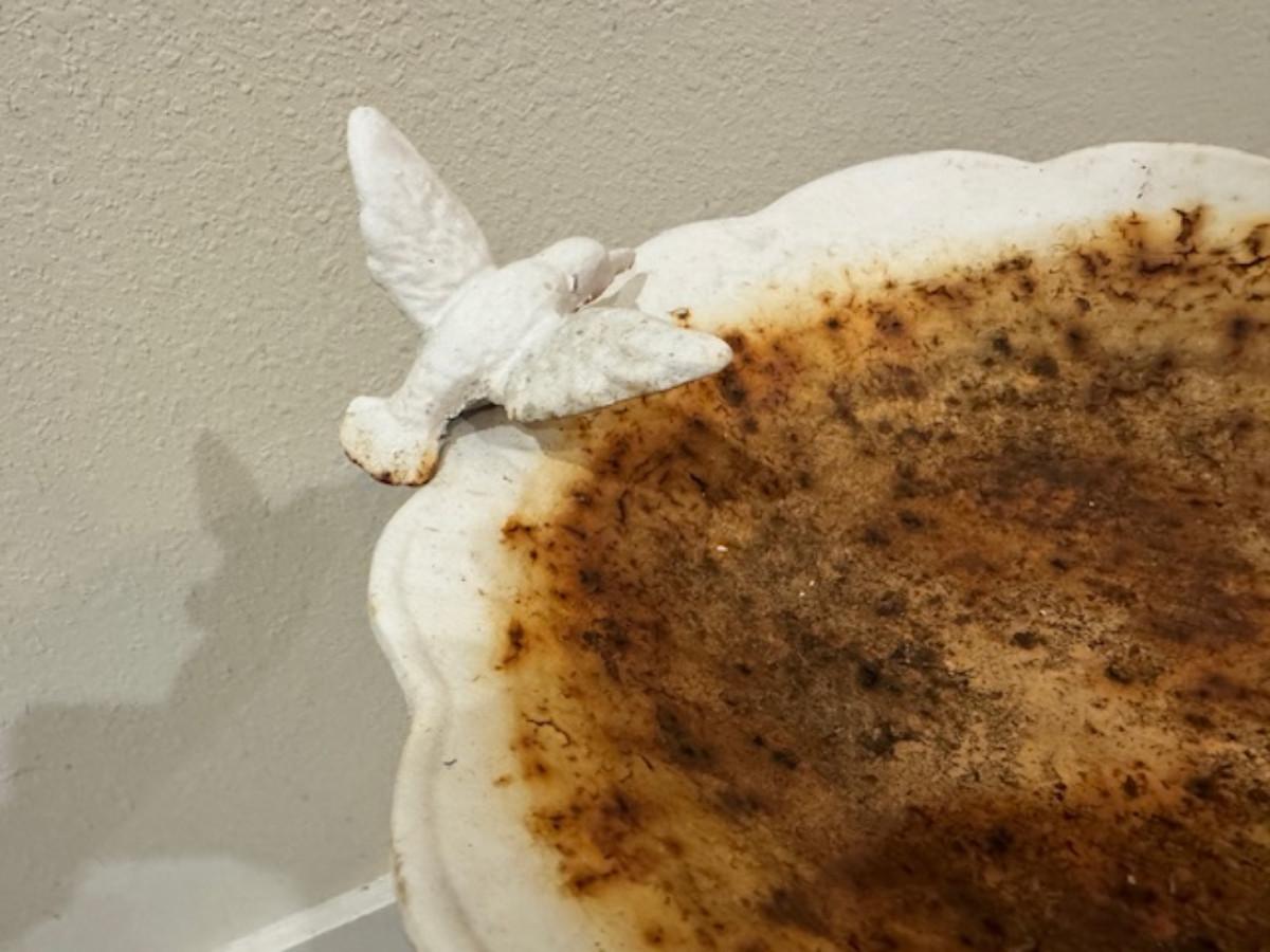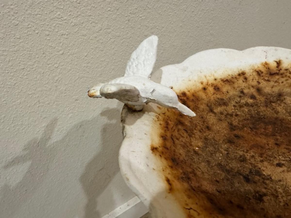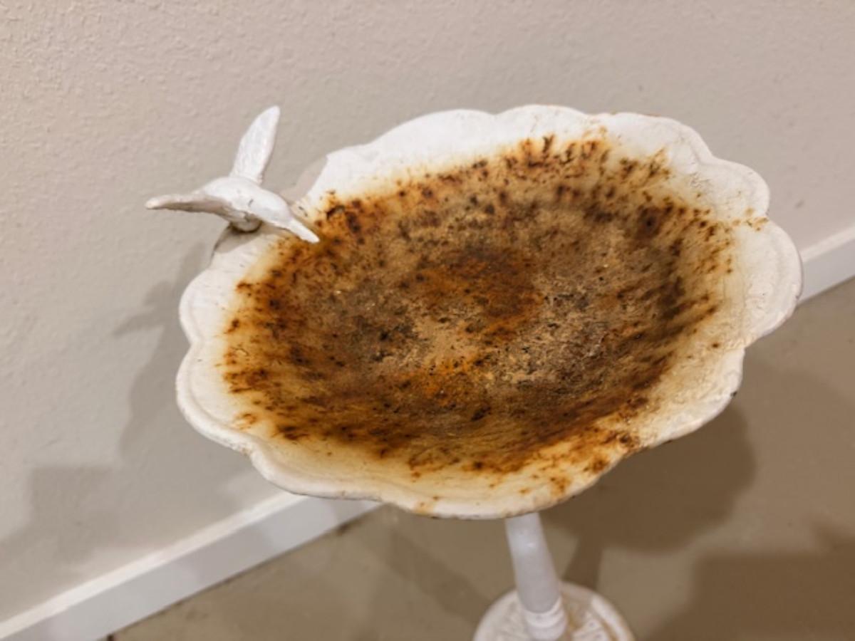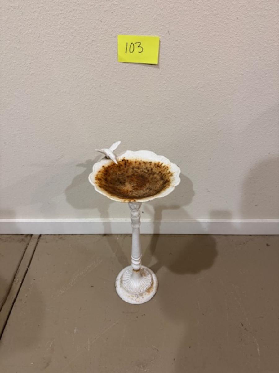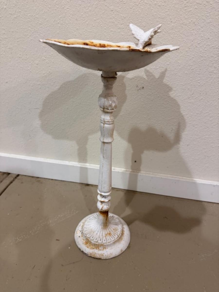 Metal Bird Bath. 22" top bowl, 24" to the top of the bird, 10.5" diameter bowl. Seems to be dirty or rusted in the bowl and in other places. See pics. As is.