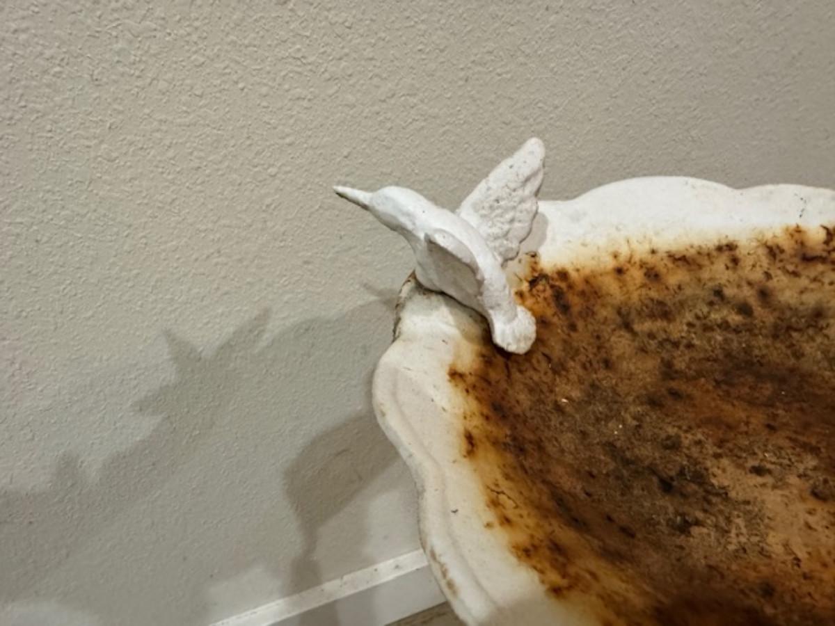 Has a metal bird (humming bird?) that can be moved in circles but attached to bowl.