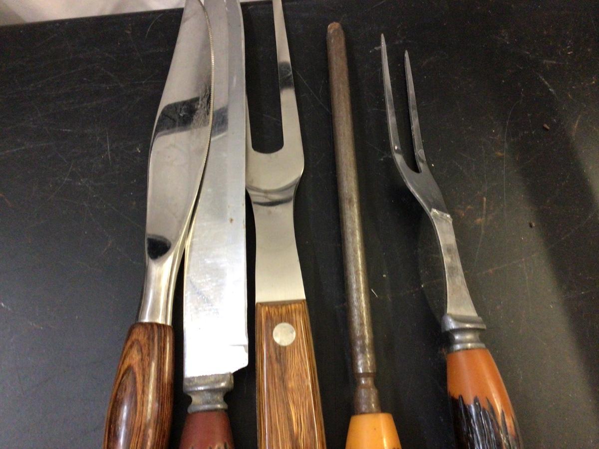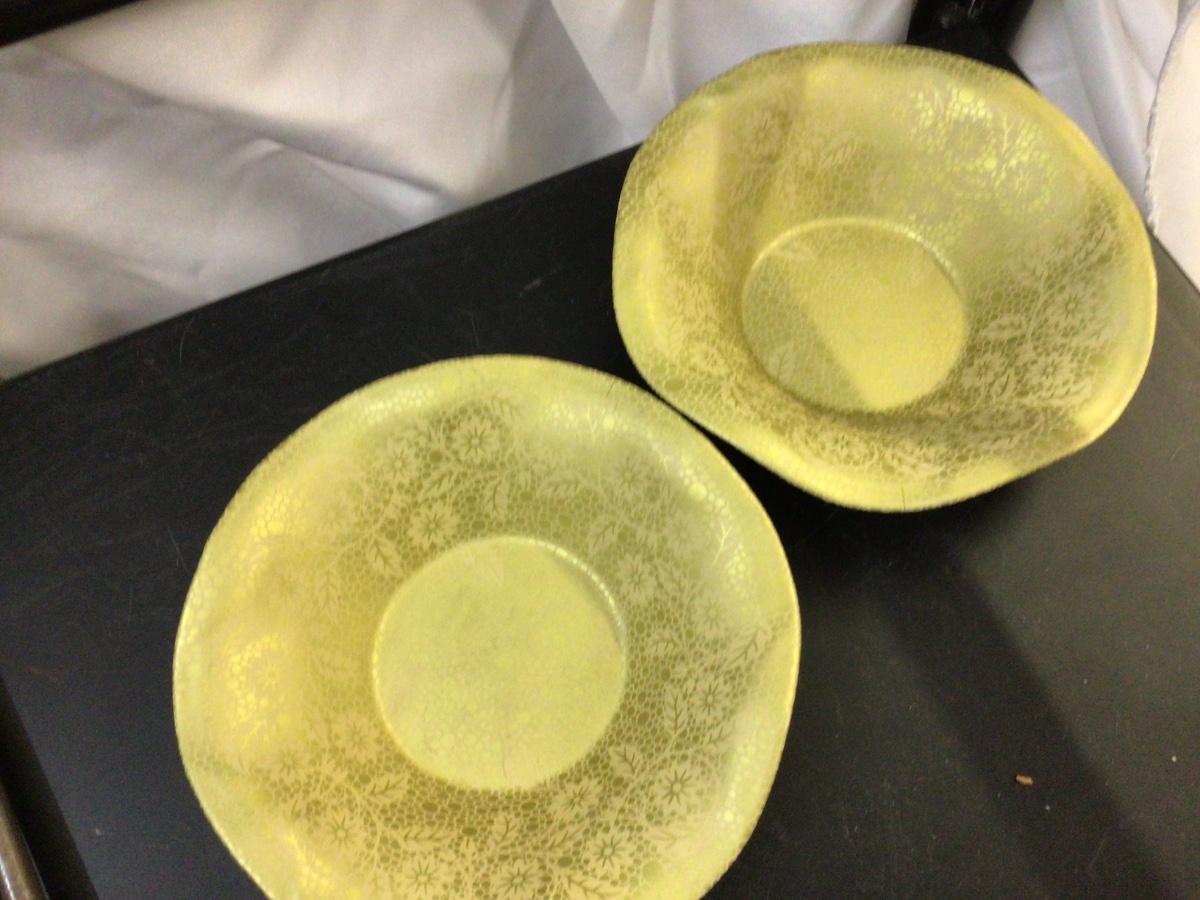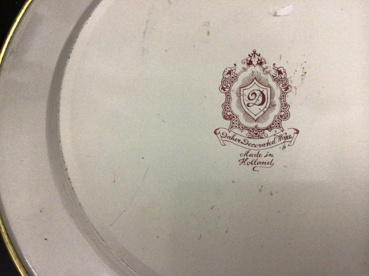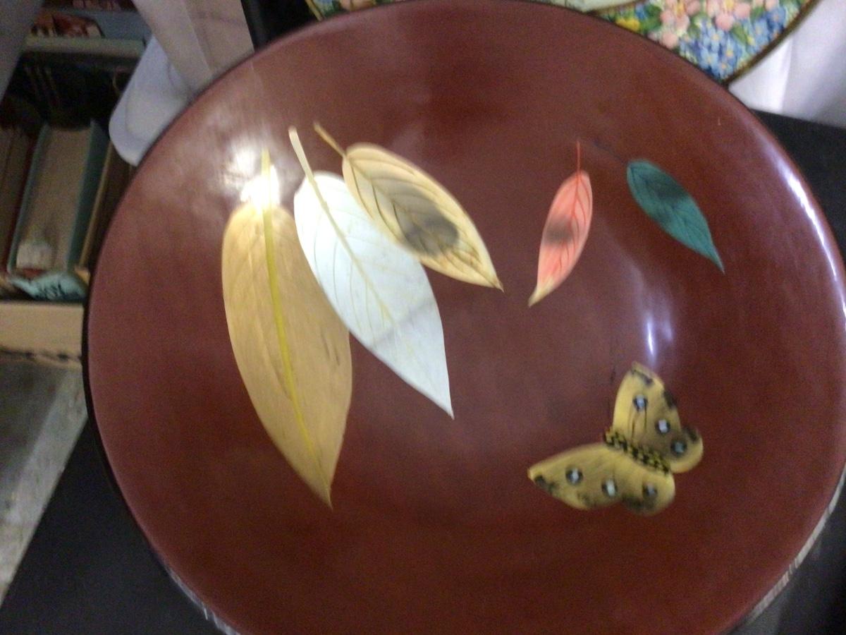 You get two metal bird plates made in Holland, plastic butterfly and leaves bowl, carving untensils, and several decorative smaller bowls.