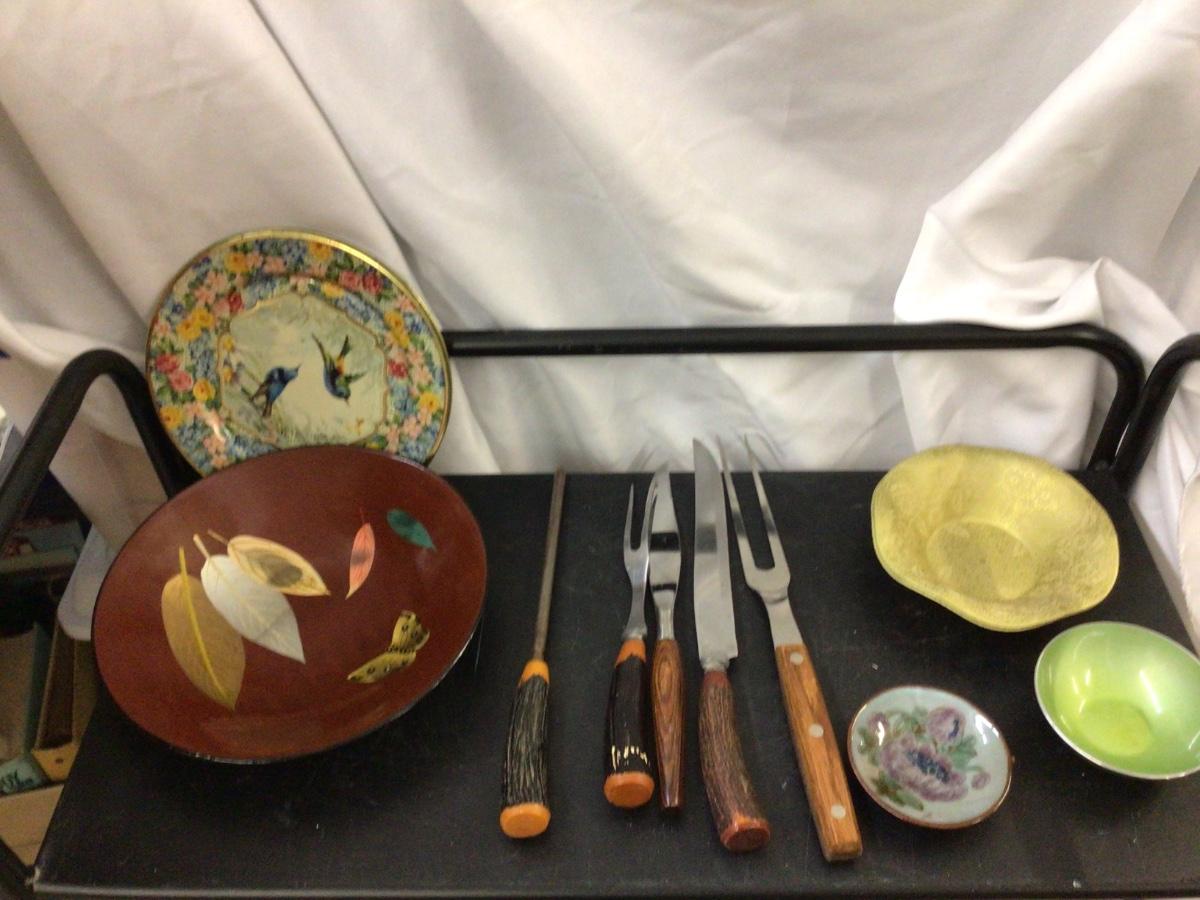 Metal Bird Plates, Carving Untensils, Metal Bowls, Decorative Bowls Lot