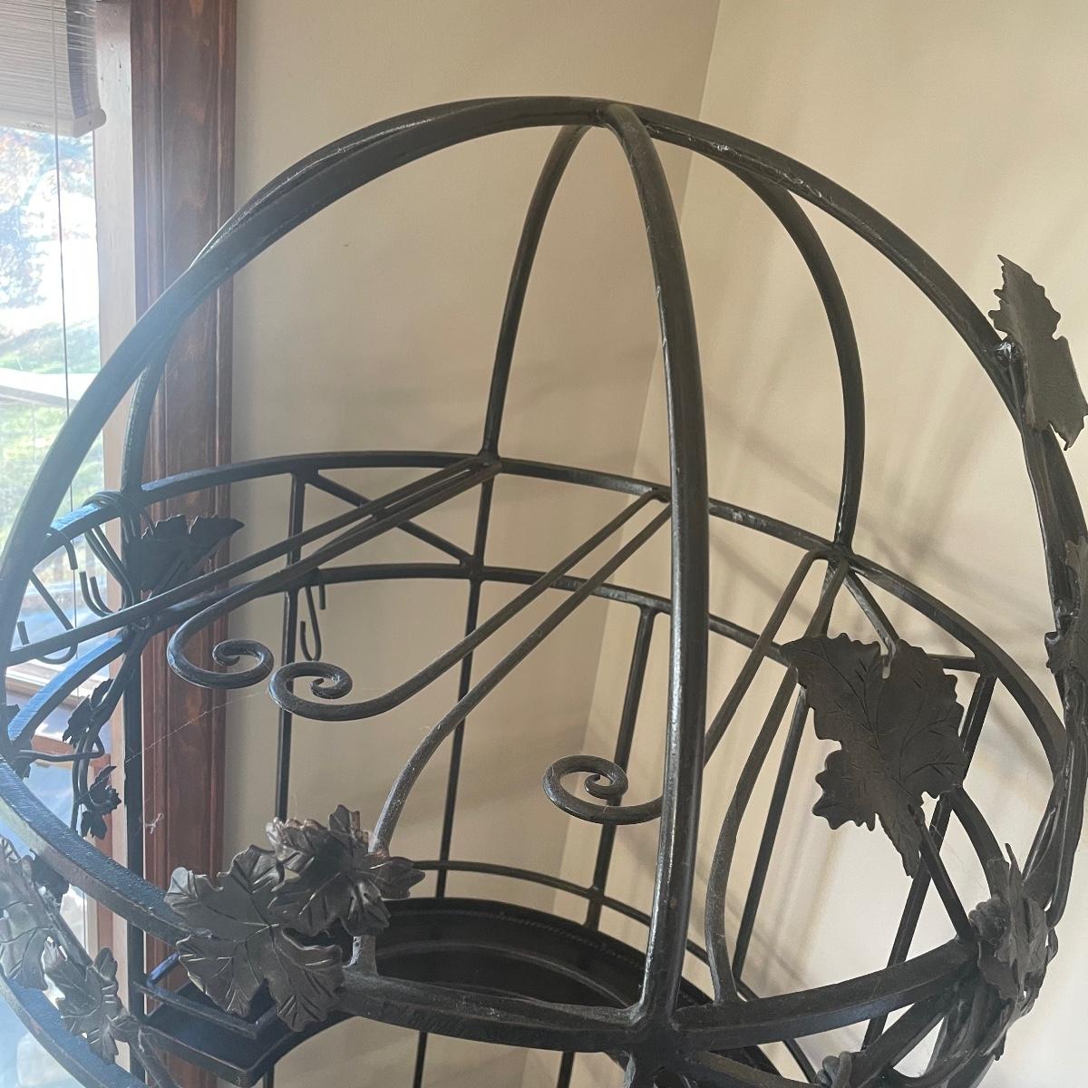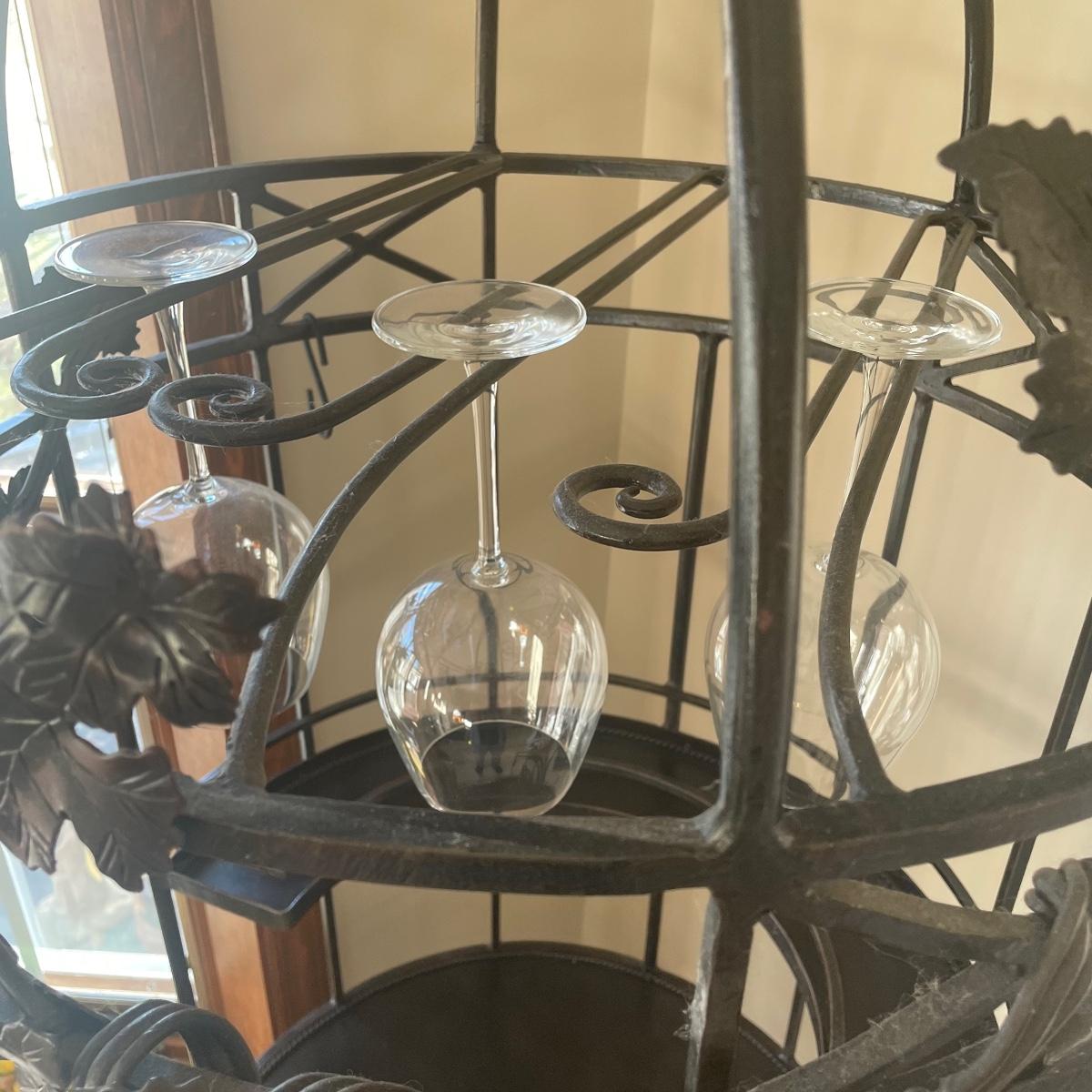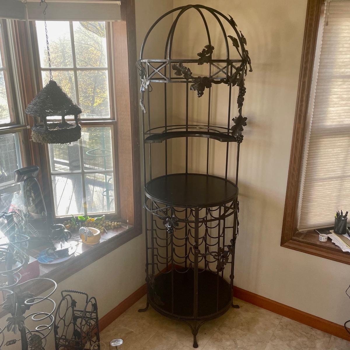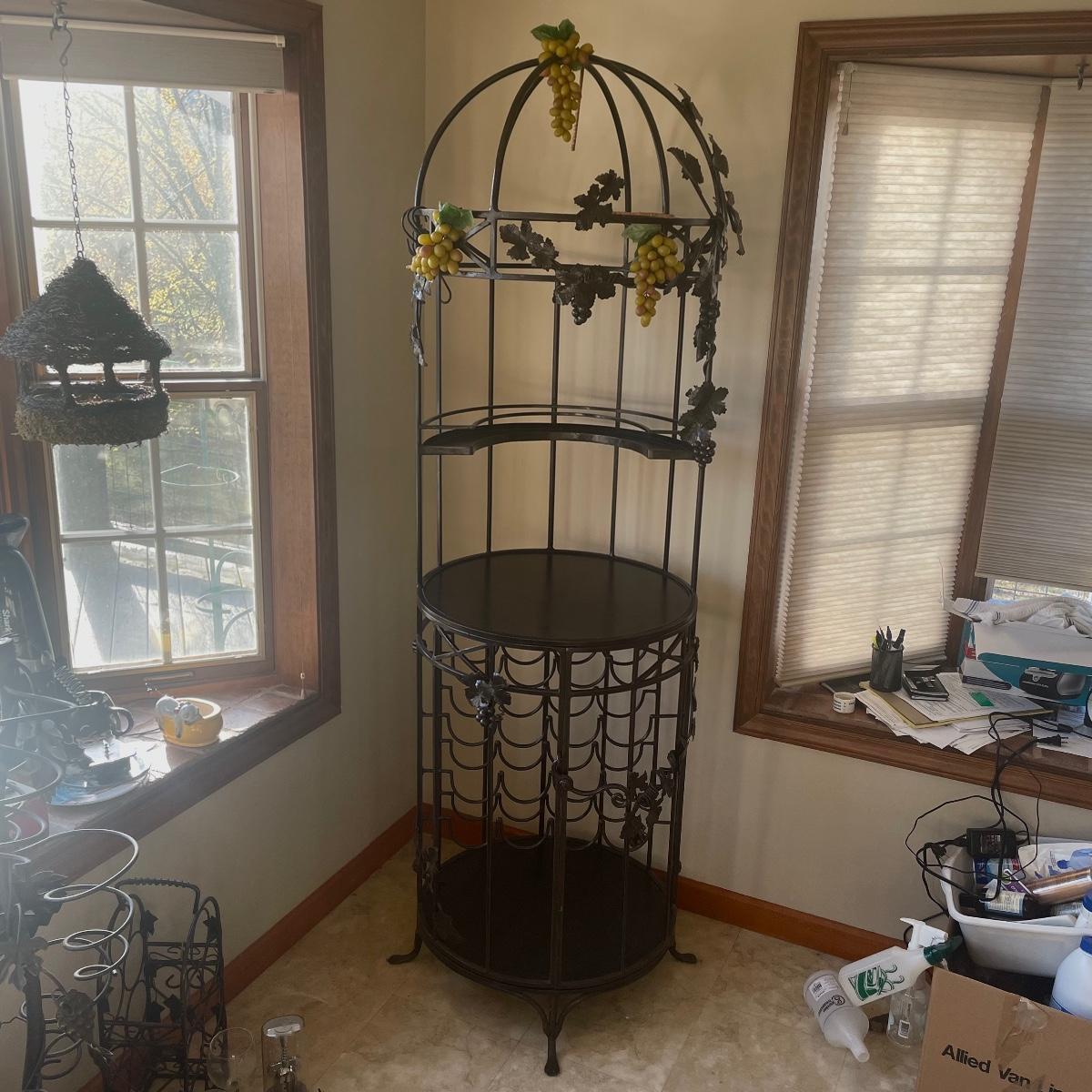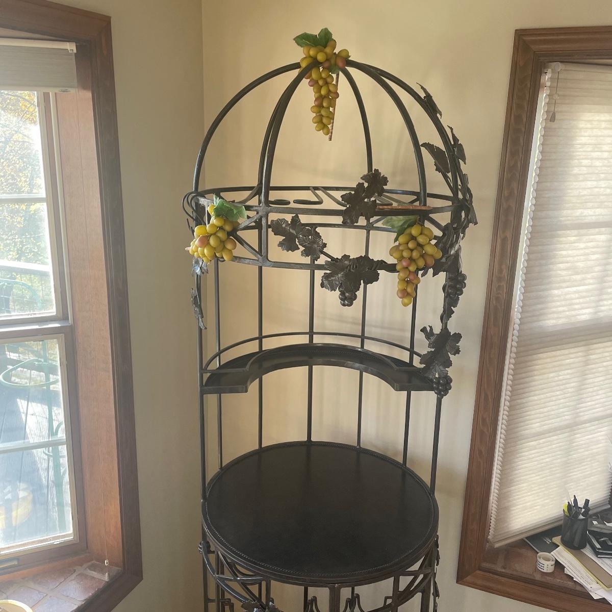 This stylish metal birdcage style wine rack/bar holds sixteen wine bottles in the lower section and has plenty of space to set bottles on the middle shelf. The upper section has more room for bottles and a place to hang wine glasses in the top (glasses and wine bottles not included). Made of metal it has lots of metal grape leaves/fruit metal embellishments. Comes with three faux bunches of grapes.