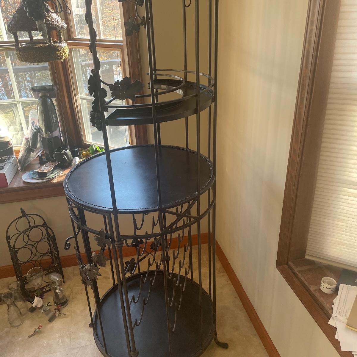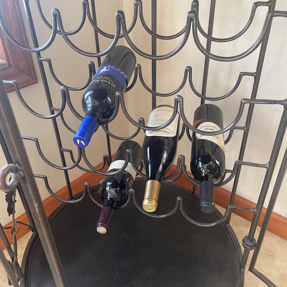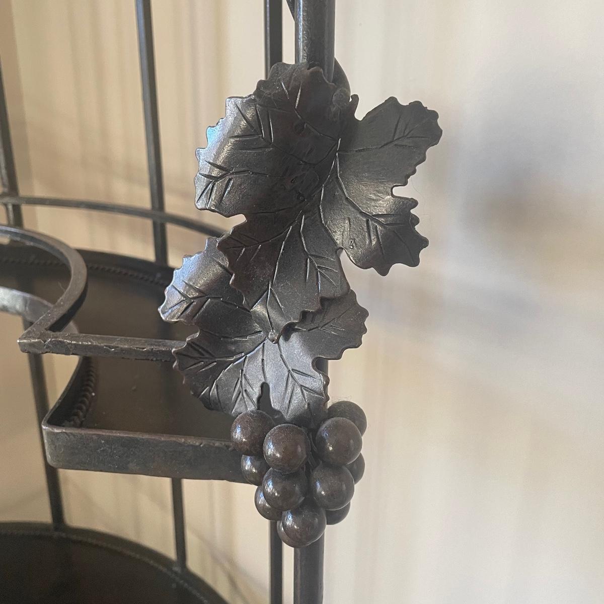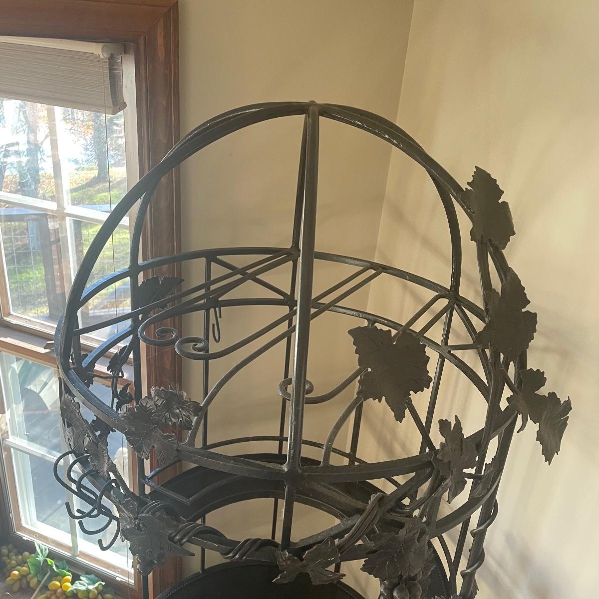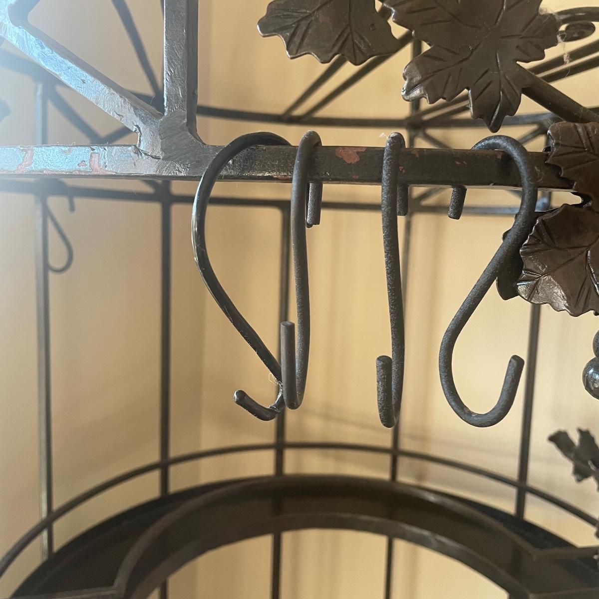 This stylish metal birdcage style wine rack/bar holds sixteen wine bottles in the lower section and has plenty of space to set bottles on the middle shelf. The upper section has more room for bottles and a place to hang wine glasses in the top (glasses and wine bottles not included). Made of metal it has lots of metal grape leaves/fruit metal embellishments. Comes with three faux bunches of grapes.