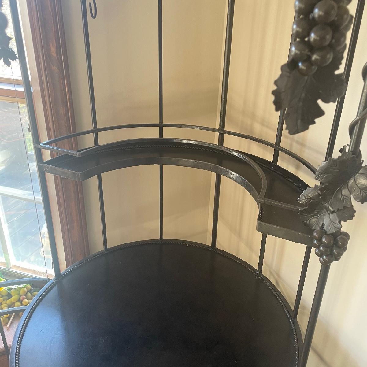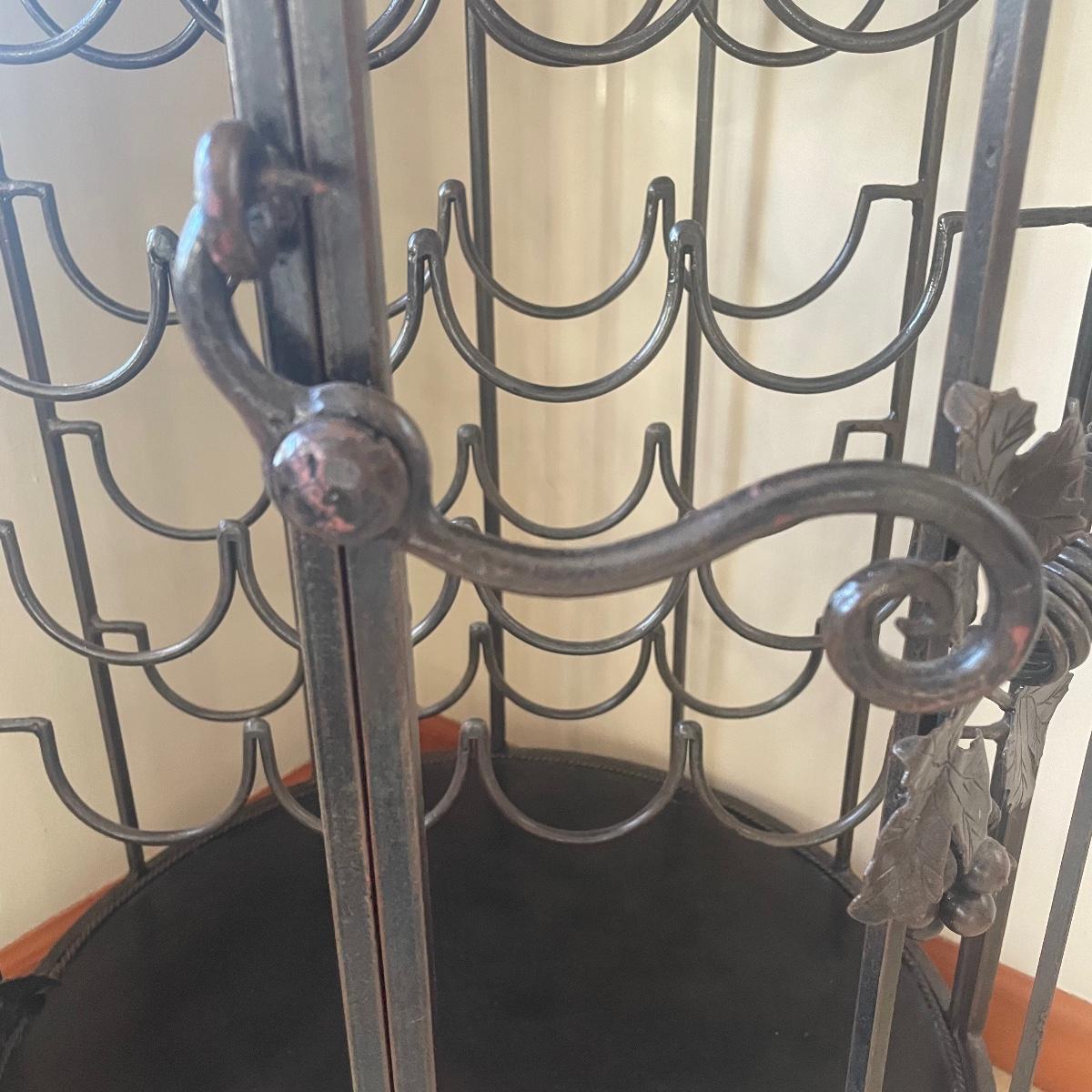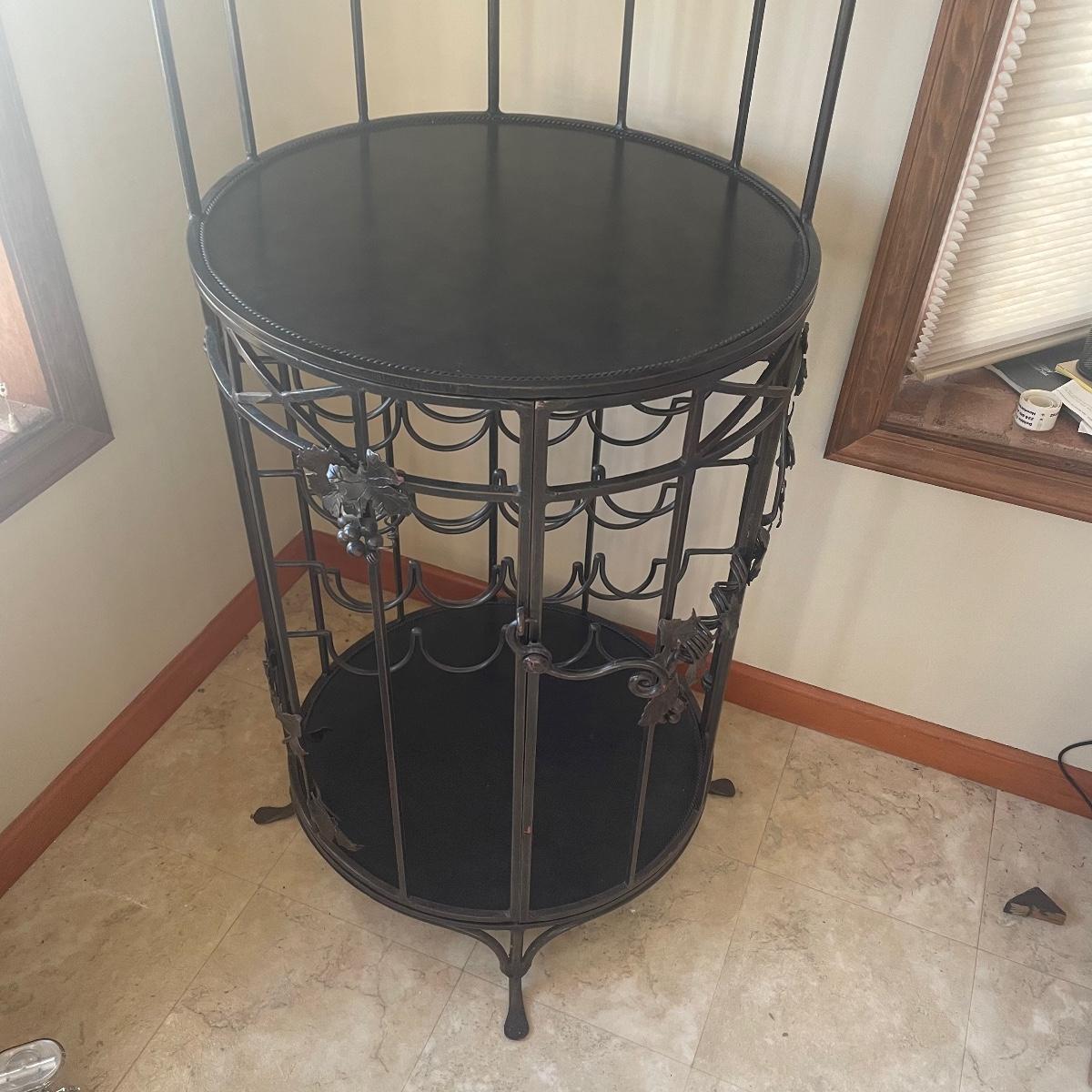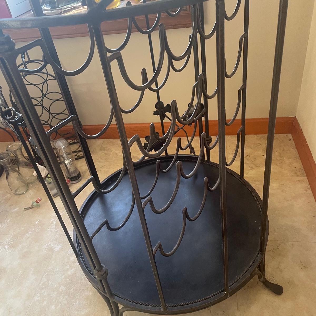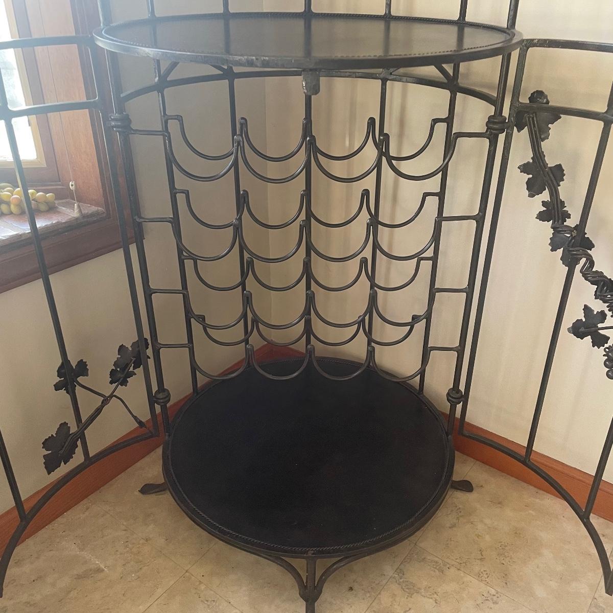 This stylish metal birdcage style wine rack/bar holds sixteen wine bottles in the lower section and has plenty of space to set bottles on the middle shelf. The upper section has more room for bottles and a place to hang wine glasses in the top (glasses and wine bottles not included). Made of metal it has lots of metal grape leaves/fruit metal embellishments. Comes with three faux bunches of grapes.