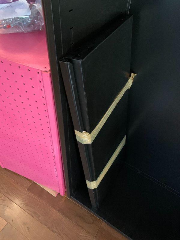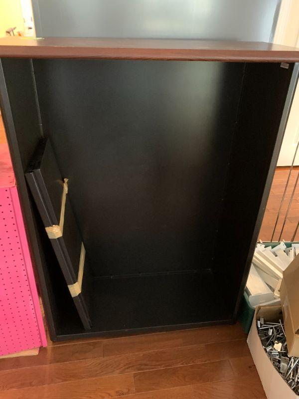Metal bookshelf with wood top. Contains two adjustable shelves, but no hardware for them. Has a small nick in on the back top corner.