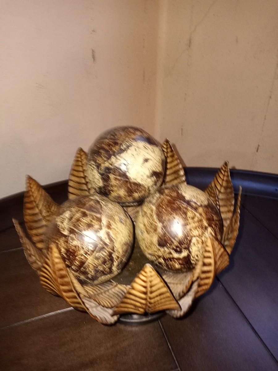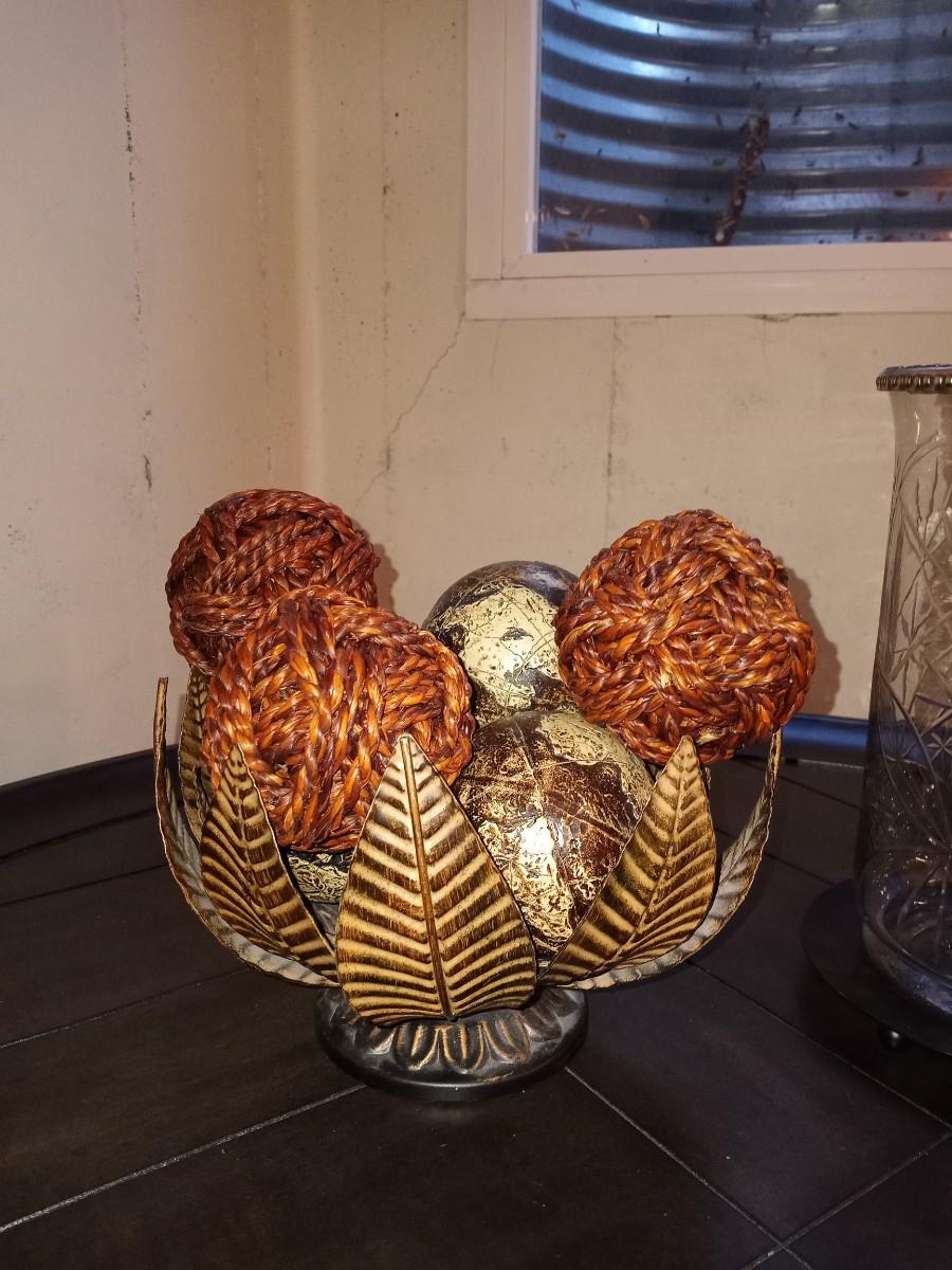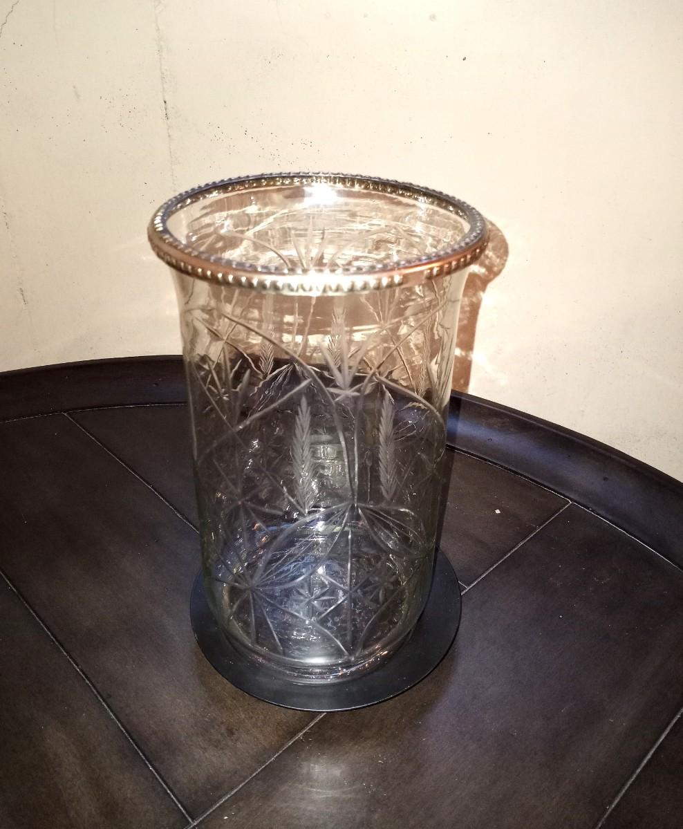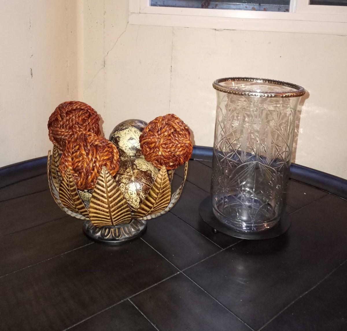 METAL BOWL WITH SPHERES AND ETCHED GLASS CANDLE HOLDER