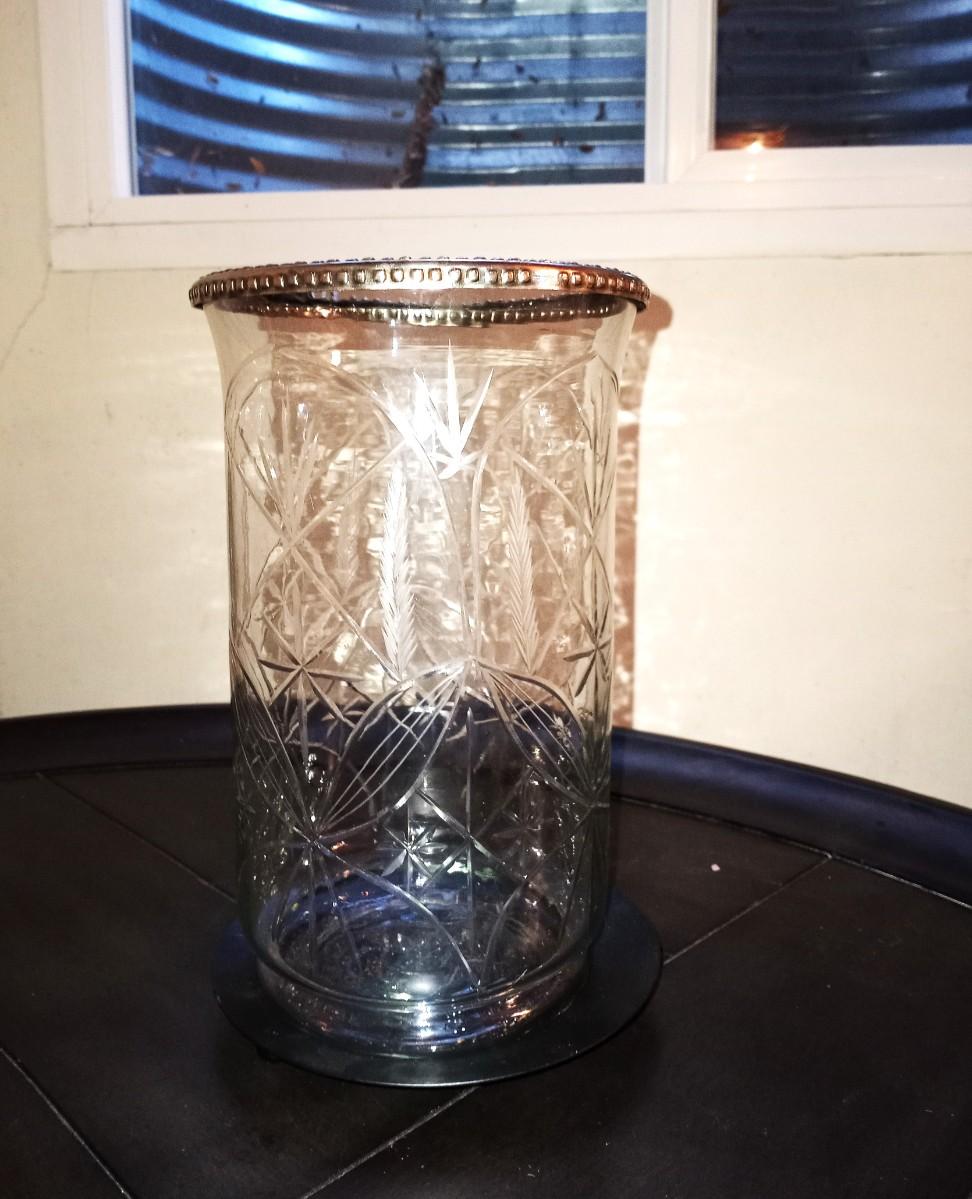 METAL BOWL APPROX, 10" WITH SPHERES AND ETCHED GLASS CANDLE HOLDER 12" TALL