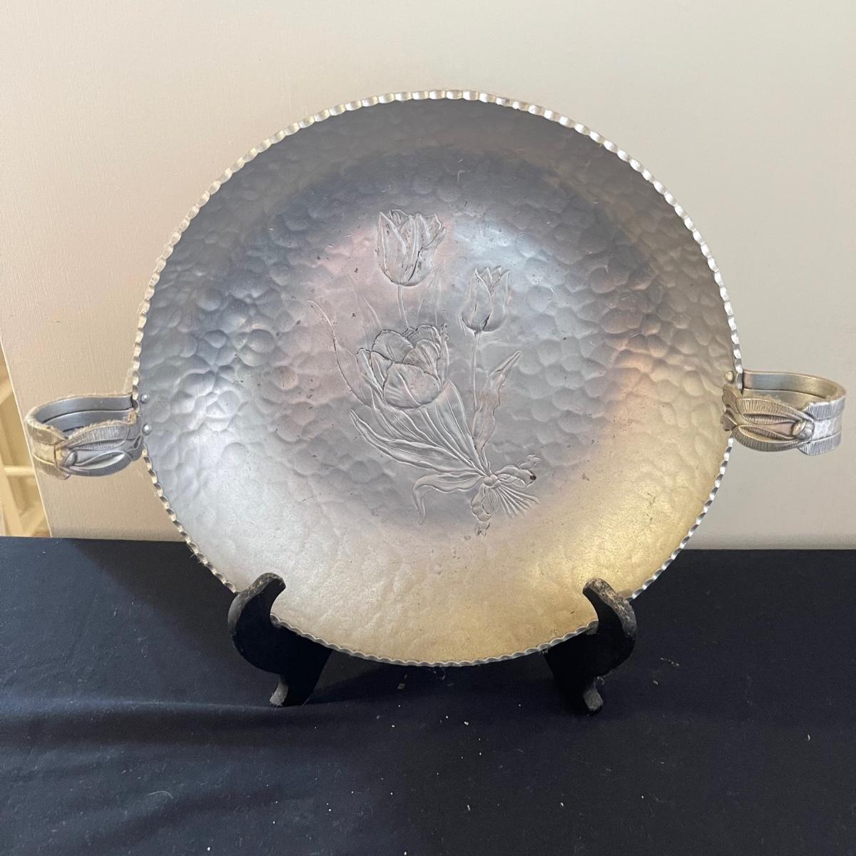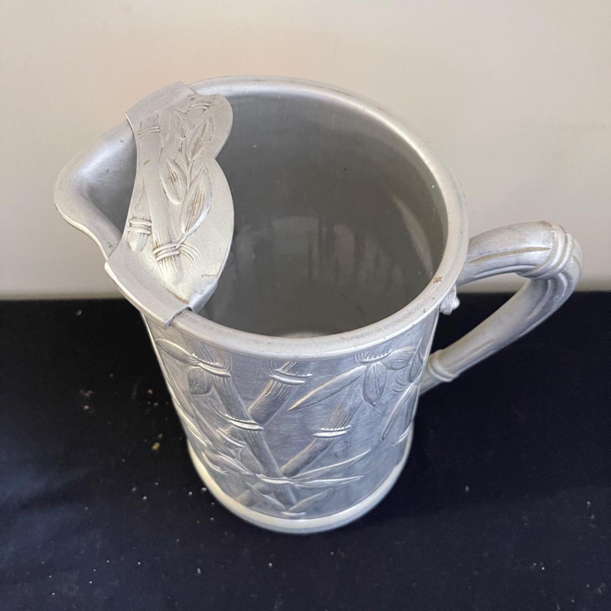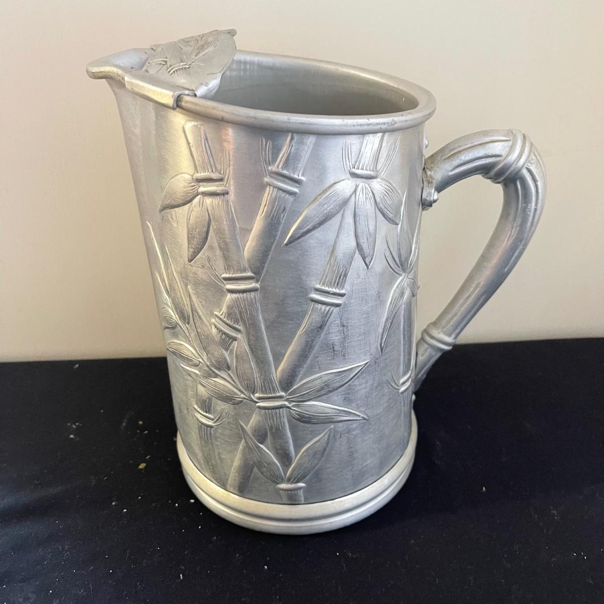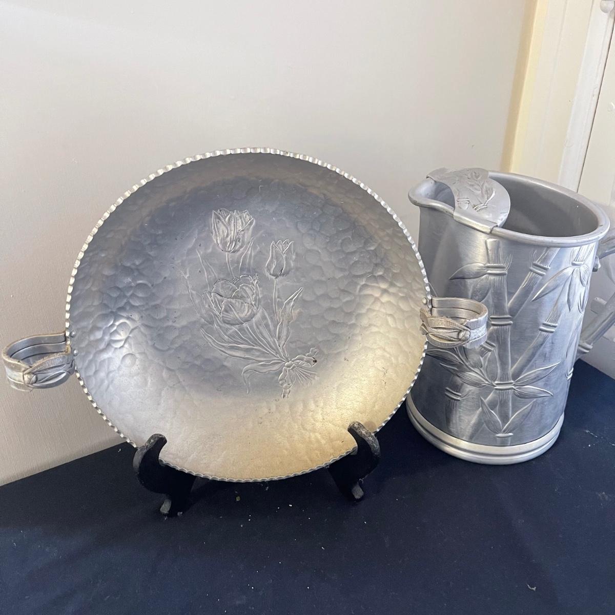 Forged Aluminum display plate and pitcher. The plate is a bit dirty and needs to be cleaned, the bottom has a inscription with Hand Wrought, Rodney, Sil, 422, and a small knight design. The pitcher has bamboo designs on it and says Everlast, forged aluminum, and B35 on the bottom.