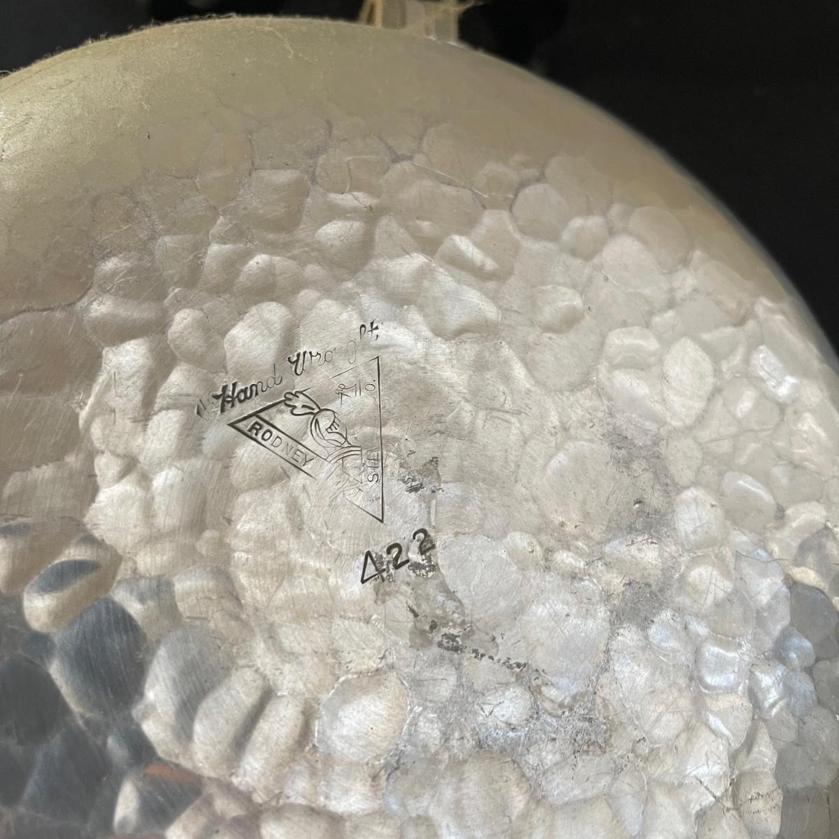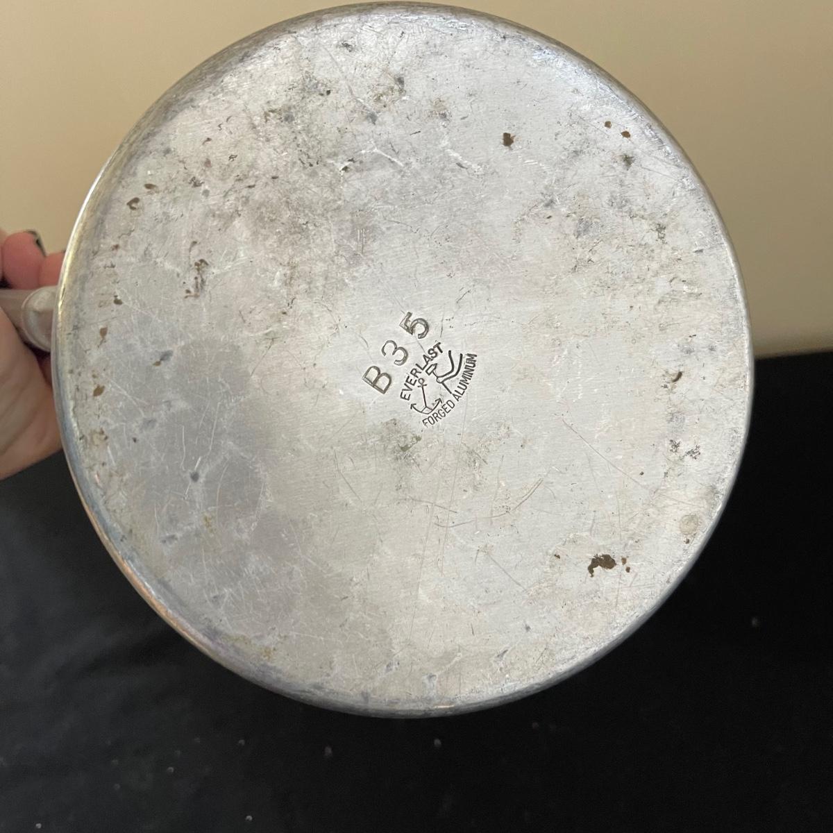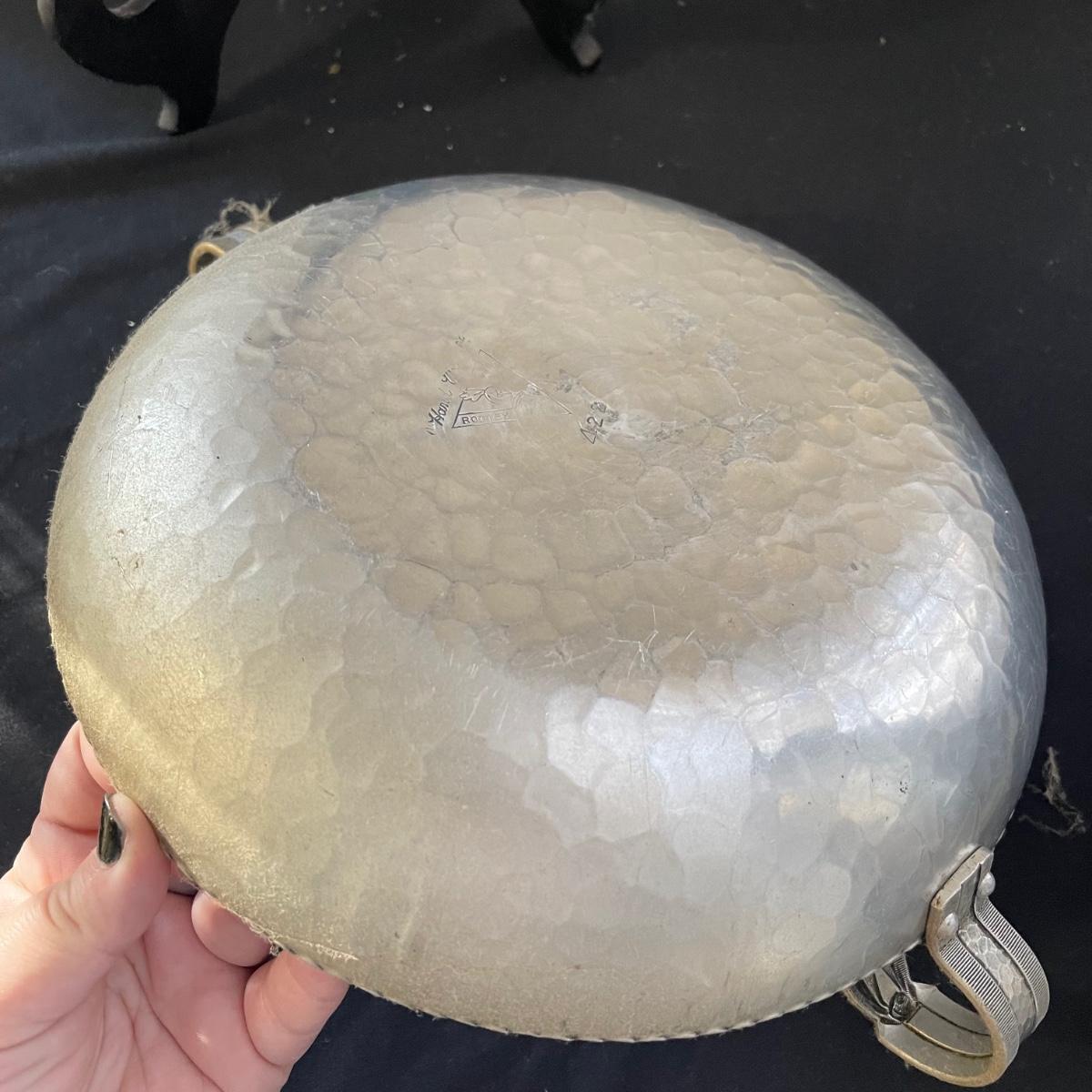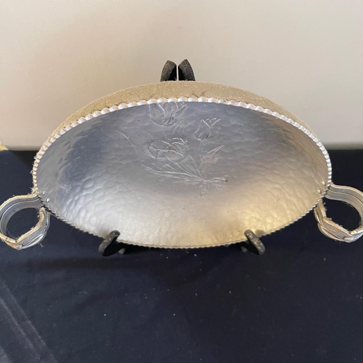 Forged Aluminum display plate and pitcher. The plate is a bit dirty and needs to be cleaned, the bottom has a inscription with Hand Wrought, Rodney, Sil, 422, and a small knight design. The pitcher has bamboo designs on it and says Everlast, forged aluminum, and B35 on the bottom.