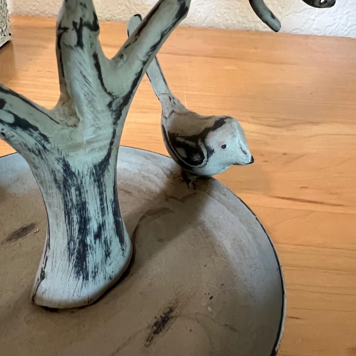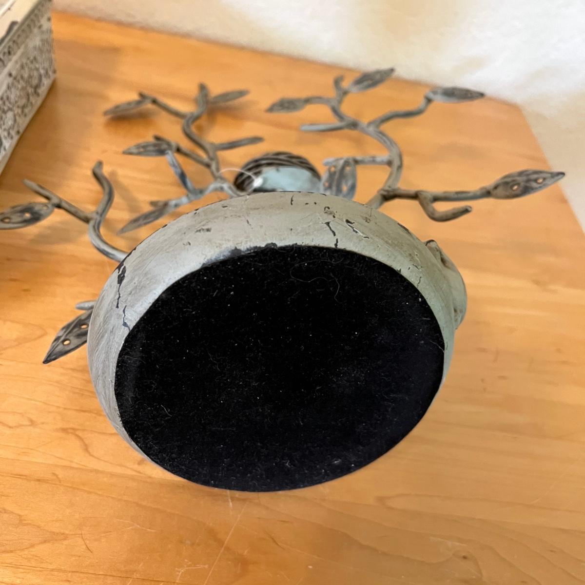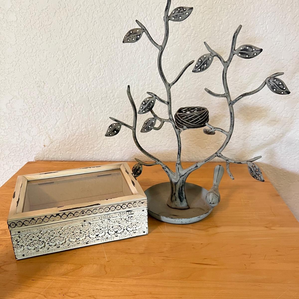 These two distressed metal items includes a cream colored metal trinket box with glass top and a bird themed jewelry stand/holder that measures 5.5” D x 15” H.